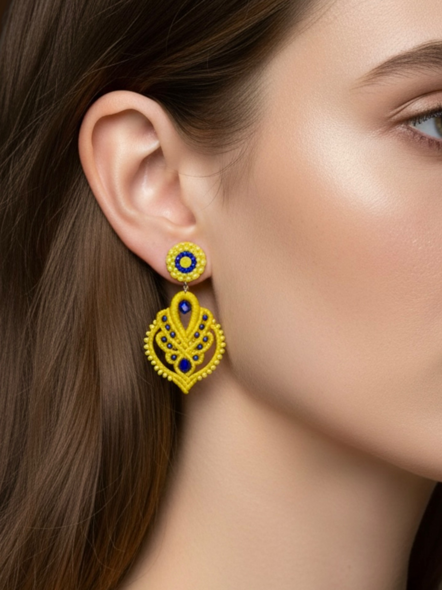 Material: Edelstahl, Silikon-Ohrringverschlüsse (10 mm Ø), Facettierte Glasperlen, Natursteinperlen, Miyuki /Toho Perlen, Gewachstes Garn, Strasssteine
