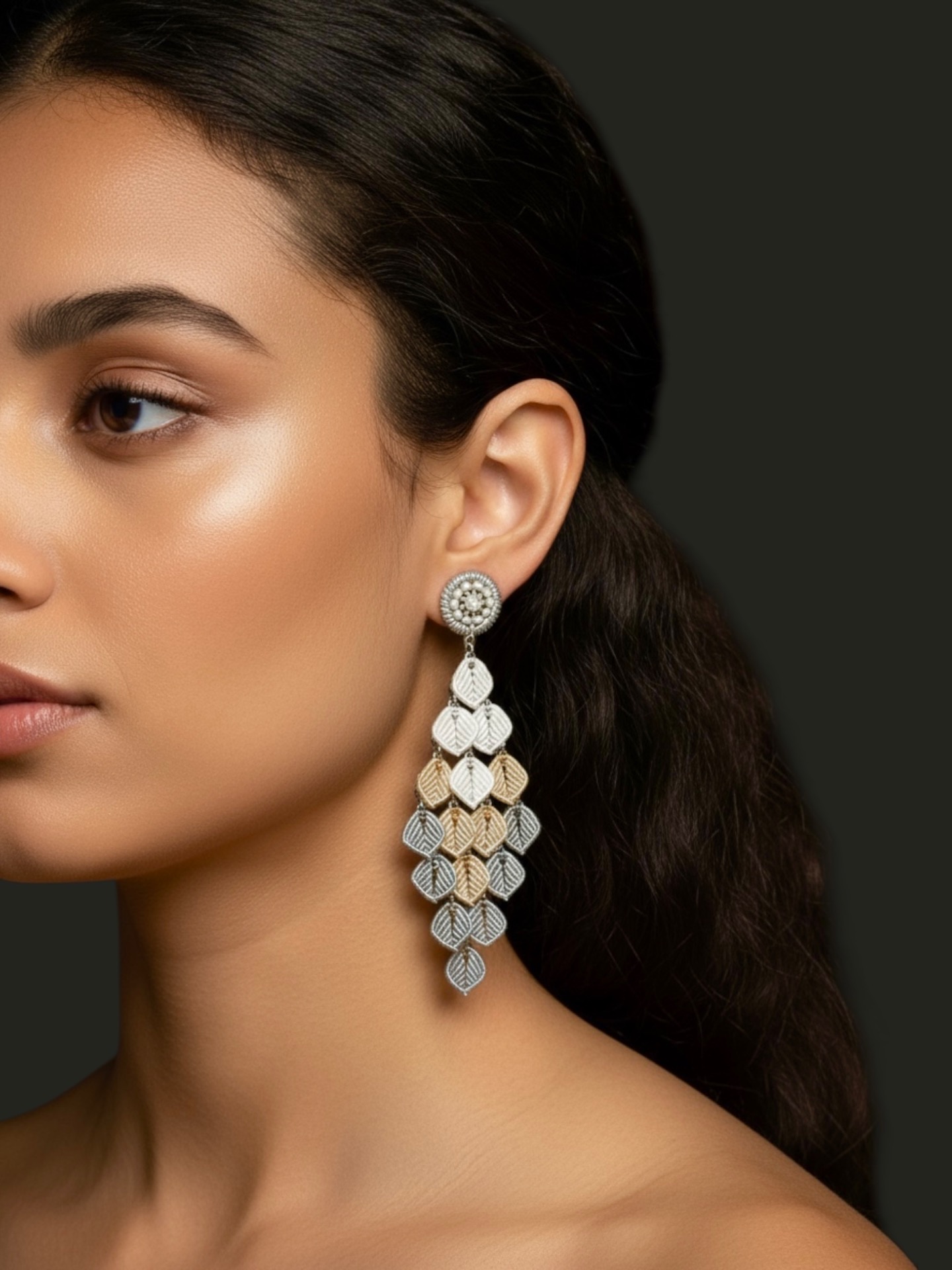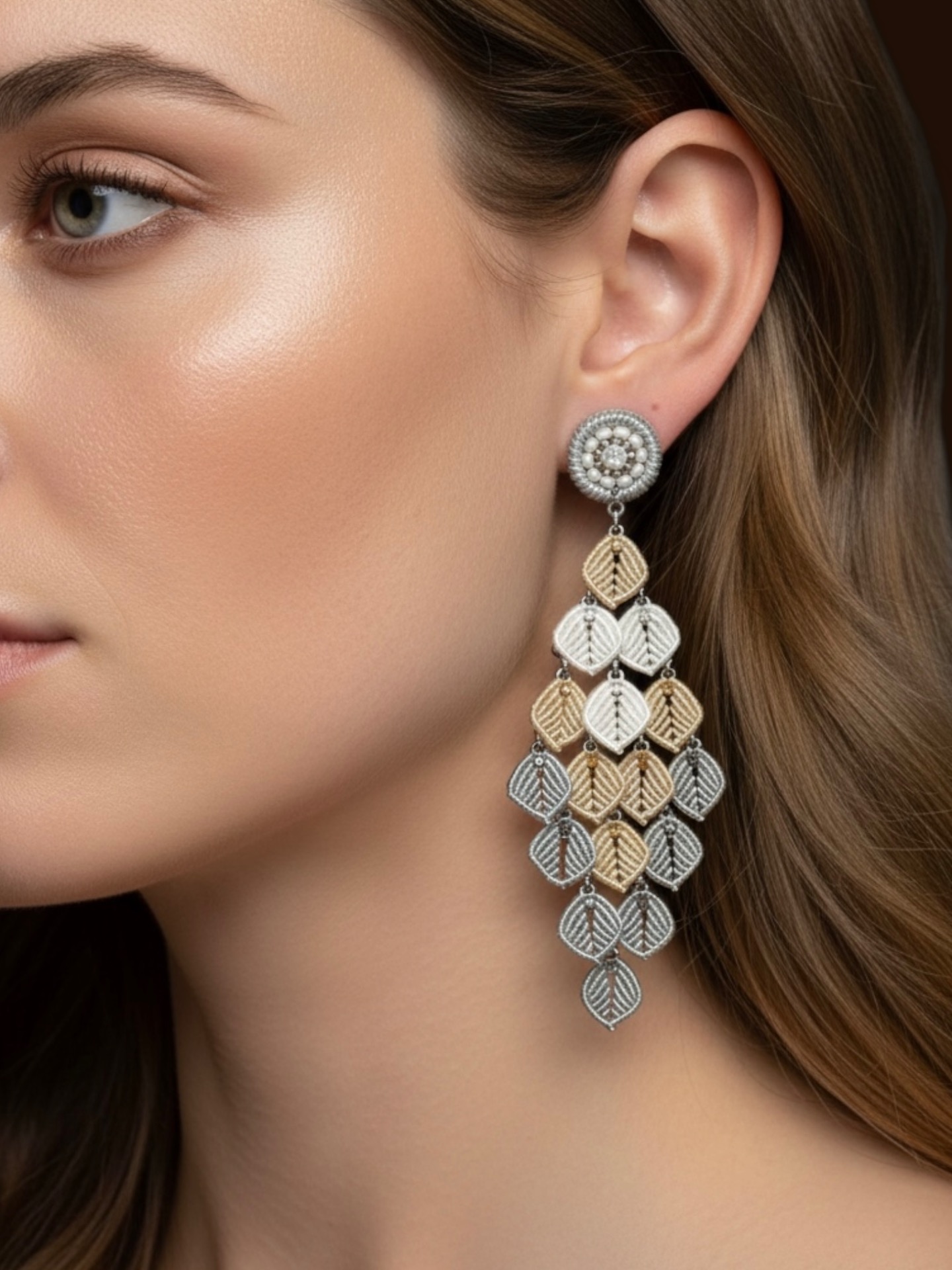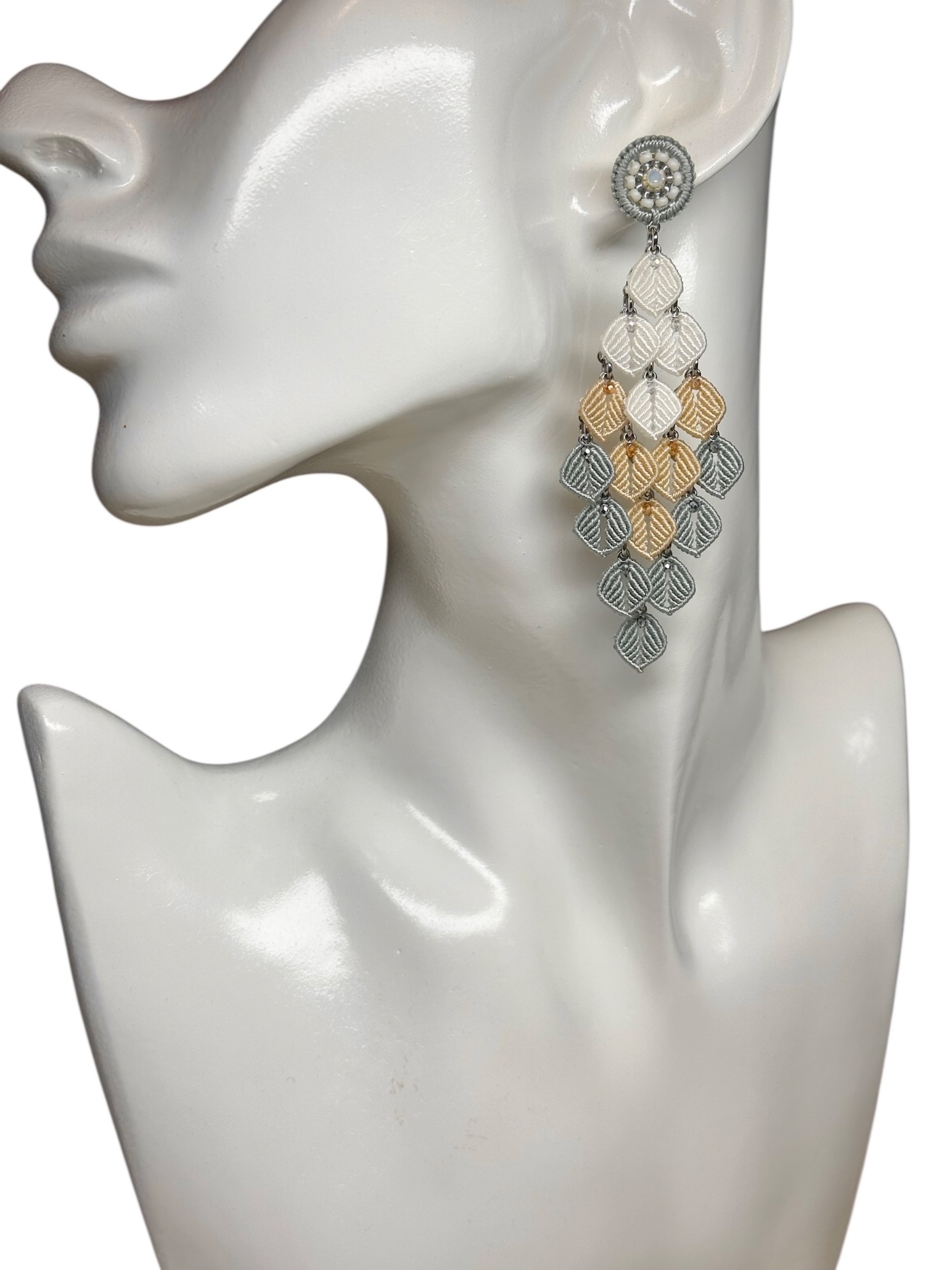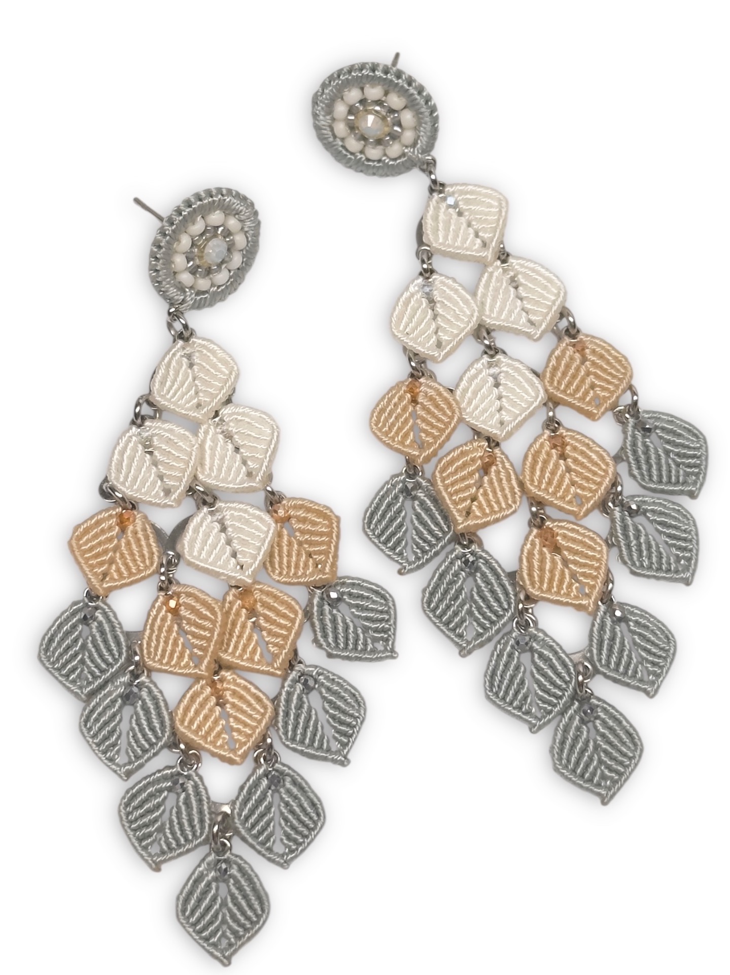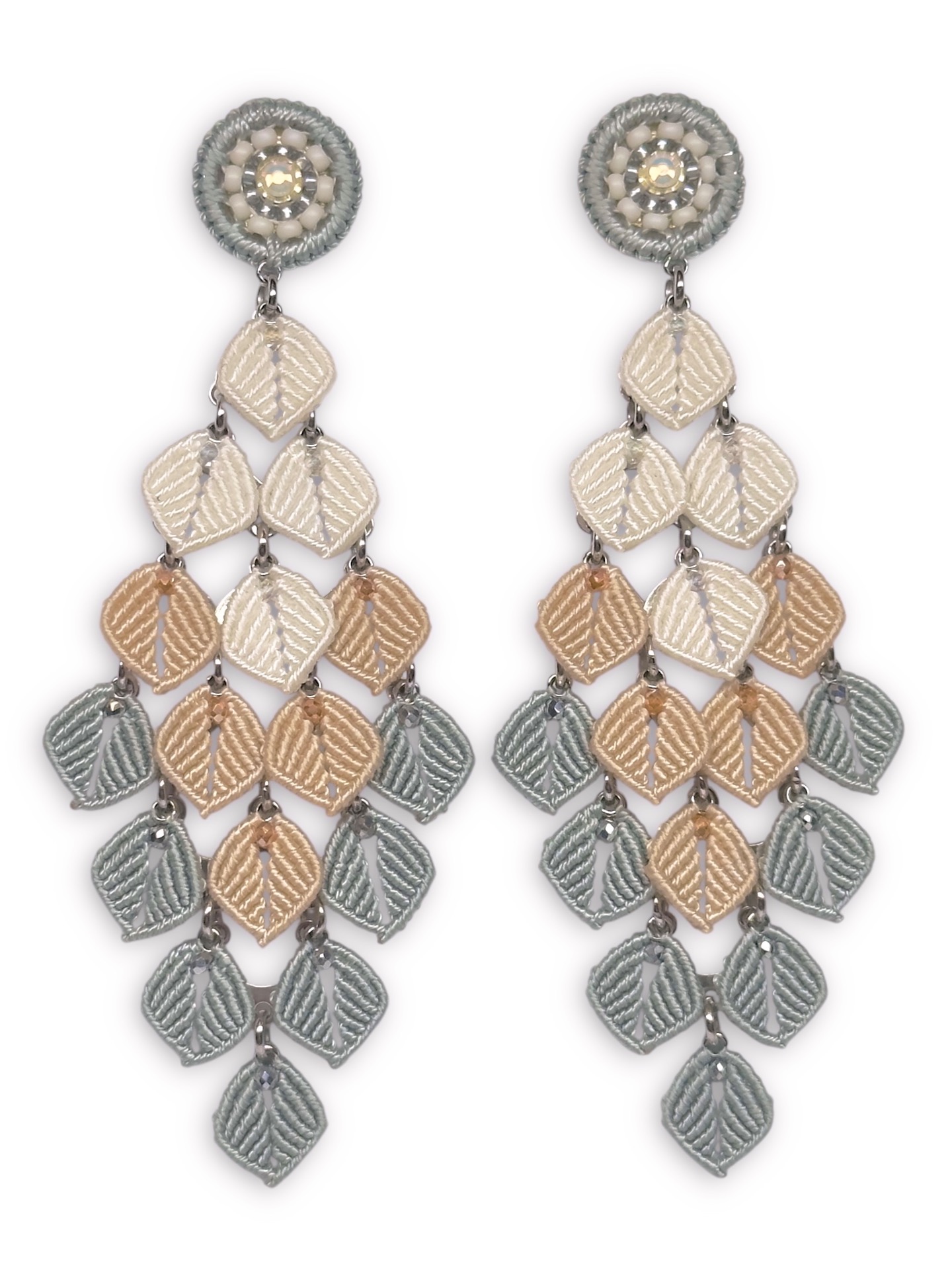 Material: Edelstahl, Silikon-Ohrringverschlüsse (10 mm Ø), Facettierte Glasperlen, Miyuki/Toho Perlen, Polyester Garn, Strasssteine