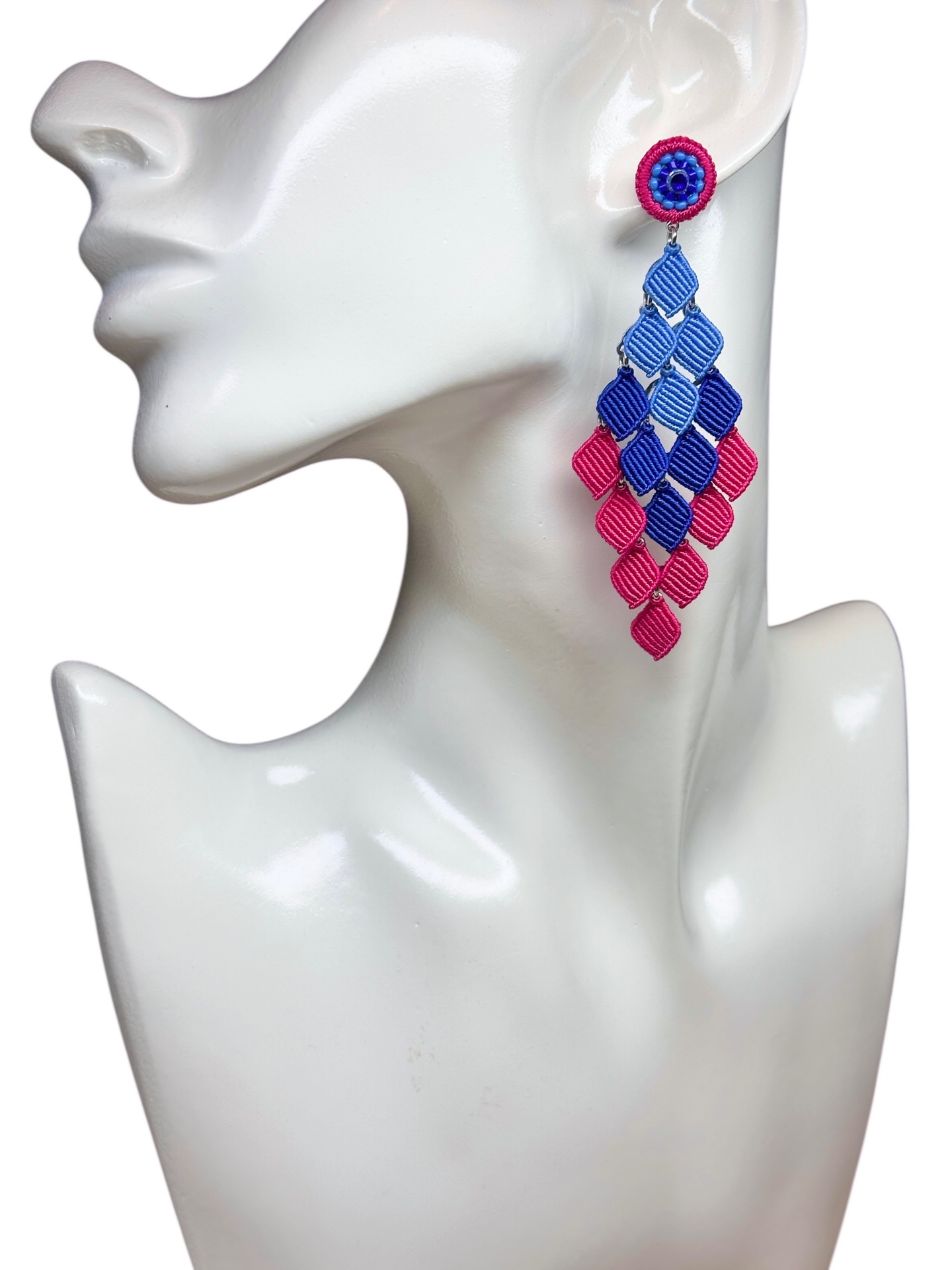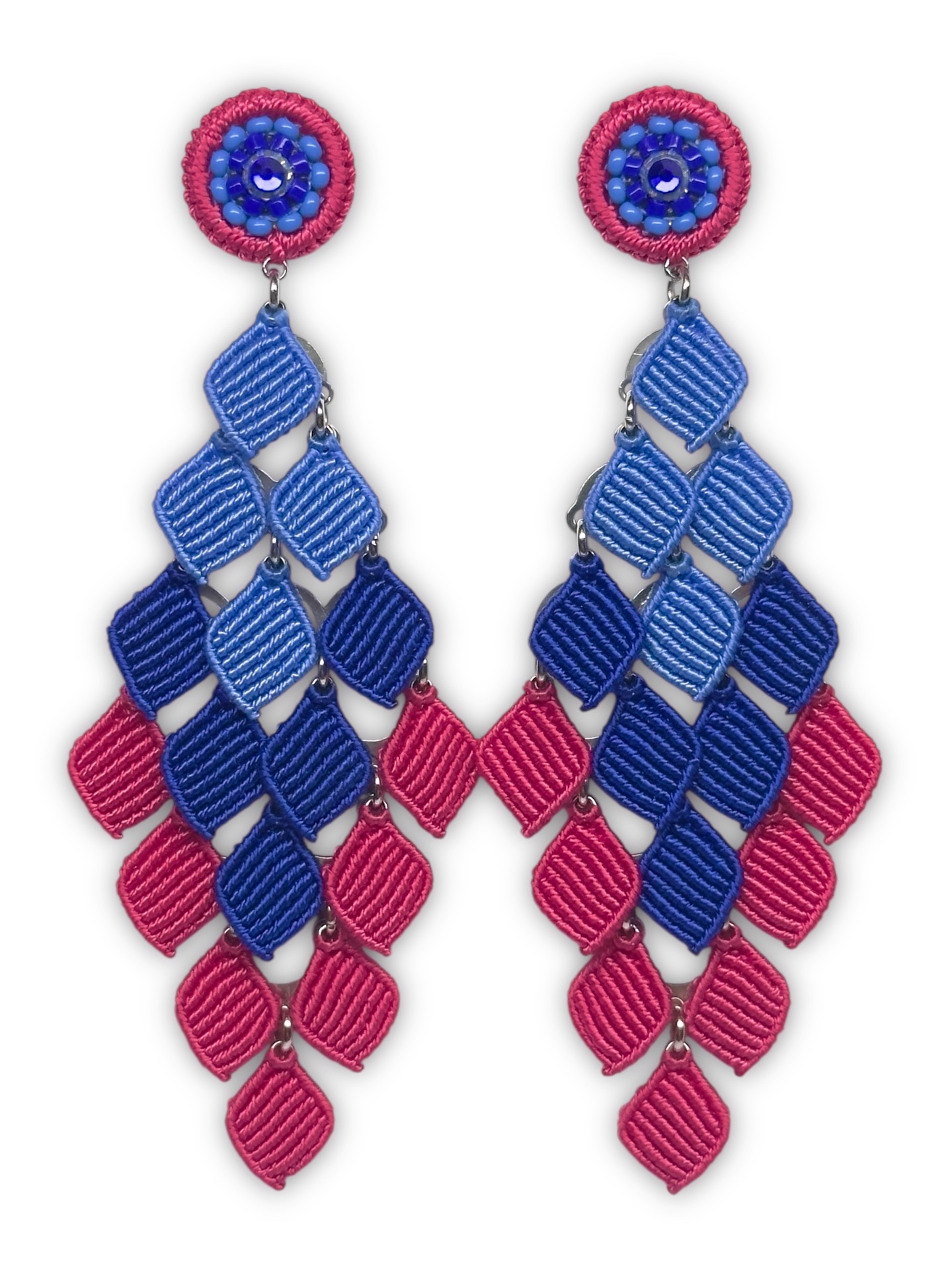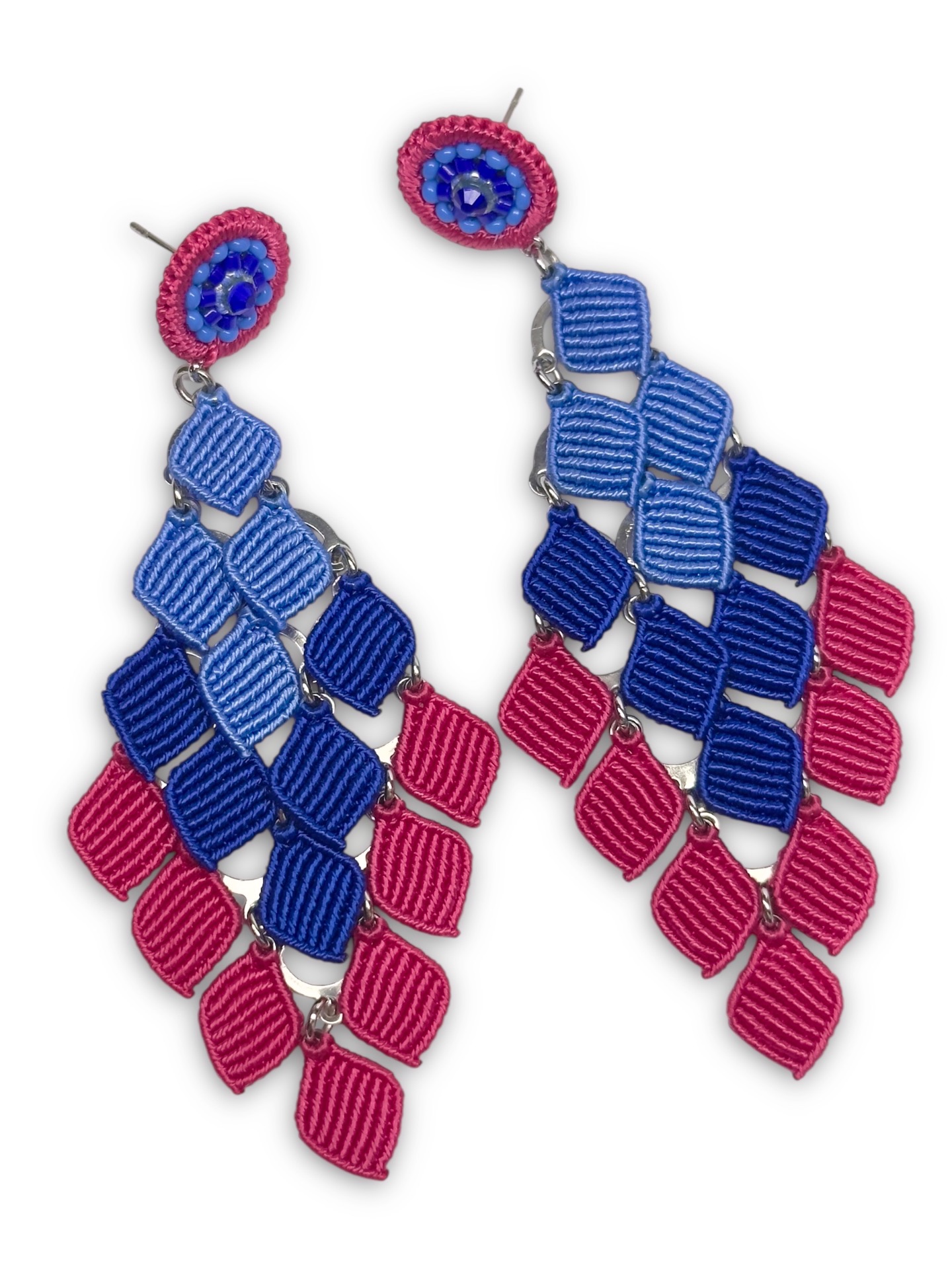 Material: Edelstahl, Silikon-Ohrringverschlüsse (10 mm Ø), Miyuki/Toho Perlen, Polyester Garn, Strasssteine