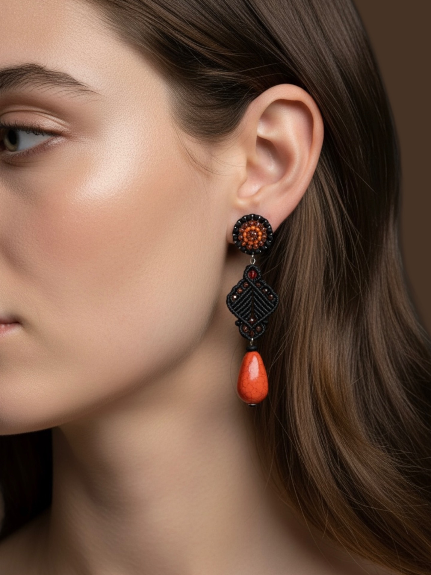 Material: Edelstahl, Silikon-Ohrringverschlüsse (10 mm Ø), Facettierte Glasperlen, Miyuki/Toho Perlen, Gewachstes Garn, Keramikperlen, Strasssteine