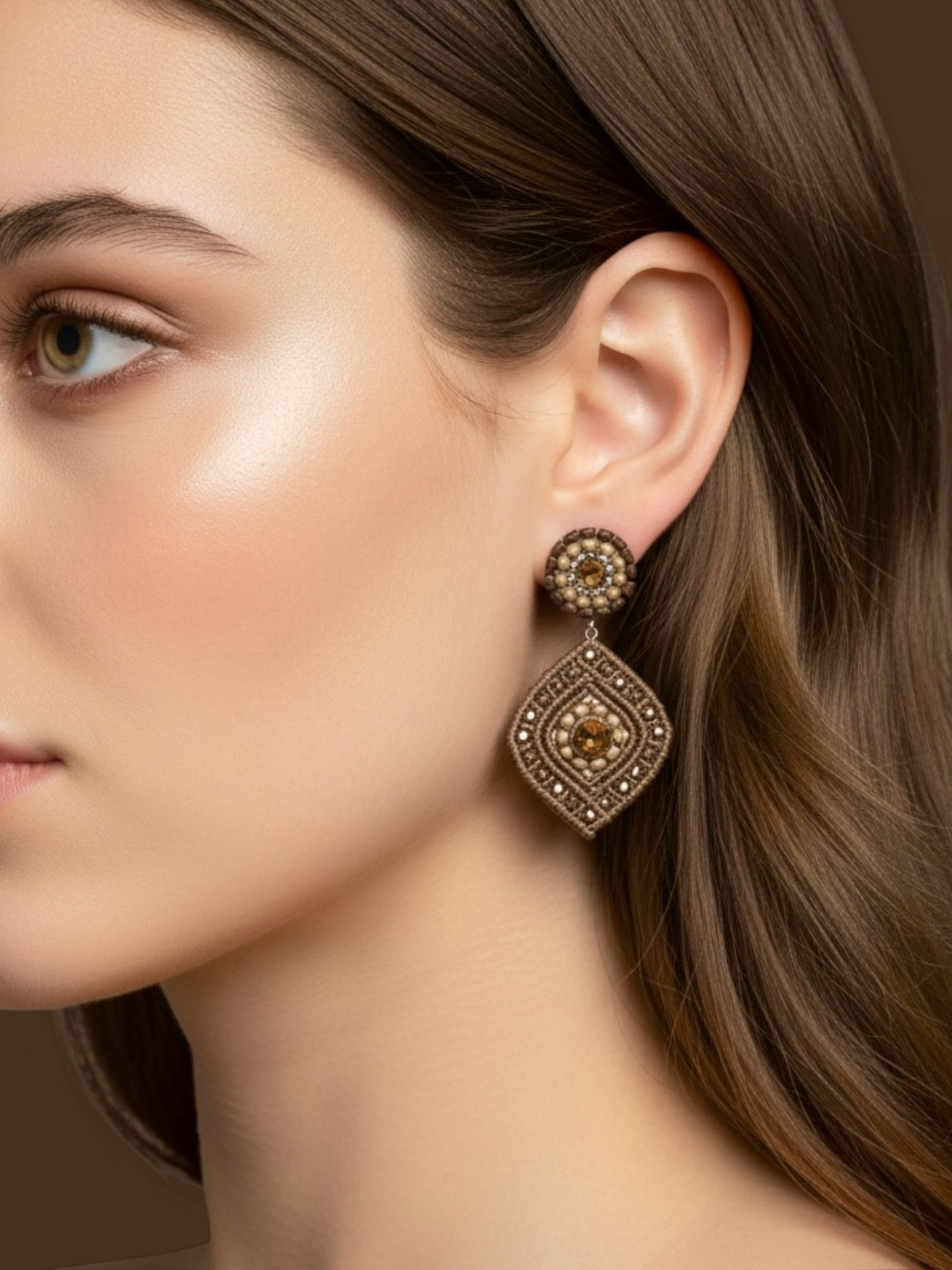 Material: Edelstahl, Silikon-Ohrringverschlüsse (10 mm Ø), Facettierte Glasperlen, Miyuki/Toho Perlen, Gewachstes Garn, Strasssteine