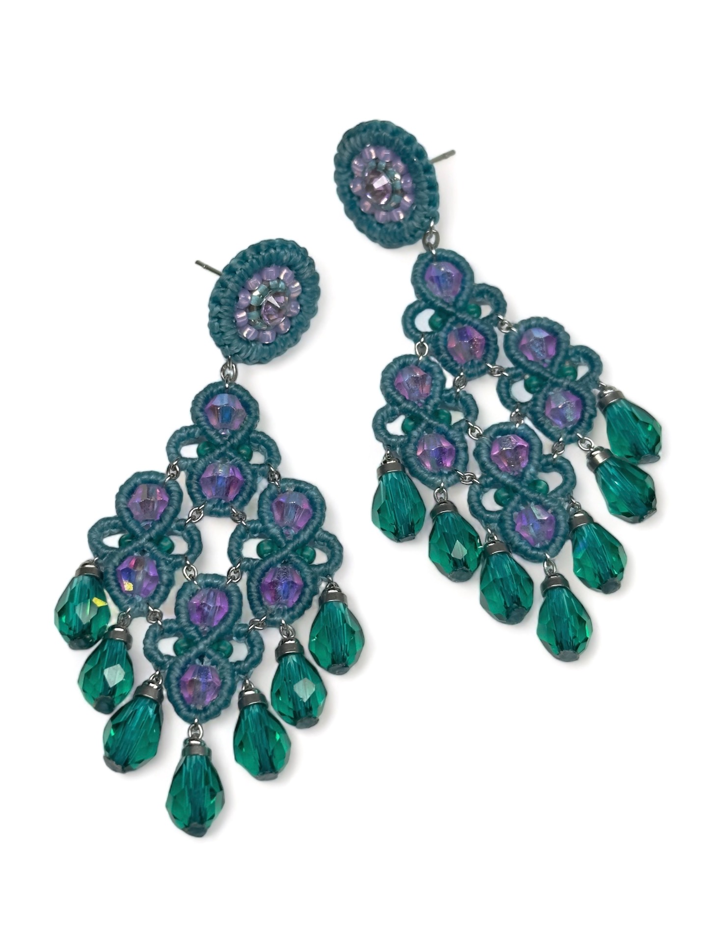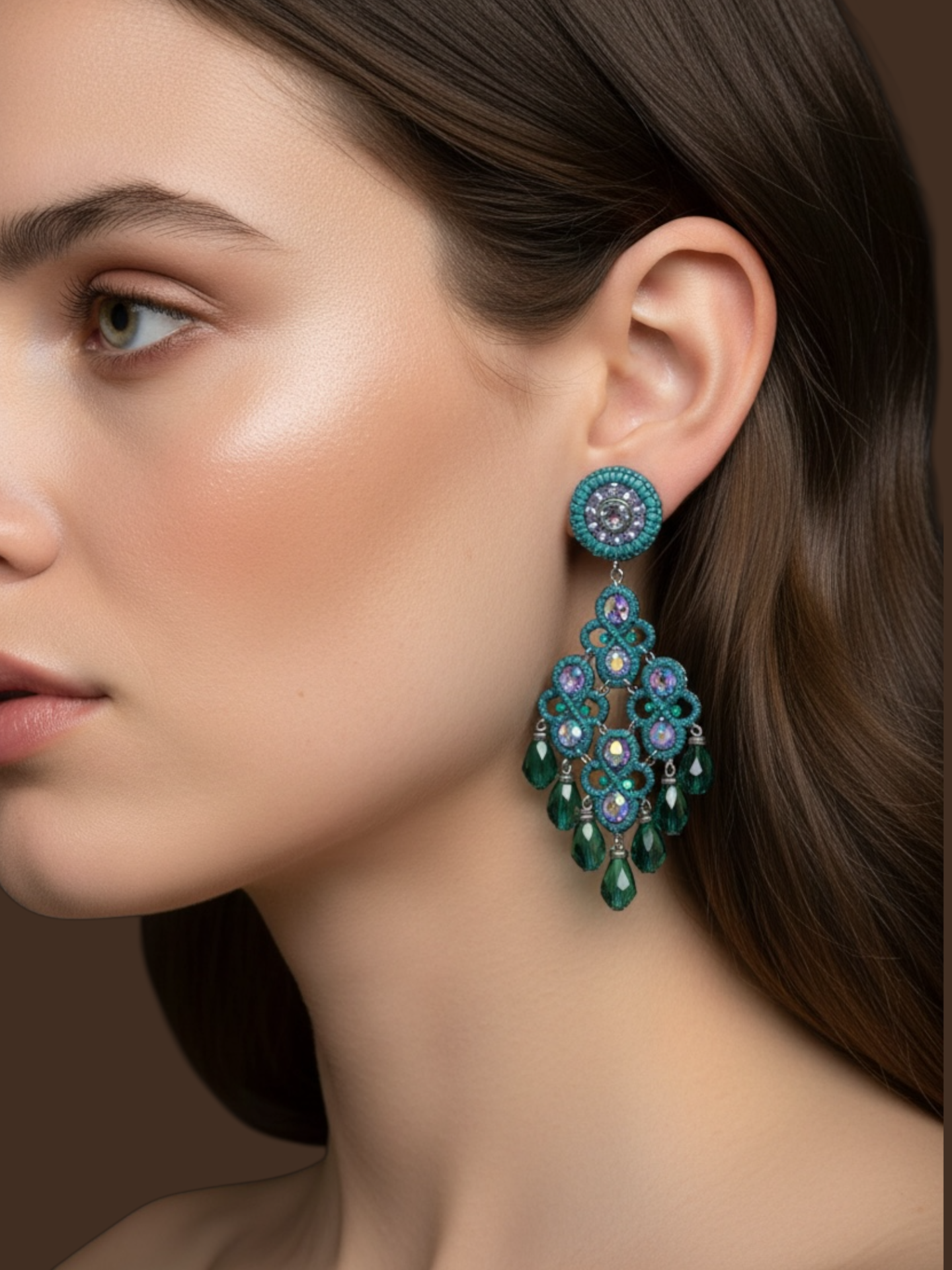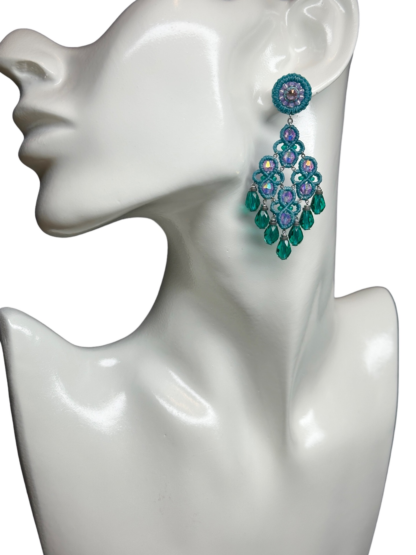 Material: Edelstahl, Silikon-Ohrringverschlüsse (10 mm Ø), Facettierte Glasperlen, Miyuki Perlen, Gewachstes Garn, Strasssteine
