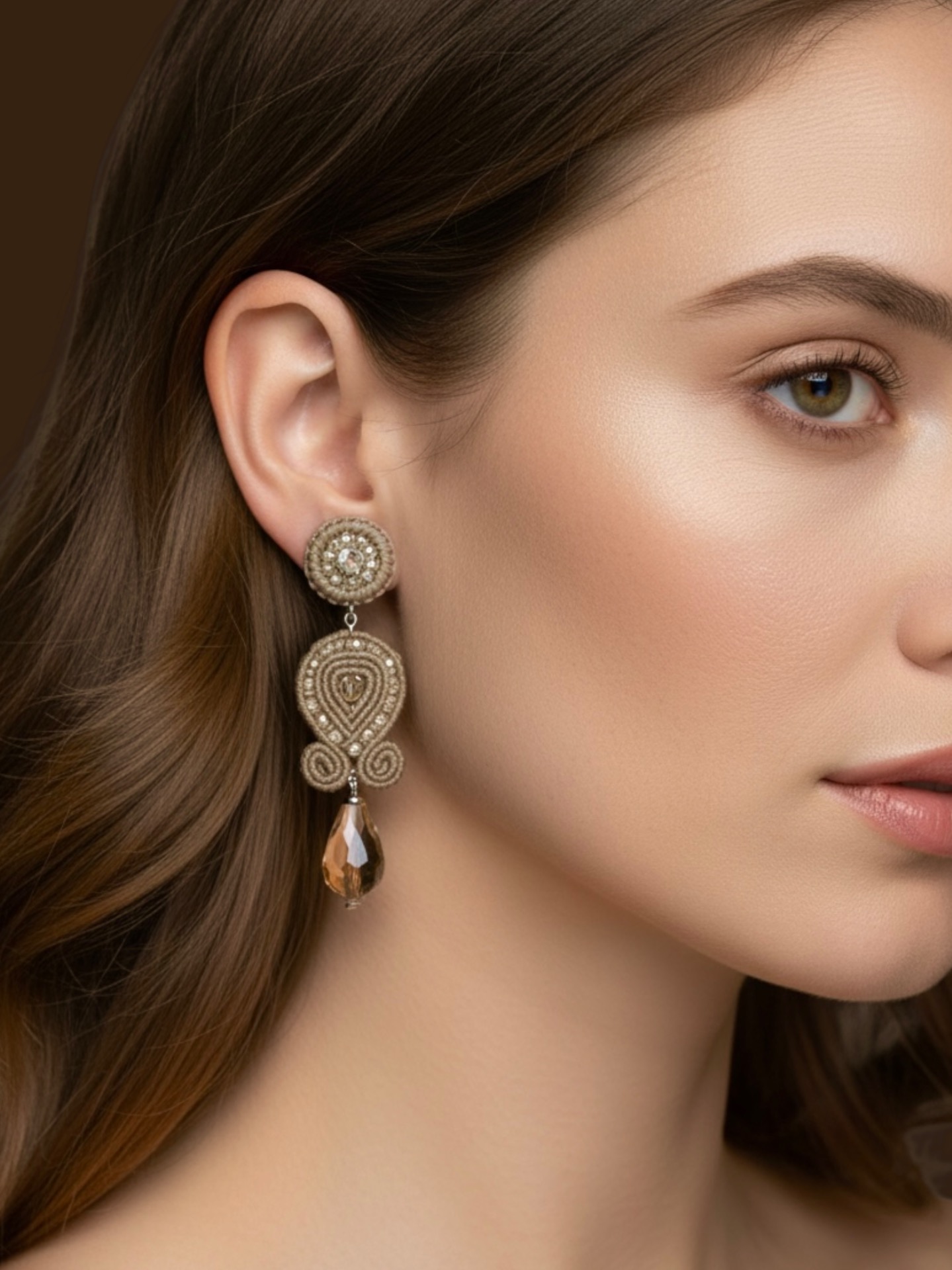 Material: Edelstahl, Silikon-Ohrringverschlüsse (10 mm Ø), Facettierte Glasperlen, Gewachstes Garn, Strasssteine