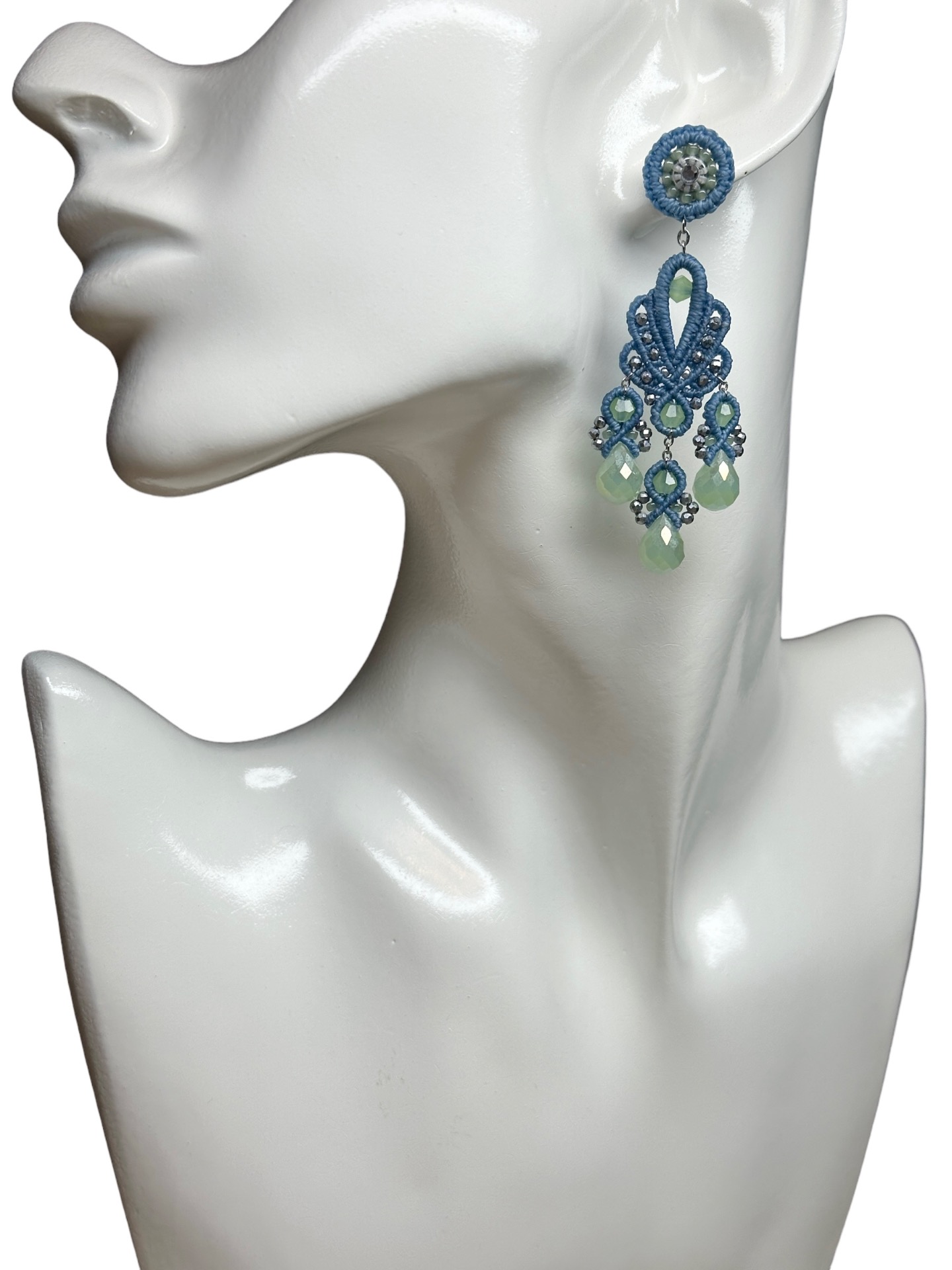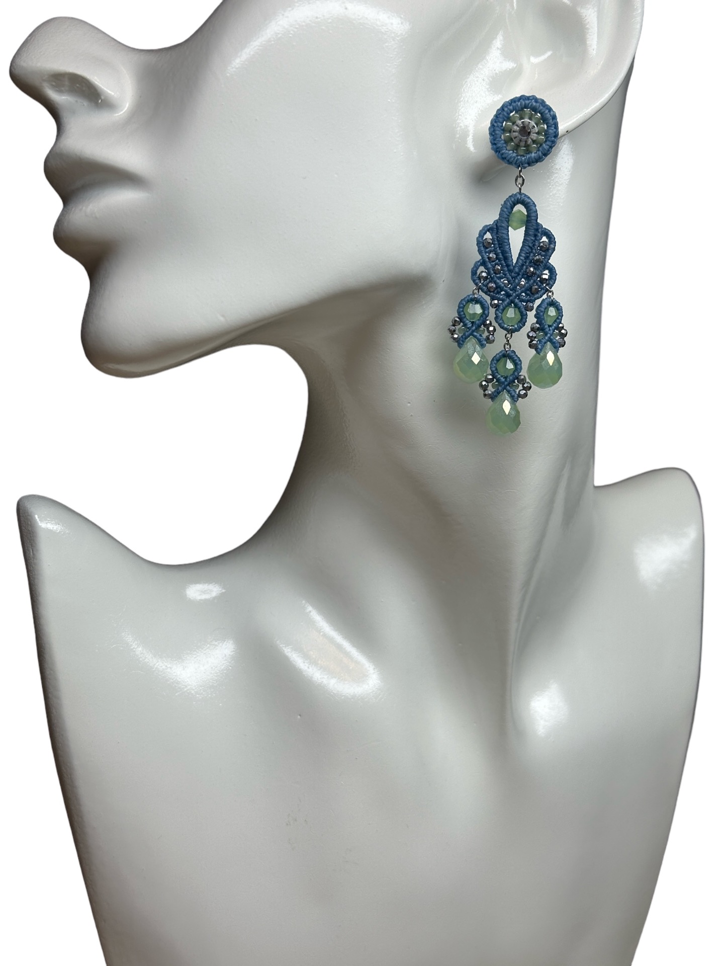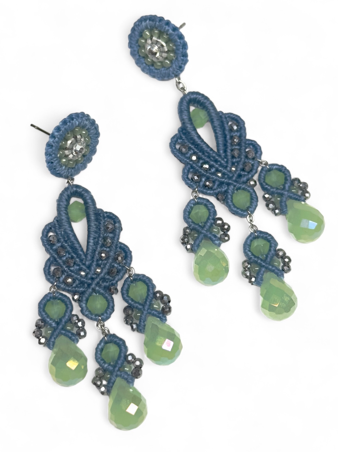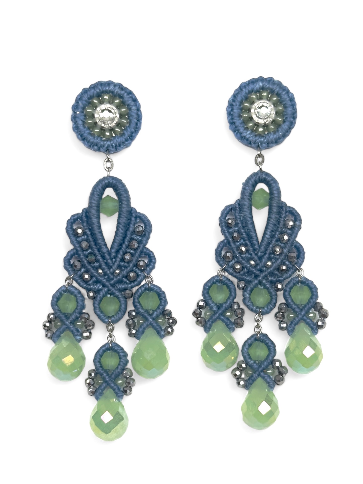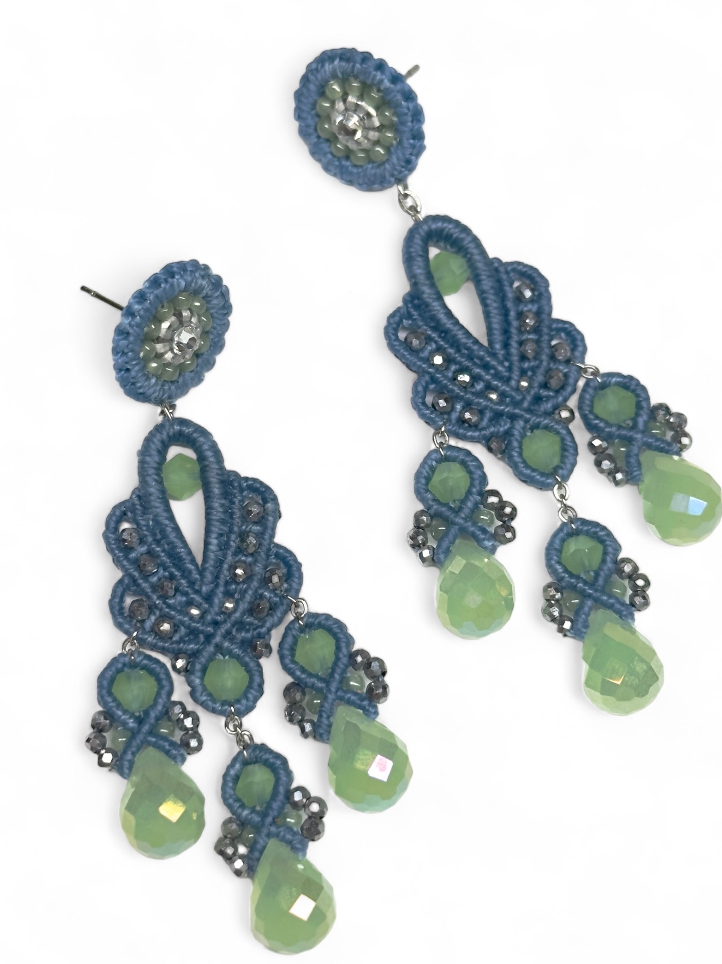 Material: Edelstahl, Silikon-Ohrringverschlüsse (10 mm Ø), Facettierte Glasperlen, Miyuki Perlen, Gewachstes Garn, Strasssteine