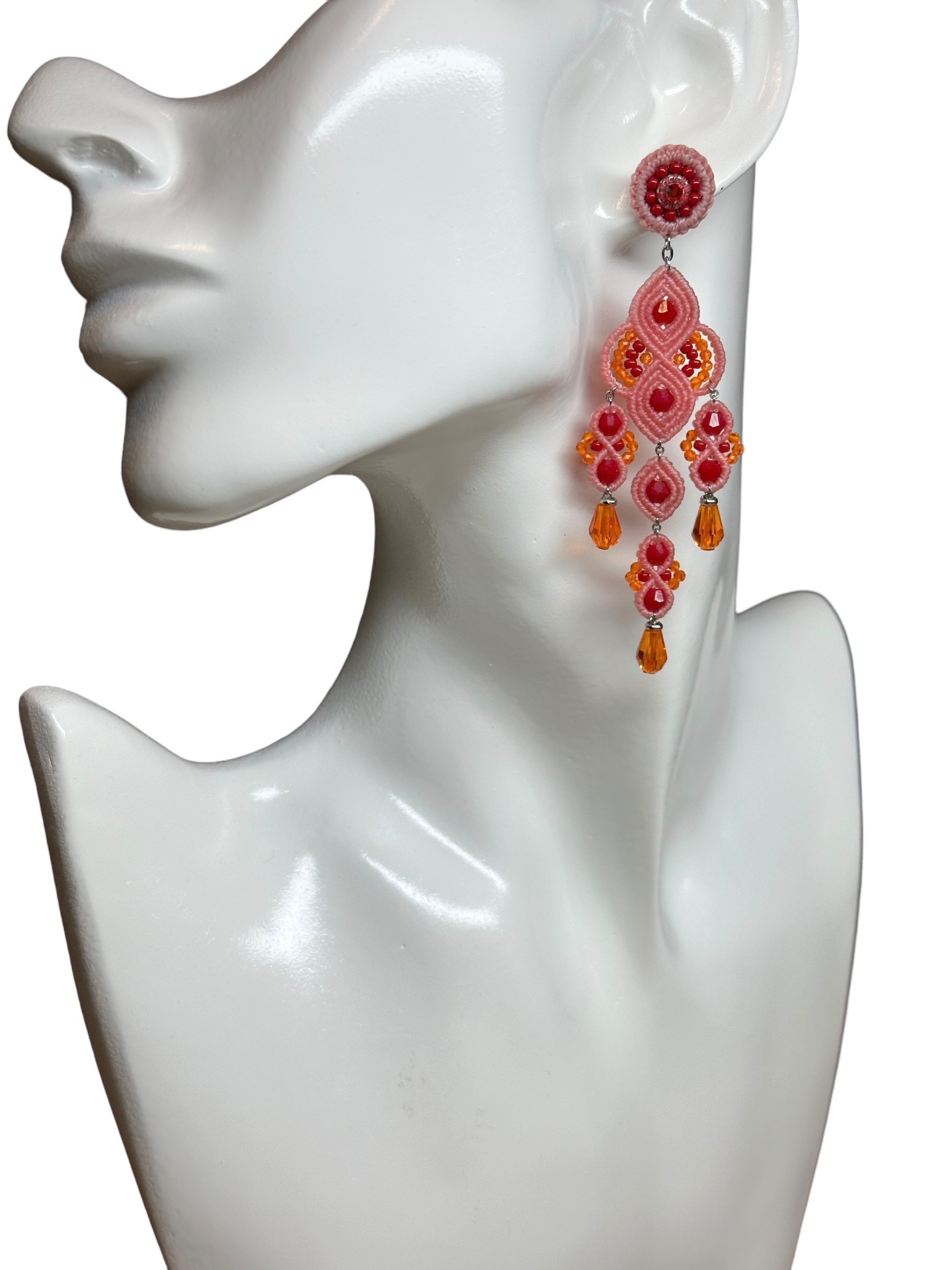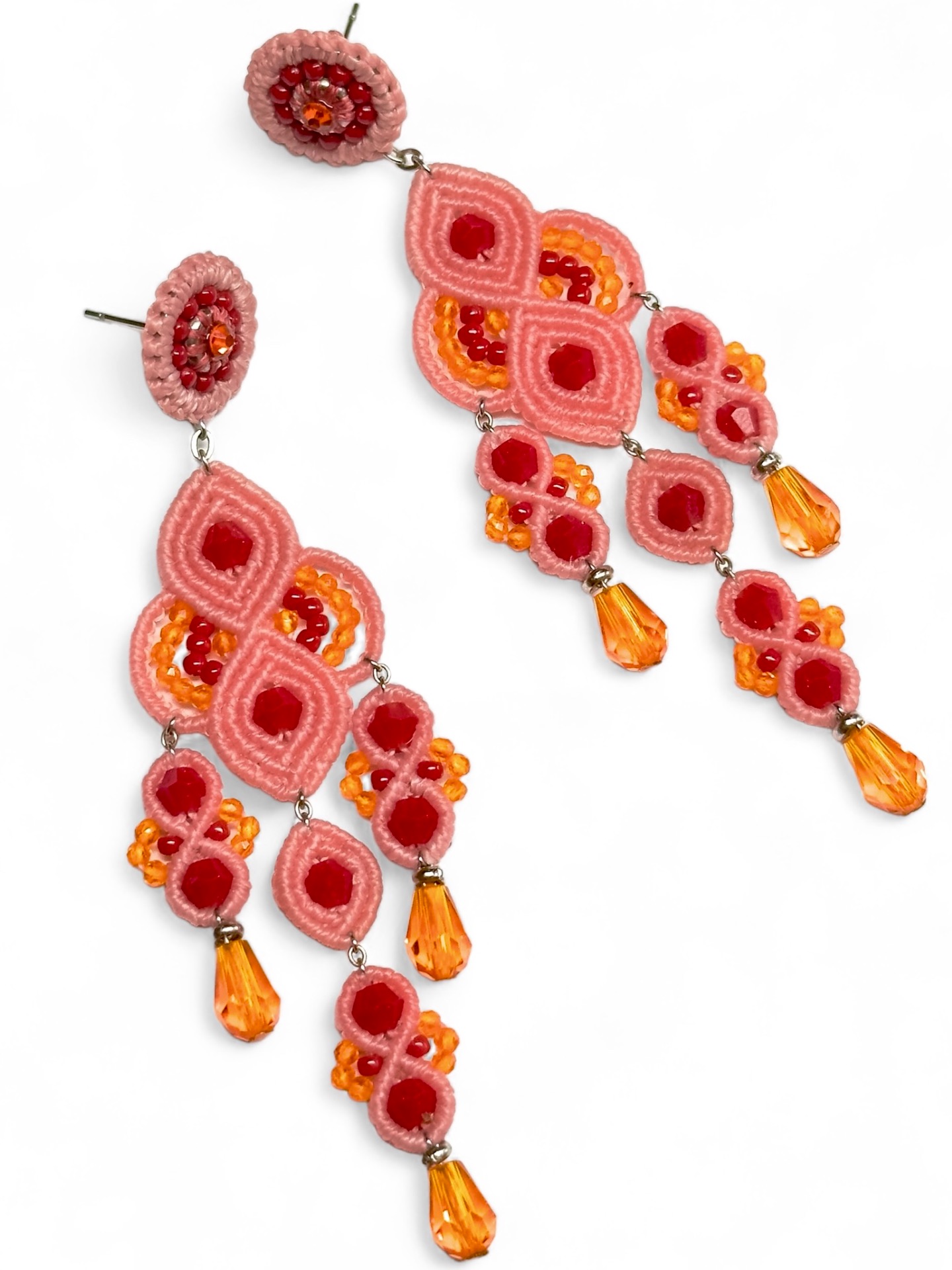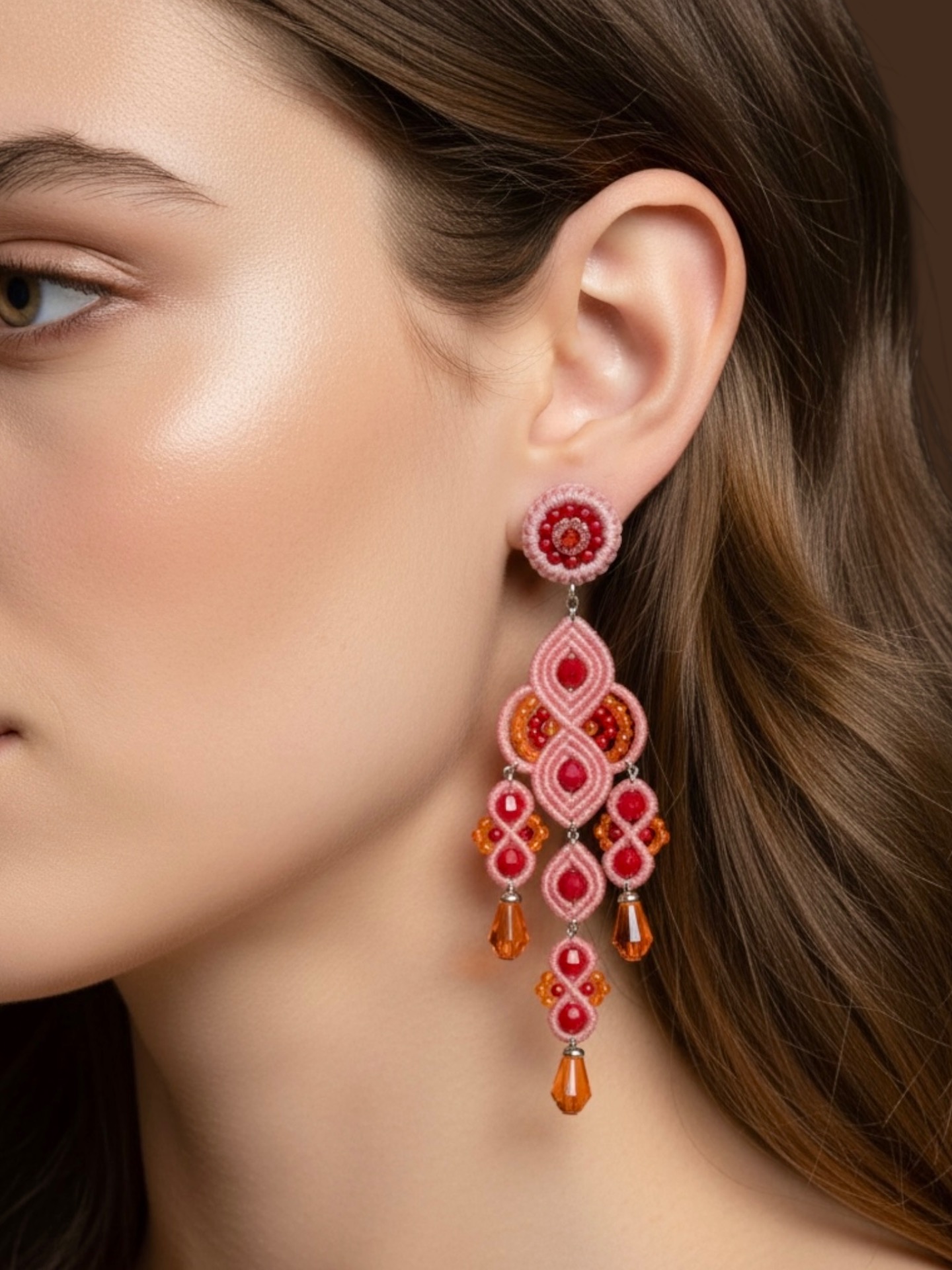 Material: Edelstahl, Silikon-Ohrringverschlüsse (10 mm Ø), Facettierte Glasperlen, Miyuki/Toho Perlen, Gewachstes Garn, Strasssteine