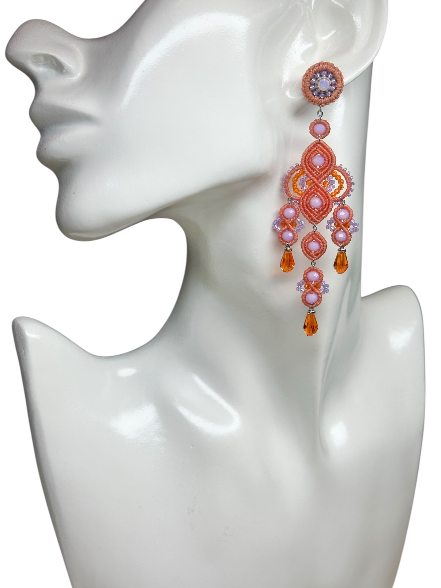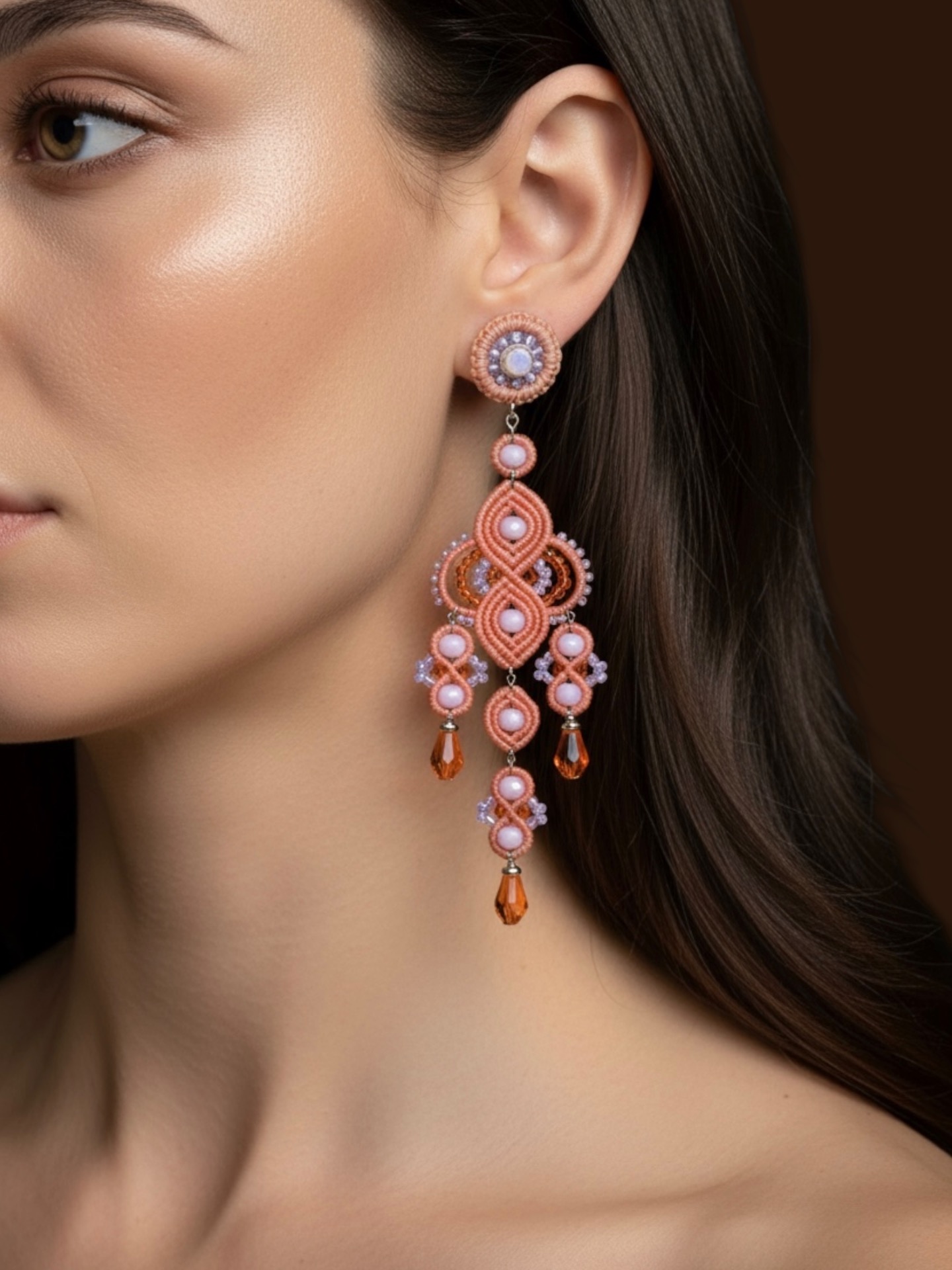 Material: Edelstahl, Silikon-Ohrringverschlüsse (10 mm Ø), Facettierte Glasperlen, Miyuki Perlen, Gewachstes Garn, Strasssteine