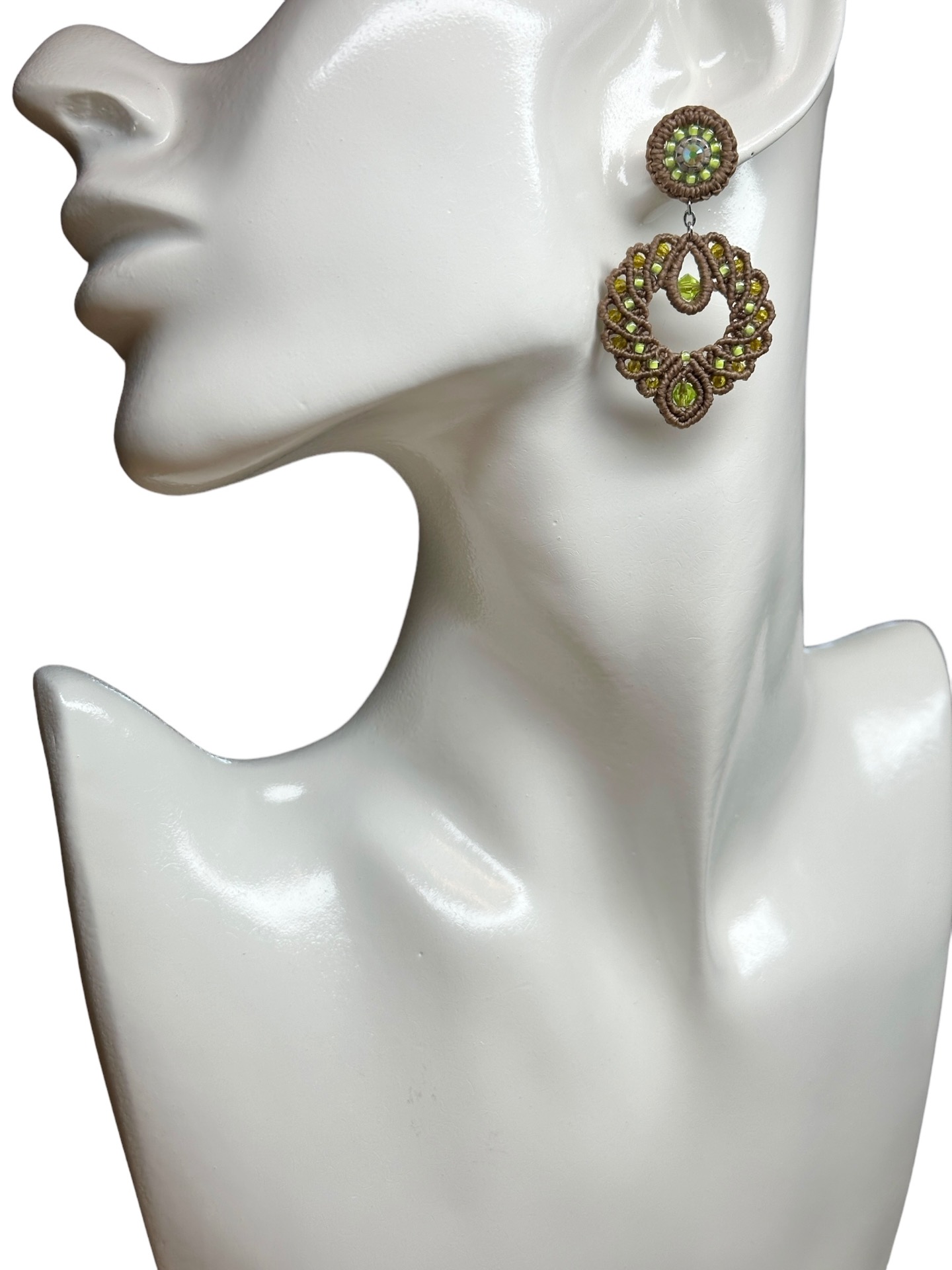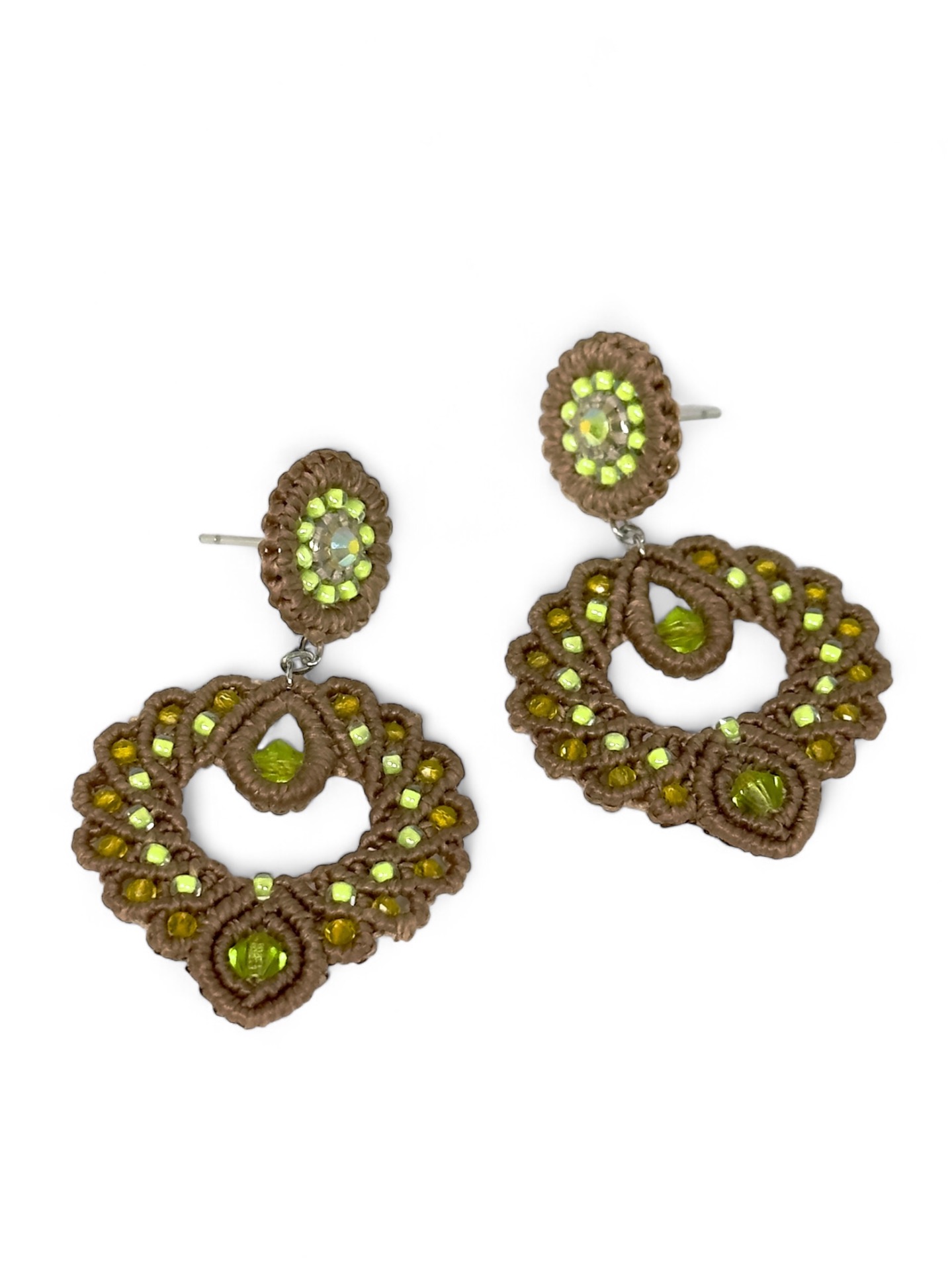 Material: Edelstahl, Silikon-Ohrringverschlüsse (10 mm Ø), Facettierte Glasperlen, Miyuki/Toho Perlen, Gewachstes Garn, Strasssteine