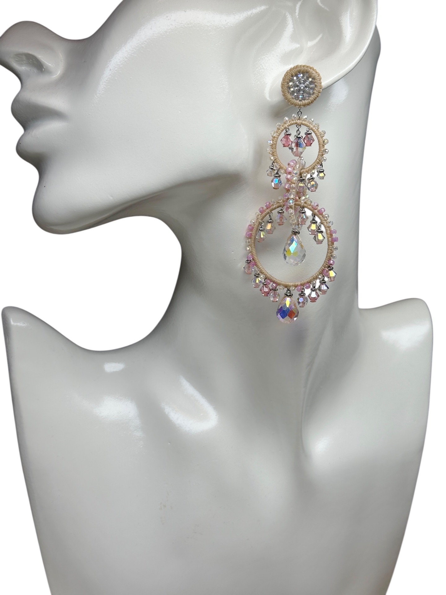 Material: Edelstahl, Silikon-Ohrringverschlüsse (10 mm Ø), Facettierte Glasperlen, Miyuki Perlen, Gewachstes Garn, Strasssteine