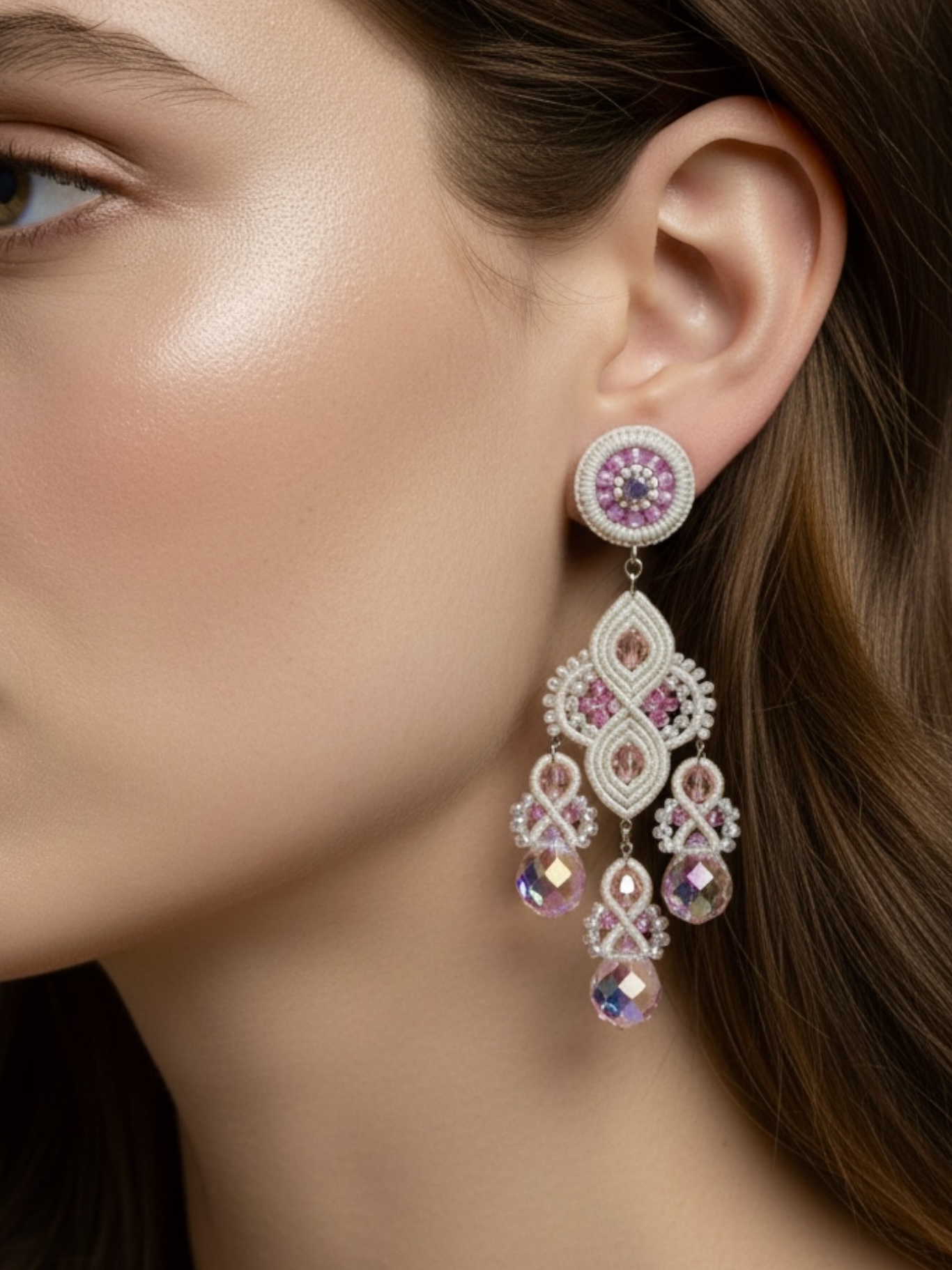 Material: Edelstahl, Silikon-Ohrringverschlüsse (10 mm Ø), Facettierte Glasperlen, Miyuki Perlen, Gewachstes Garn, Strasssteine