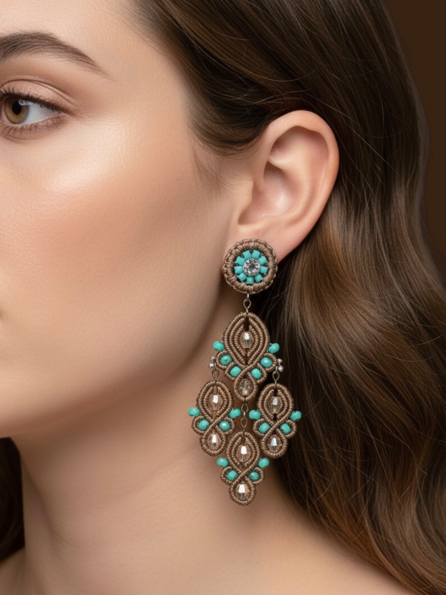 Material: Edelstahl, Silikon-Ohrringverschlüsse (10 mm Ø)Facettierte Glasperlen, Miyuki Perlen, Gewachstes Garn, Strasssteine