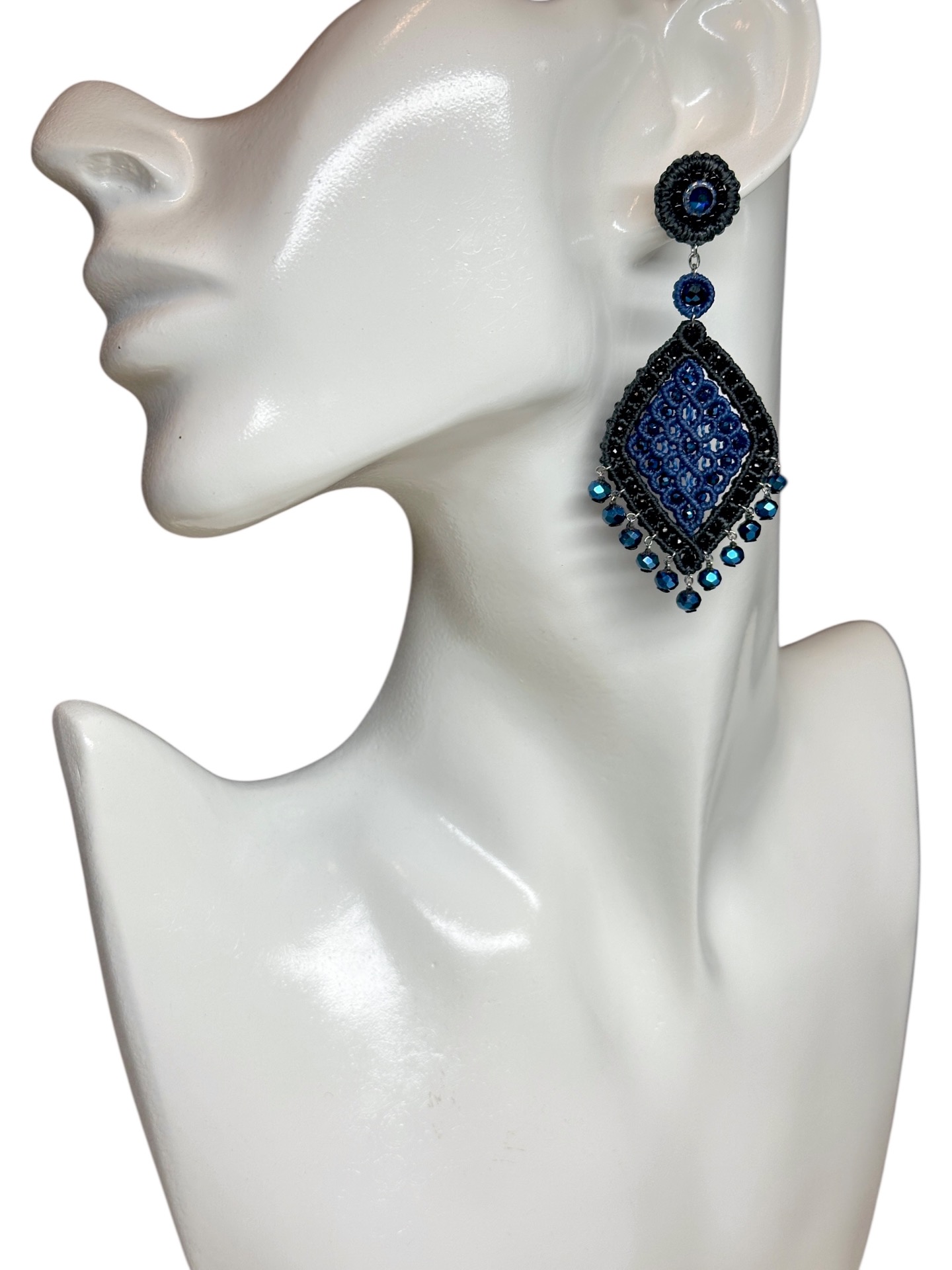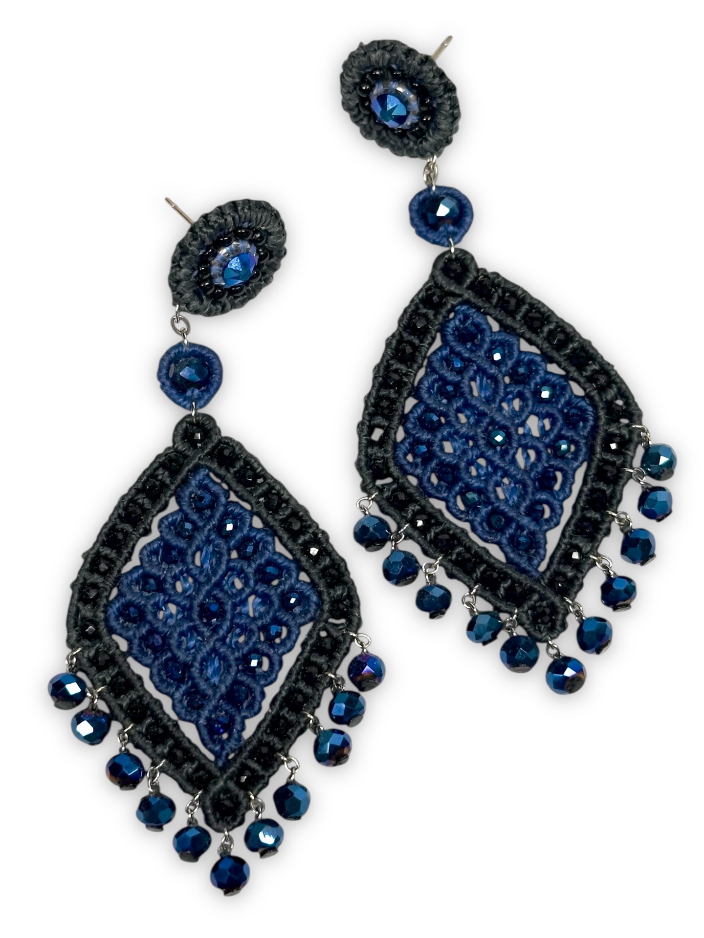 Material: Edelstahl, Silikon-Ohrringverschlüsse (10 mm Ø), Facettierte Glasperlen, Miyuki Perlen, Gewachstes Garn, Strasssteine