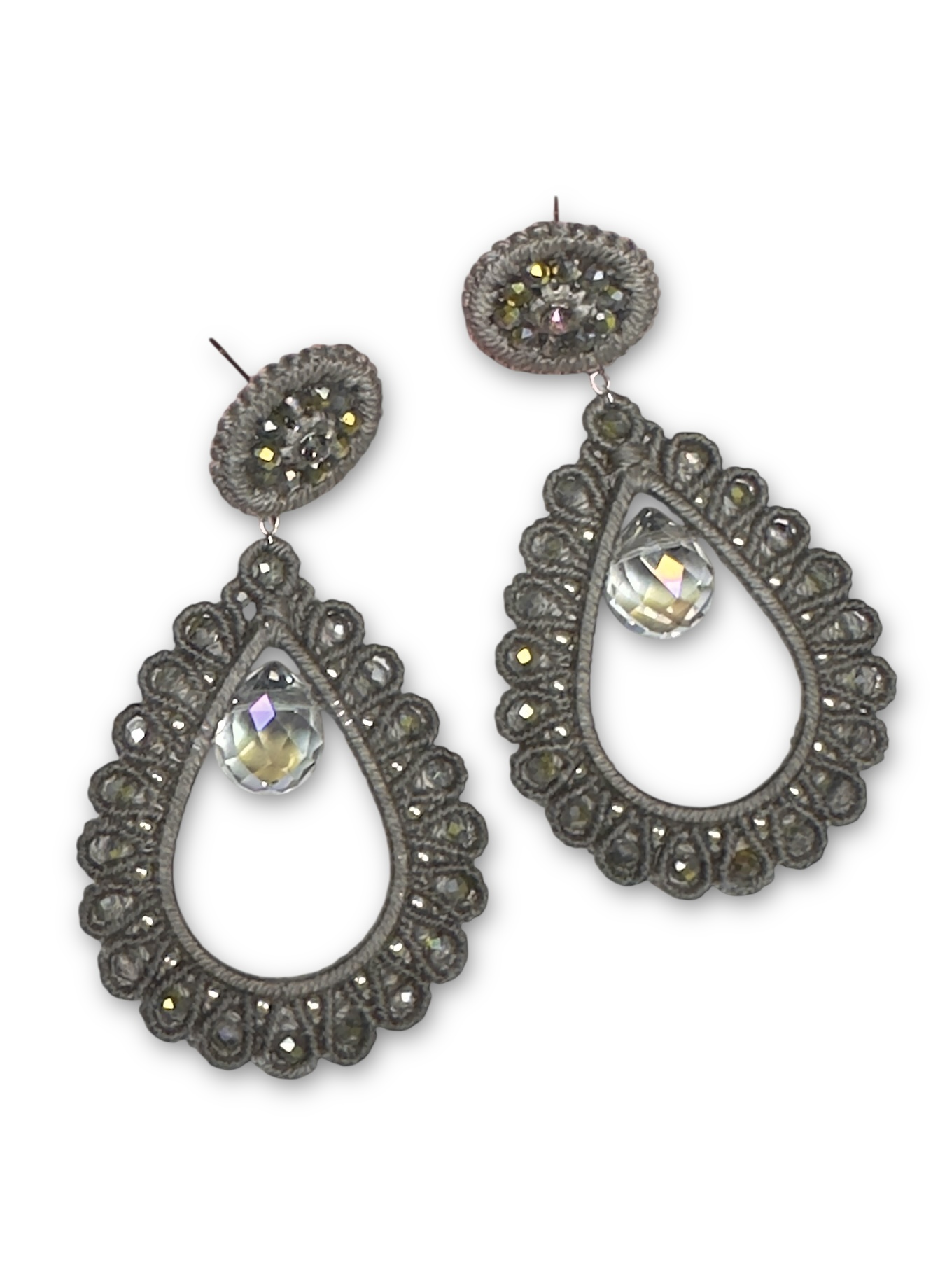 Material: Edelstahl, Silikon-Ohrringverschlüsse (10 mm Ø), Facettierte Glasperlen, Gewachstes Garn, Strasssteine