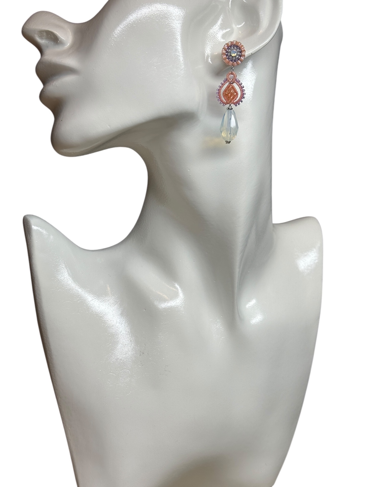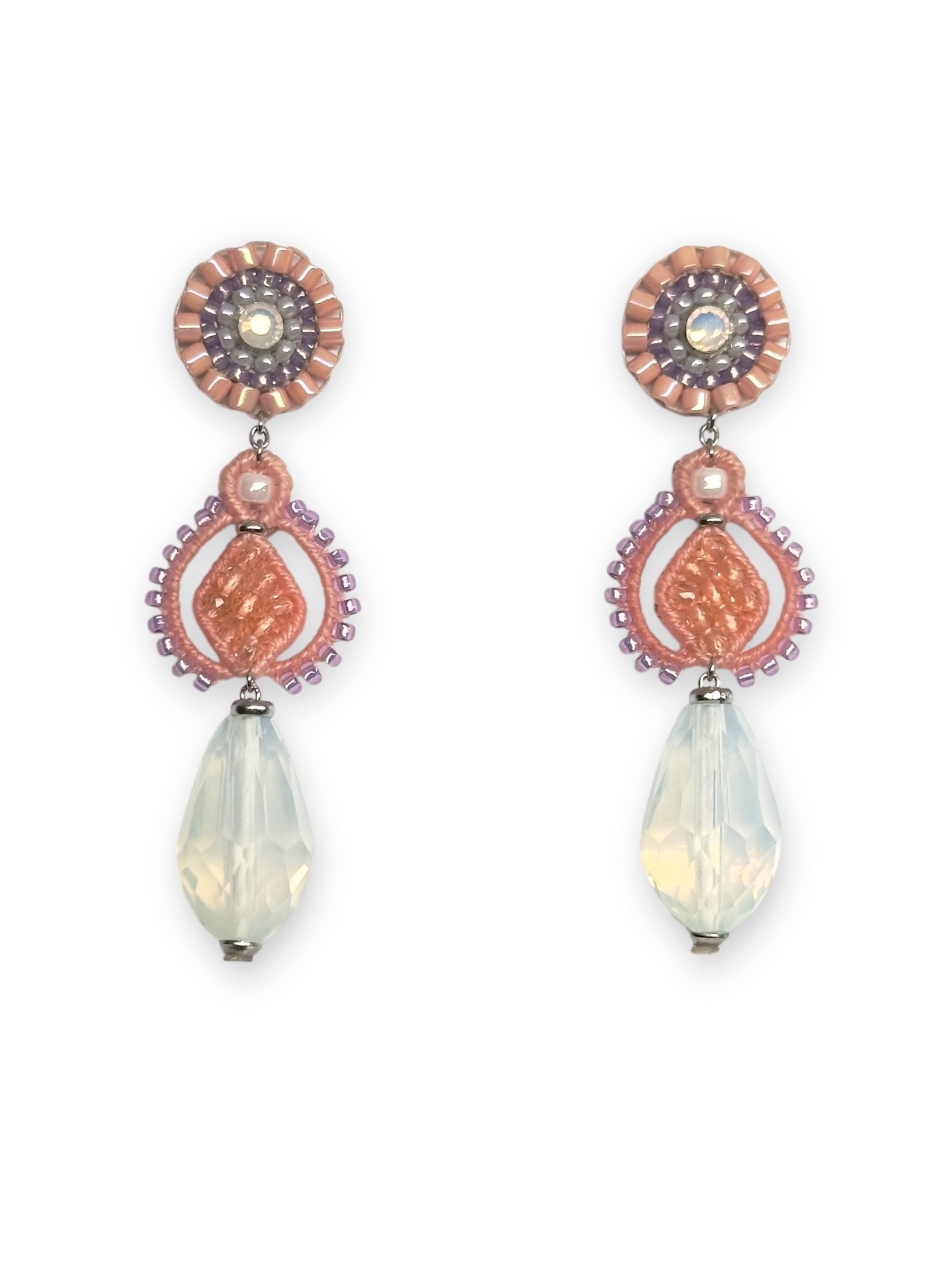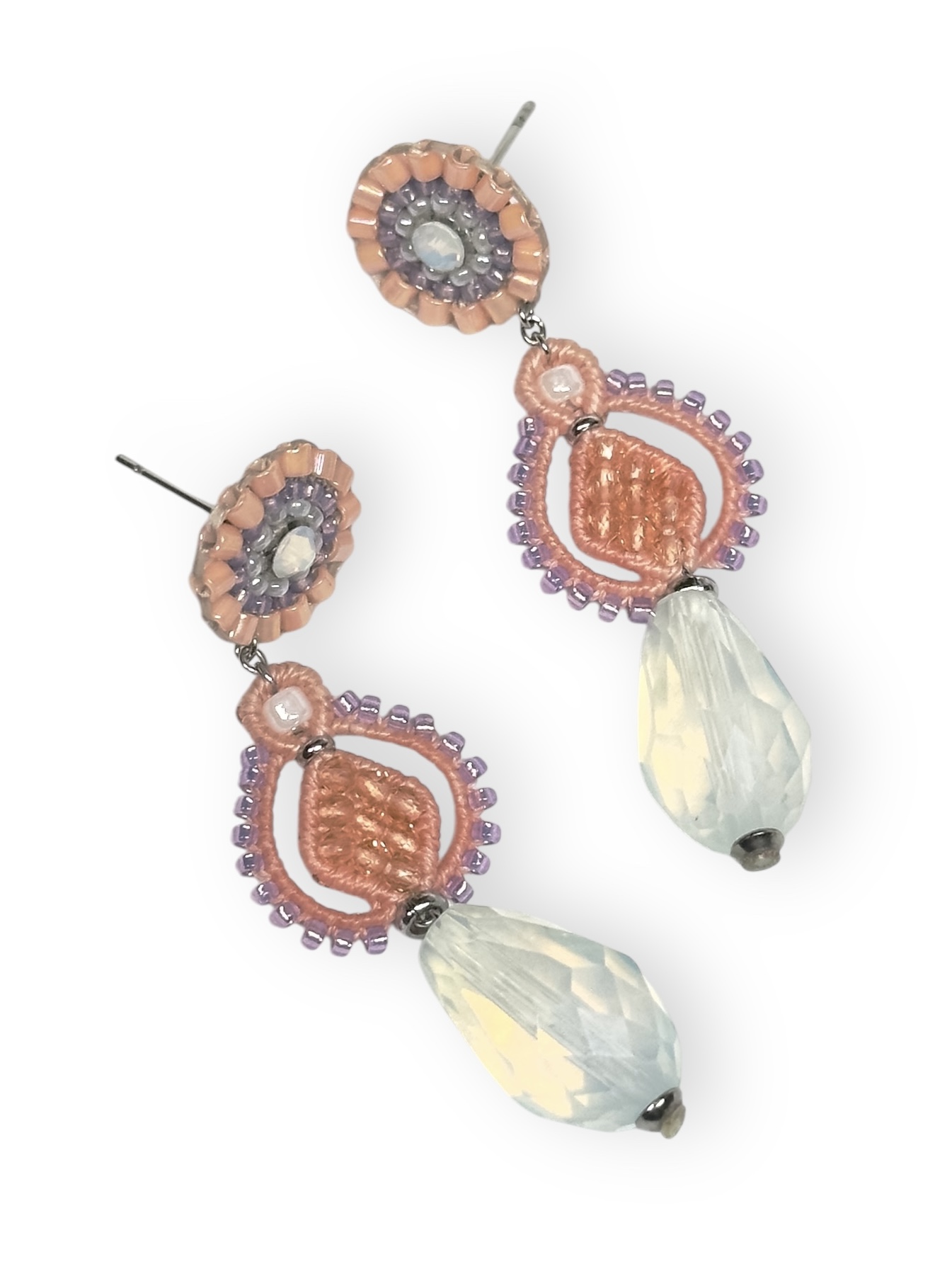 Material: Edelstahl, Silikon-Ohrringverschlüsse (10 mm Ø), Facettierte Glasperlen, Miyuki Perlen, Gewachstes Garn, Strasssteine