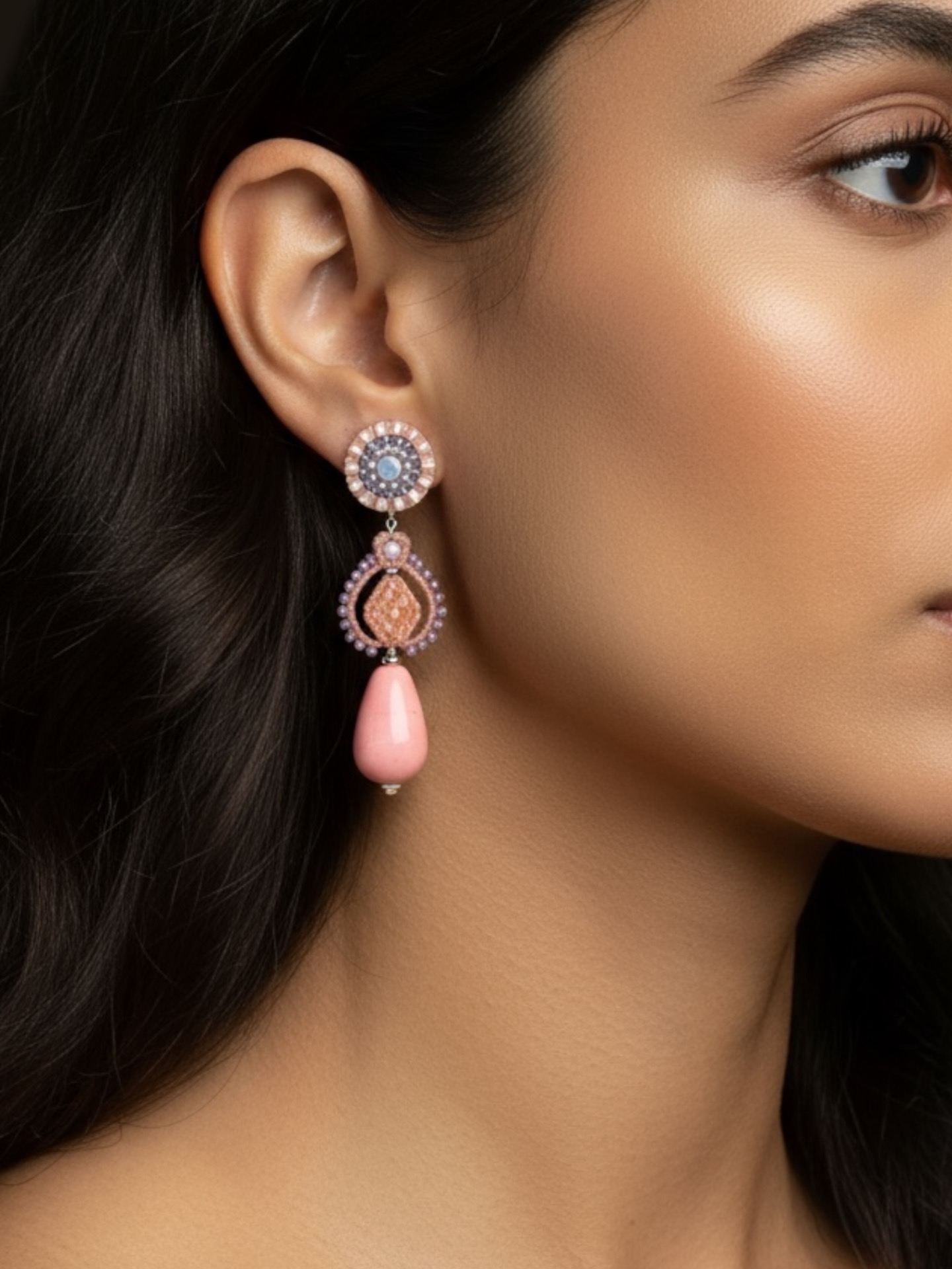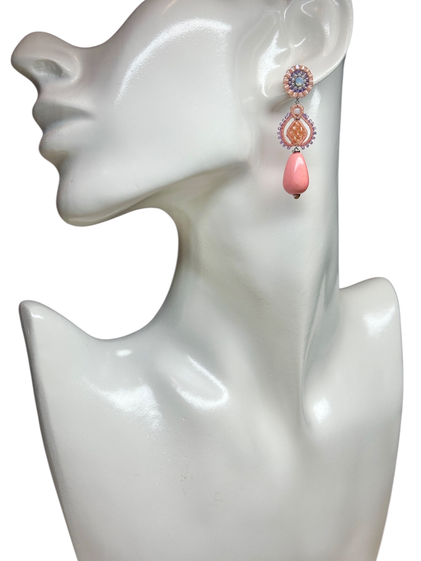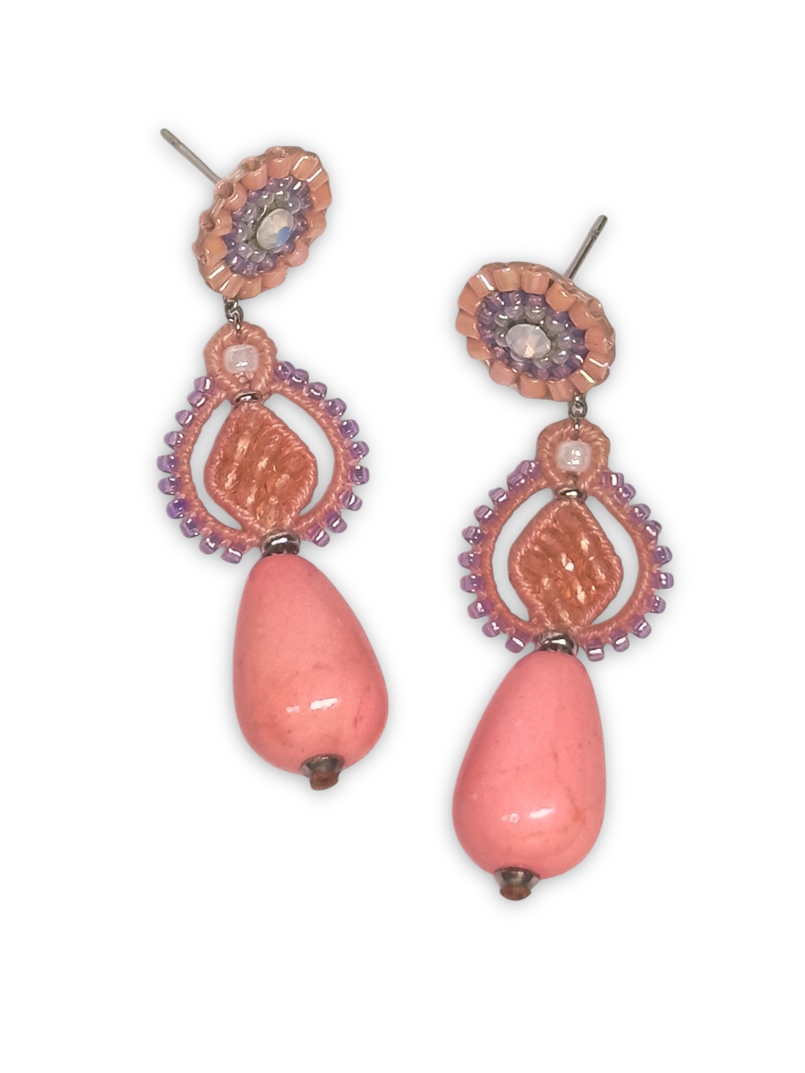 Material: Edelstahl, Silikon-Ohrringverschlüsse (10 mm Ø), Facettierte Glasperlen, Miyuki Perlen, Gewachstes Garn, Strasssteine