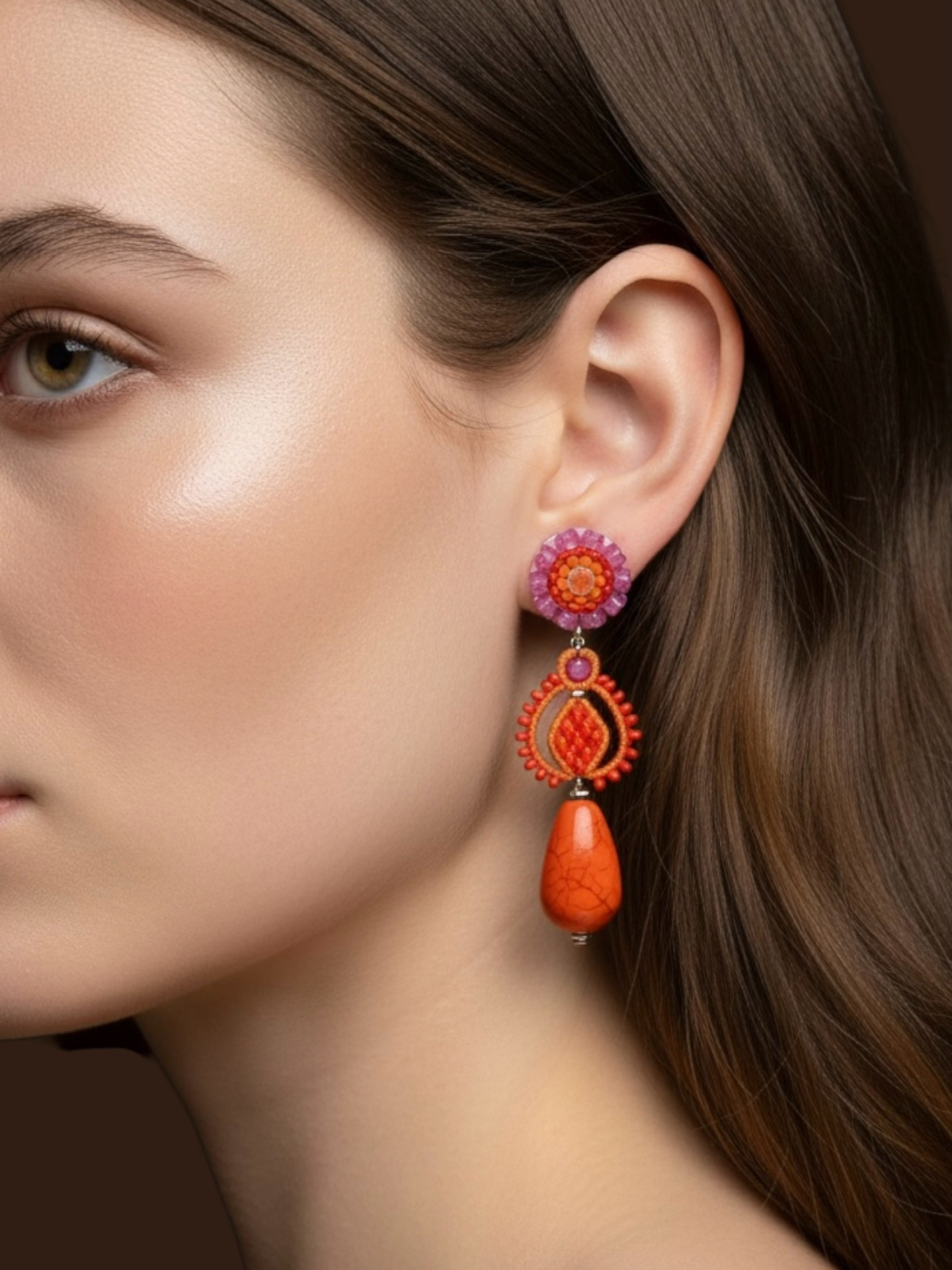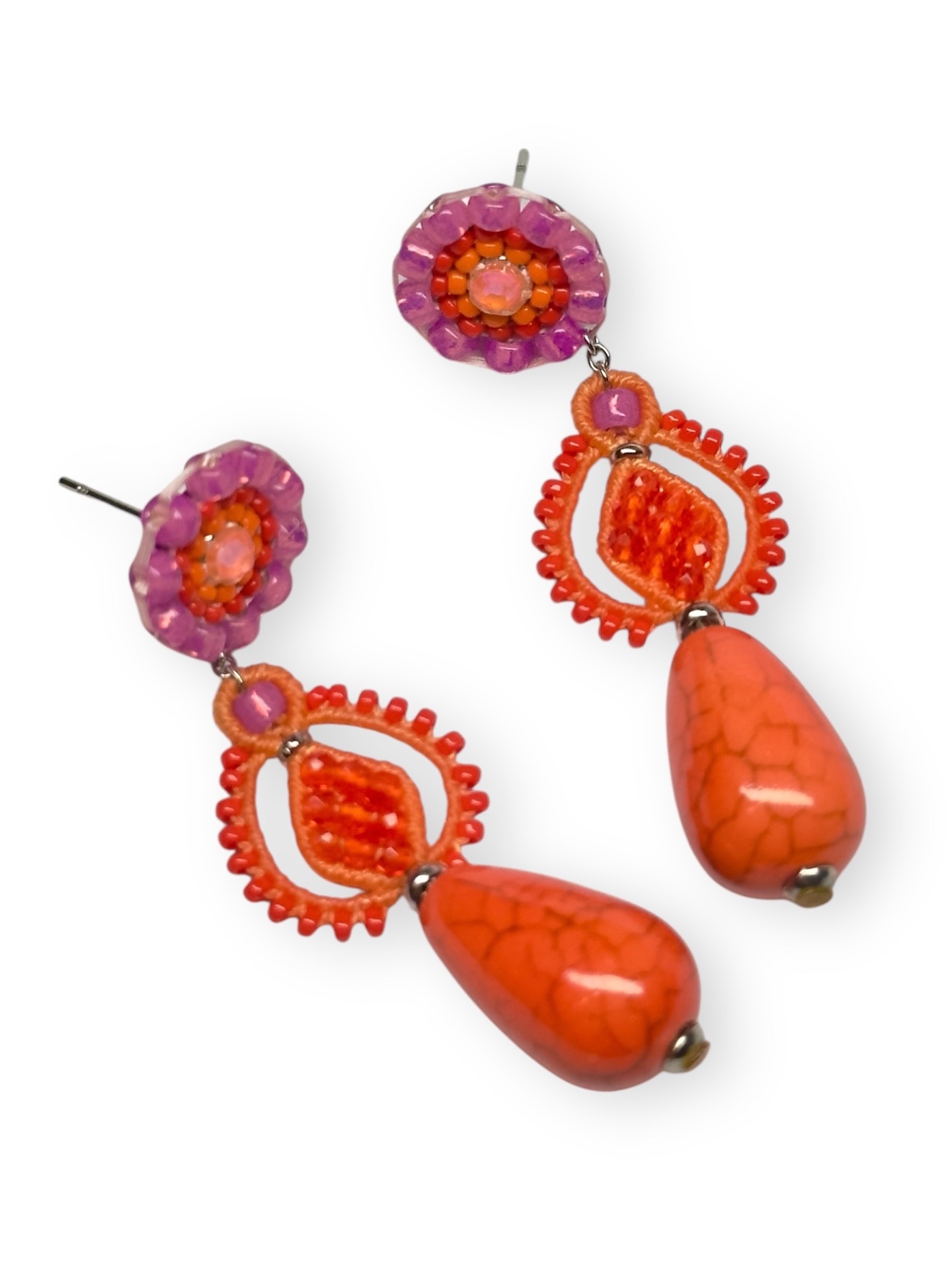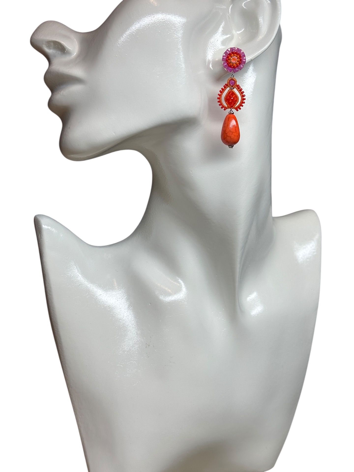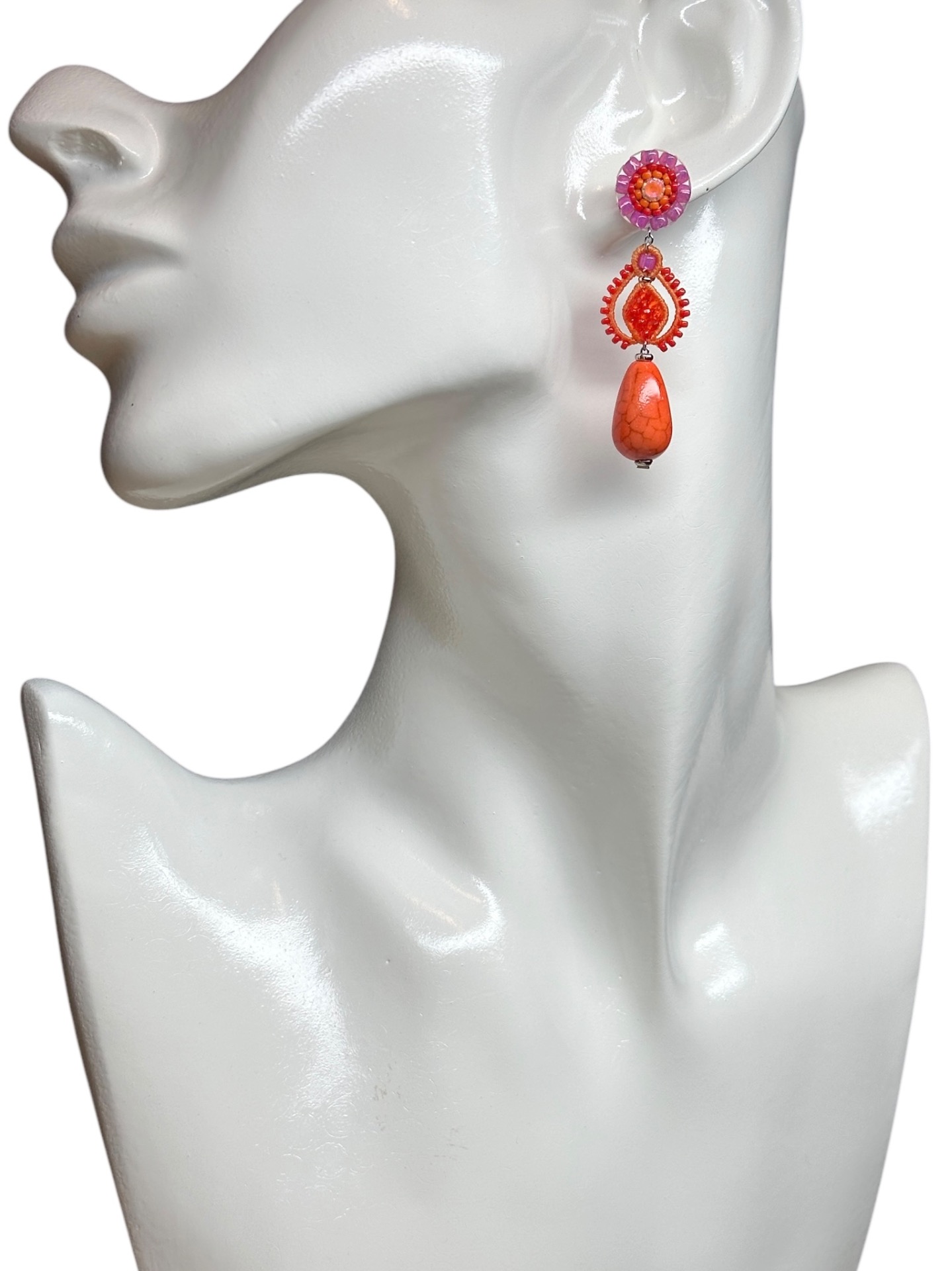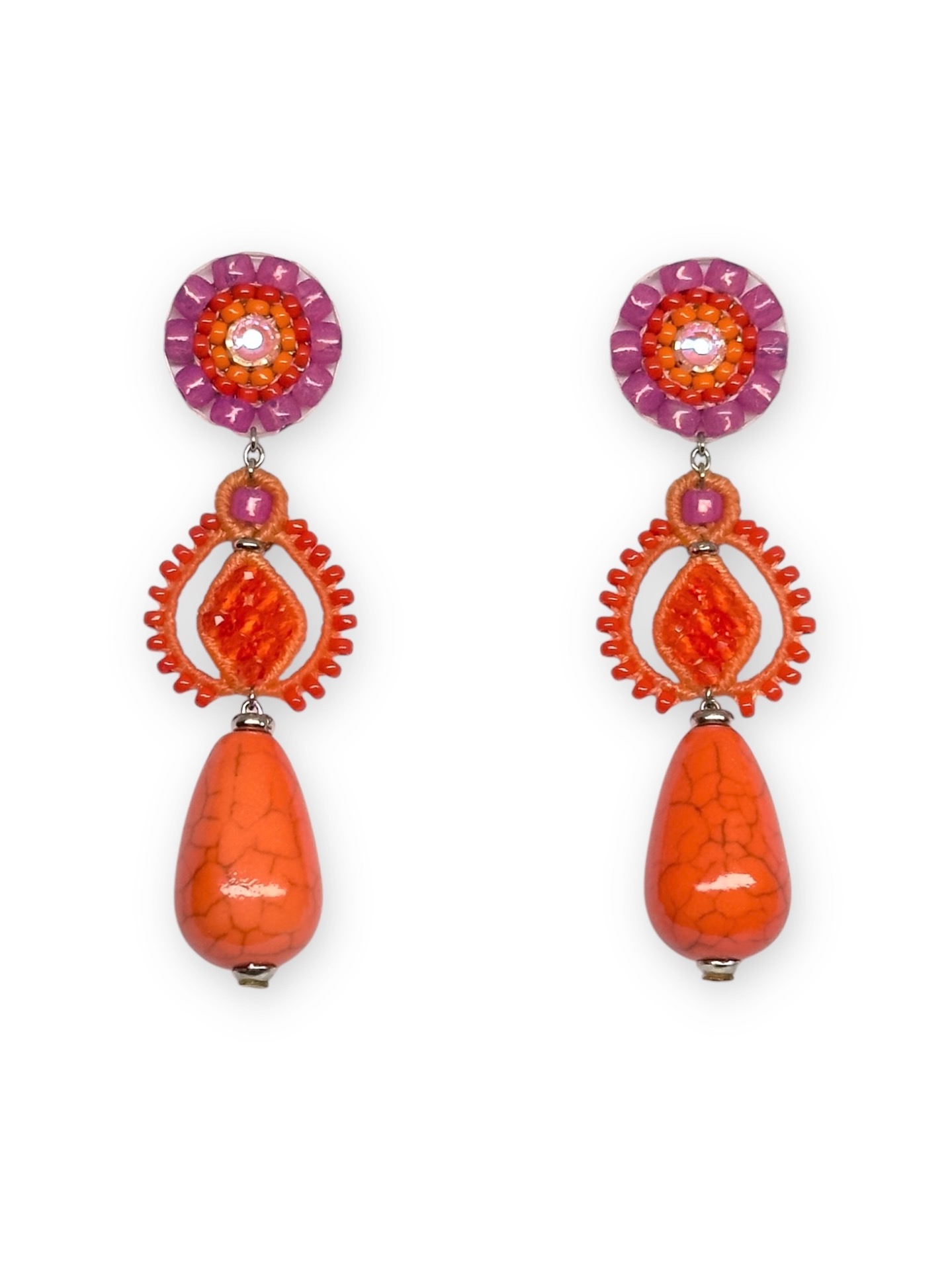Material: Edelstahl, Silikon-Ohrringverschlüsse (10 mm Ø), Facettierte Glasperlen, Keramikperlen, Miyuki Perlen, Gewachstes Garn, Strasssteine