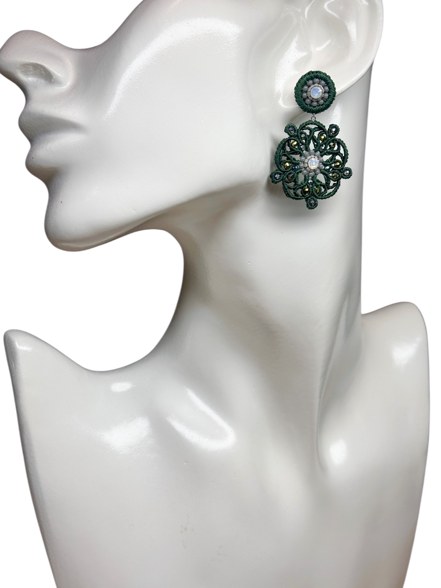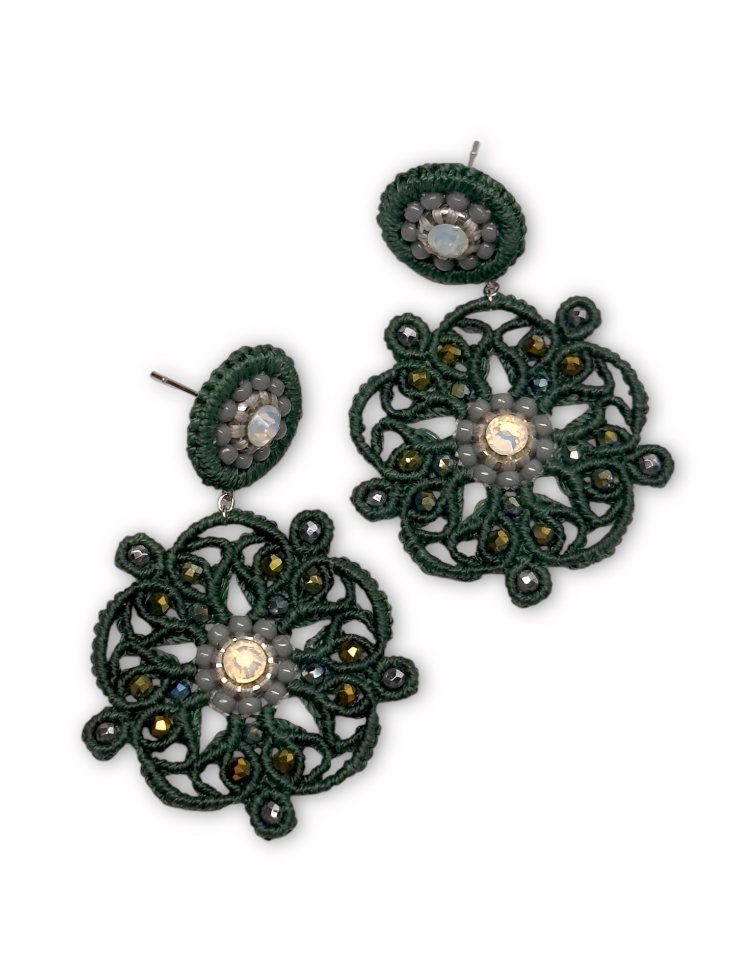 Material: Edelstahl, Silikon-Ohrringverschlüsse (10 mm Ø), Facettierte Glasperlen, Miyuki Perlen, Gewachstes Garn, Strasssteine