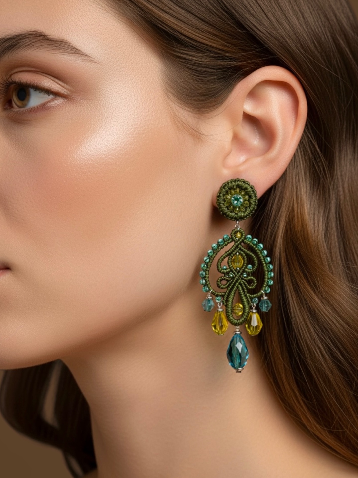 Material: Edelstahl, Silikon-Ohrringverschlüsse (10 mm Ø), Facettierte Glasperlen, Gewachstes Garn, Strasssteine