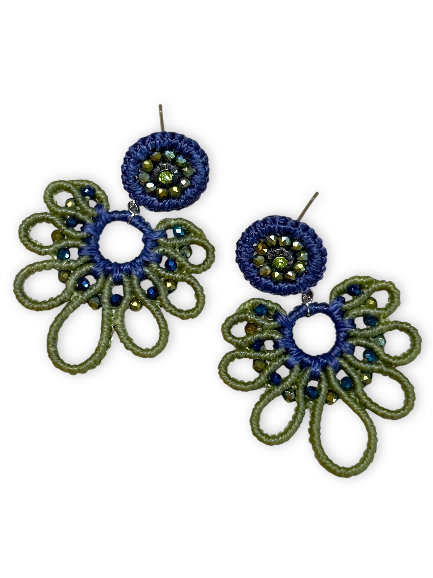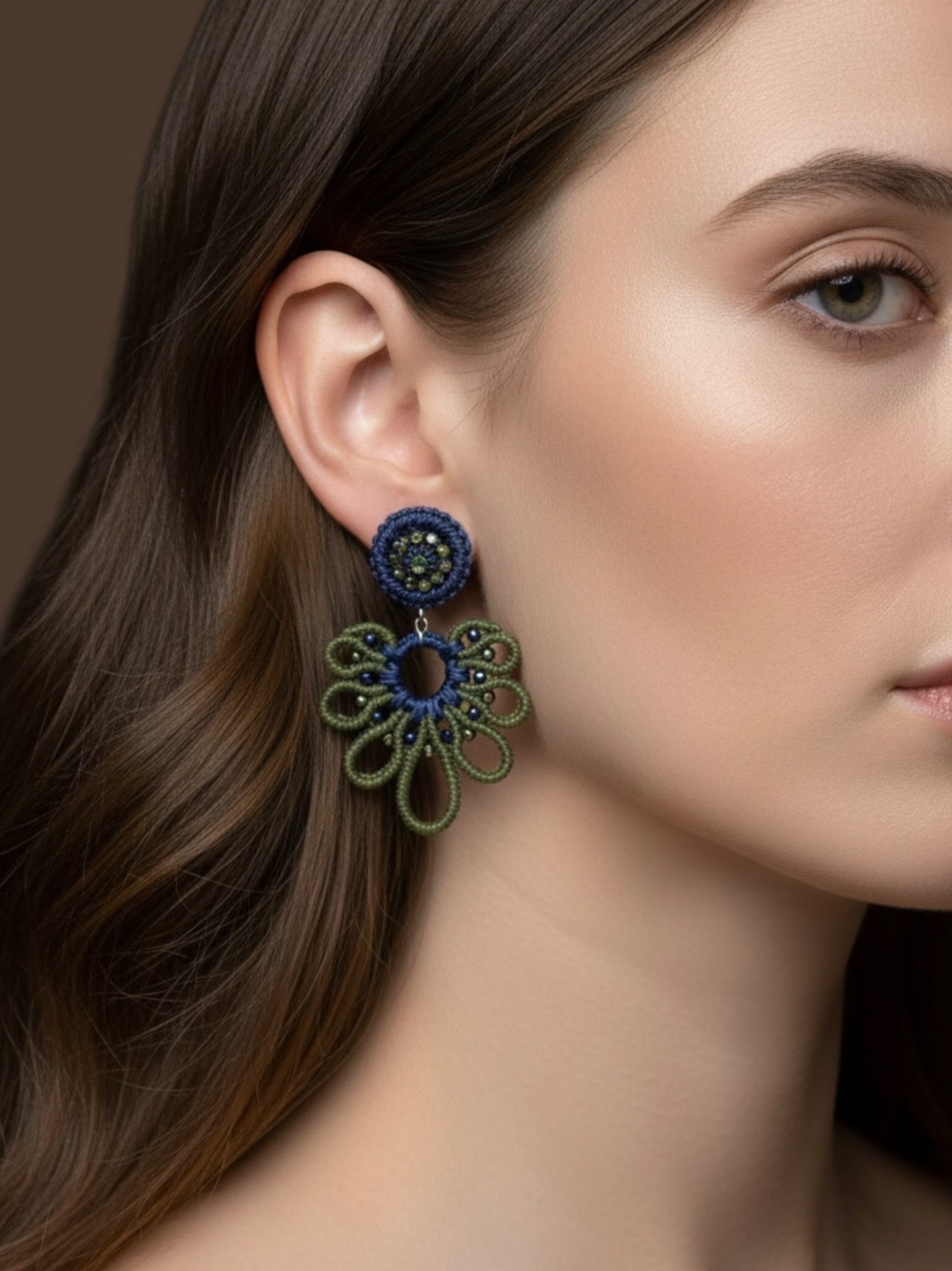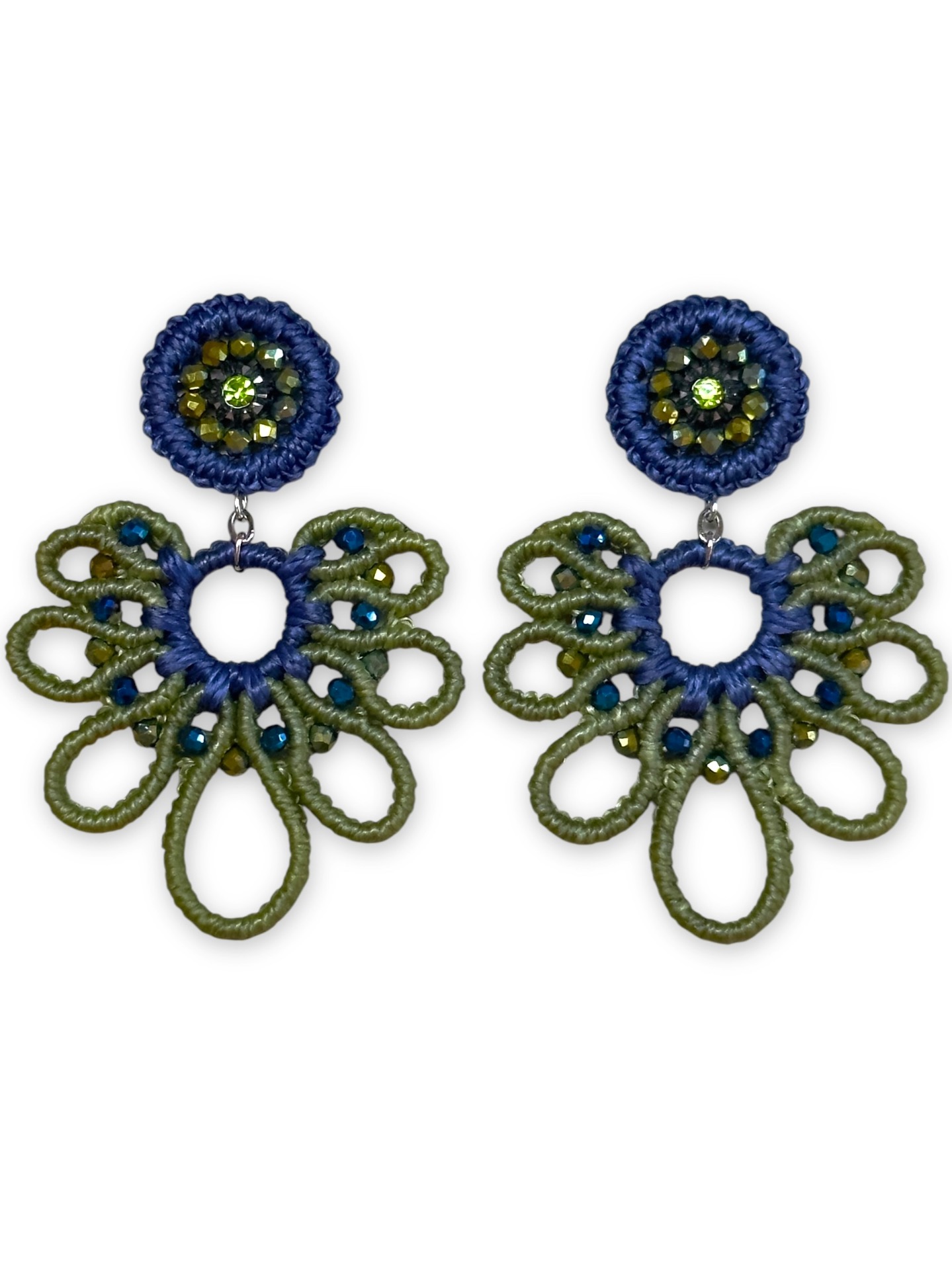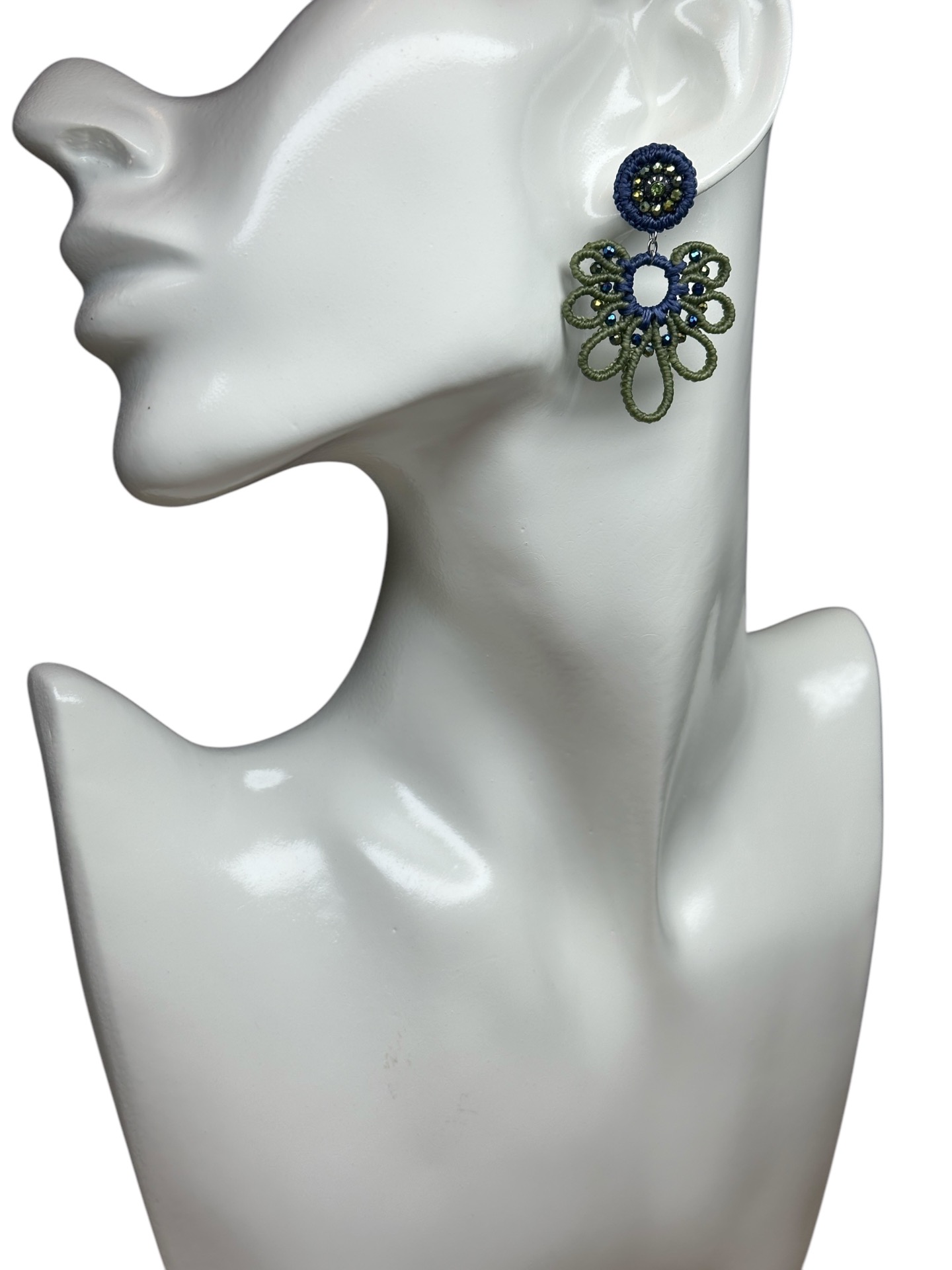 Material: Edelstahl, Silikon-Ohrringverschlüsse (10 mm Ø), Facettierte Glasperlen, Gewachstes Garn, Strasssteine