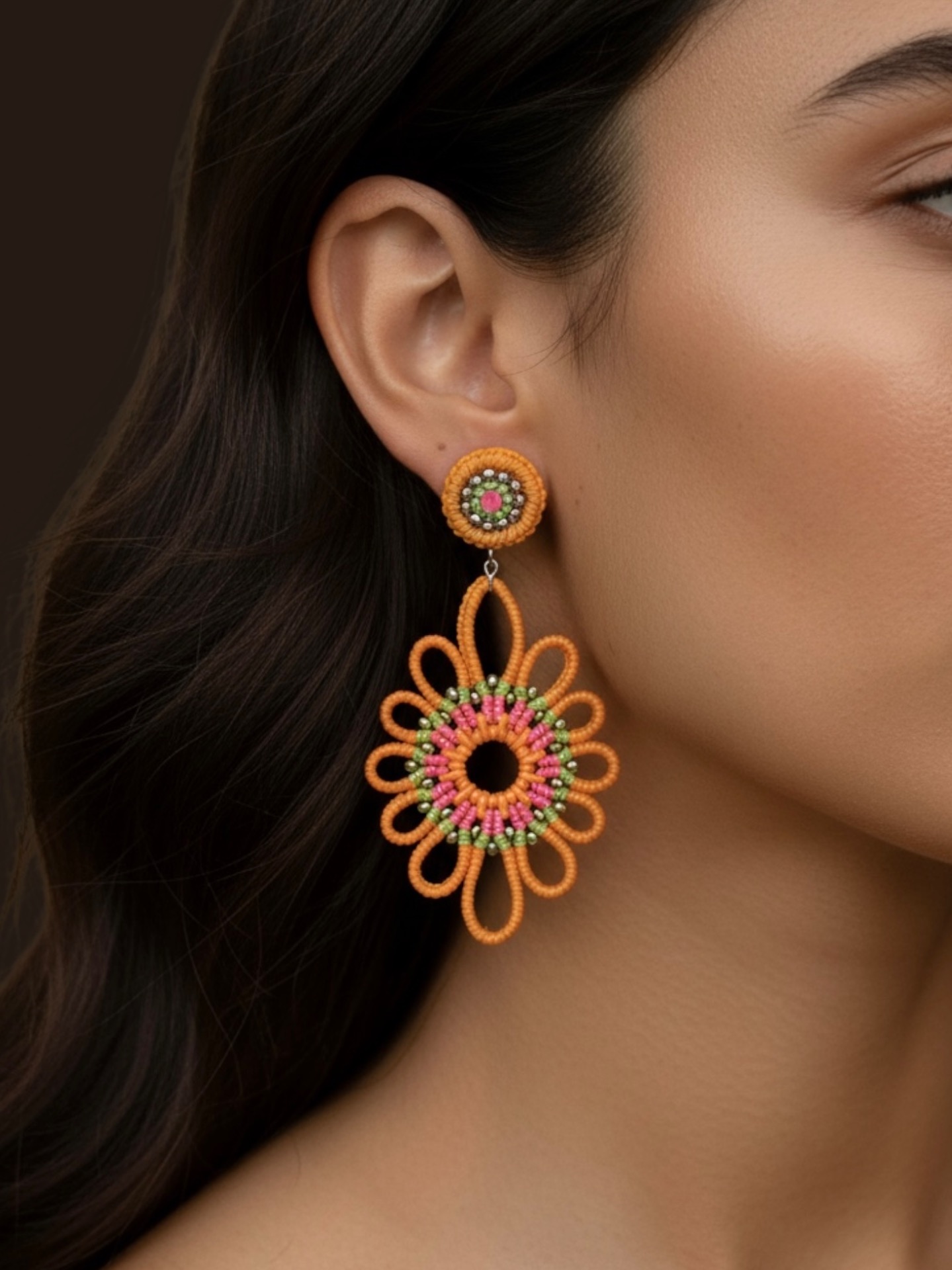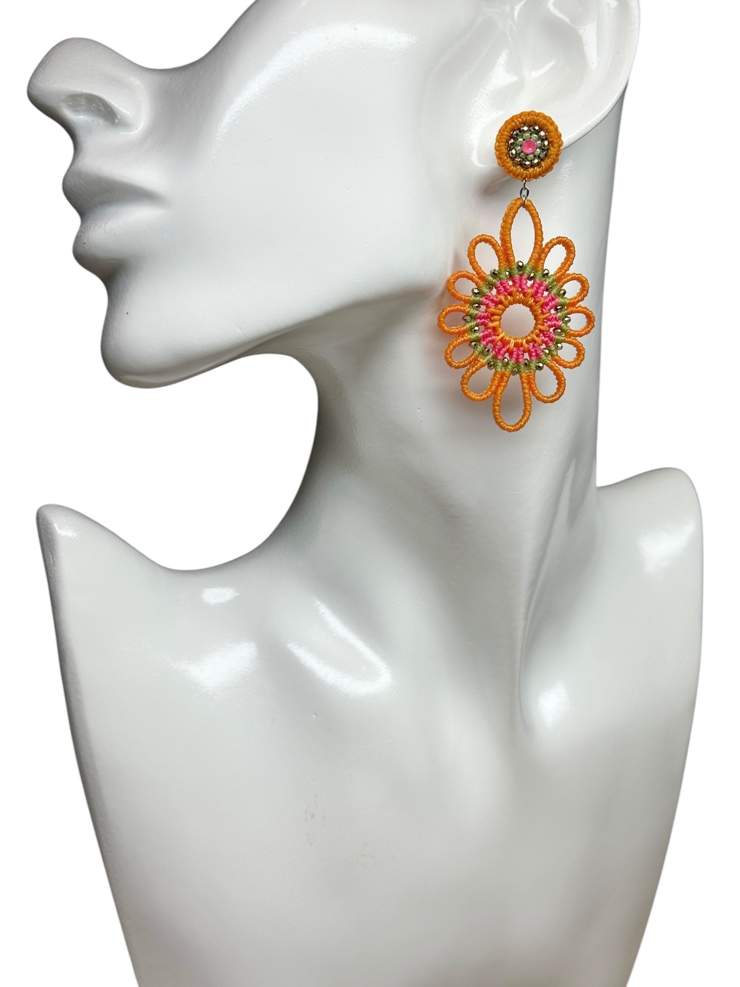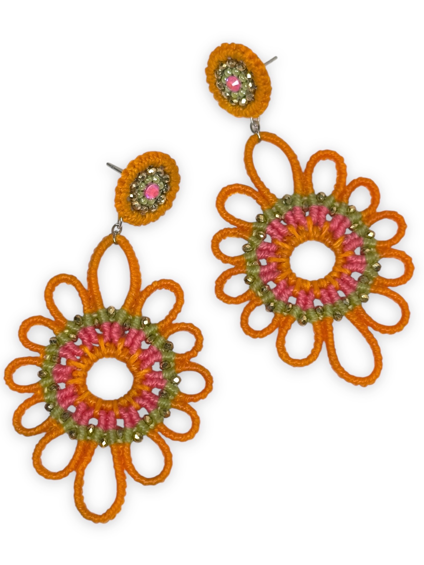 Material: Edelstahl, Silikon-Ohrringverschlüsse (10 mm Ø), Facettierte Glasperlen, Miyuki Perlen, Gewachstes Garn, Strasssteine