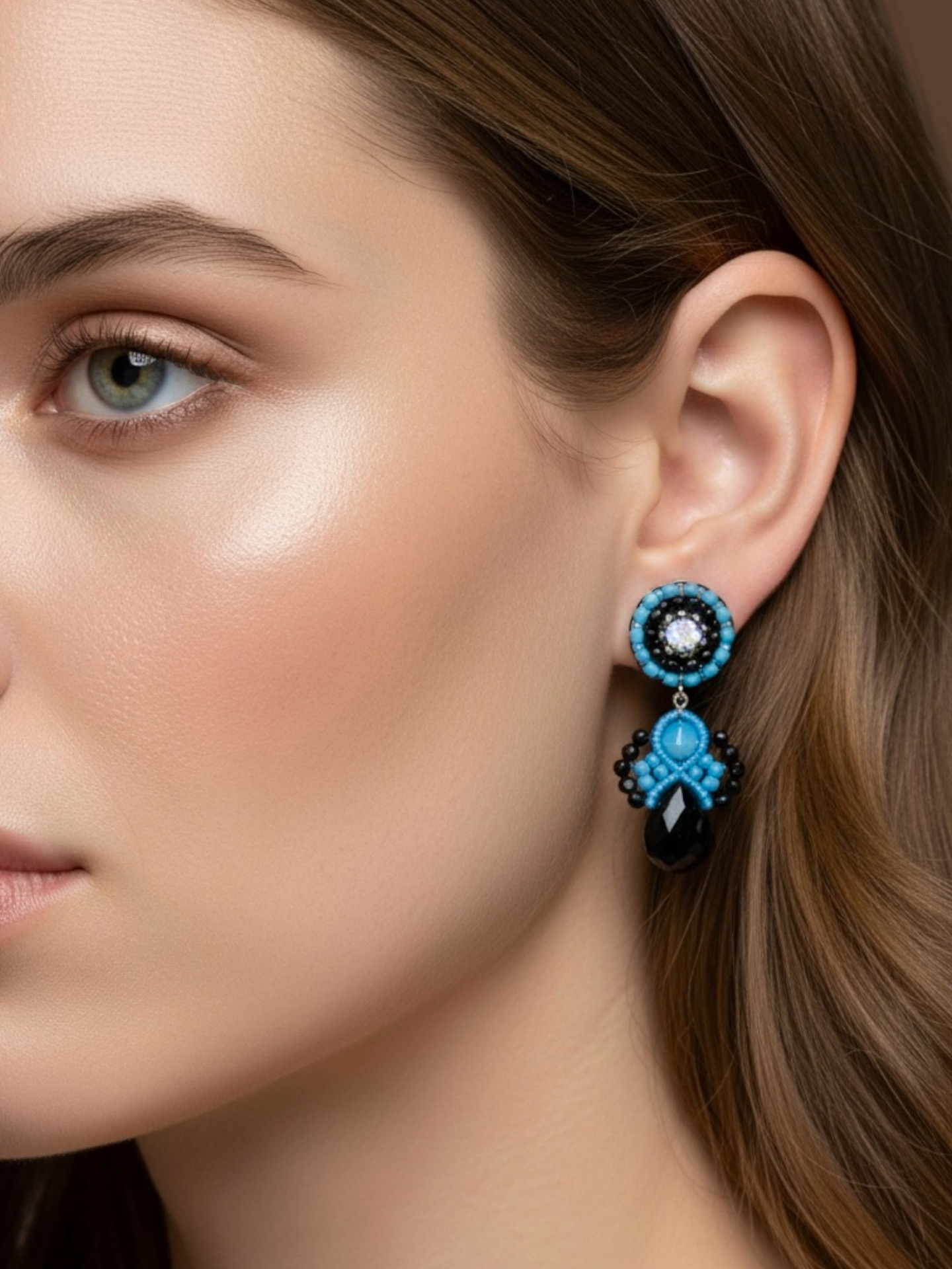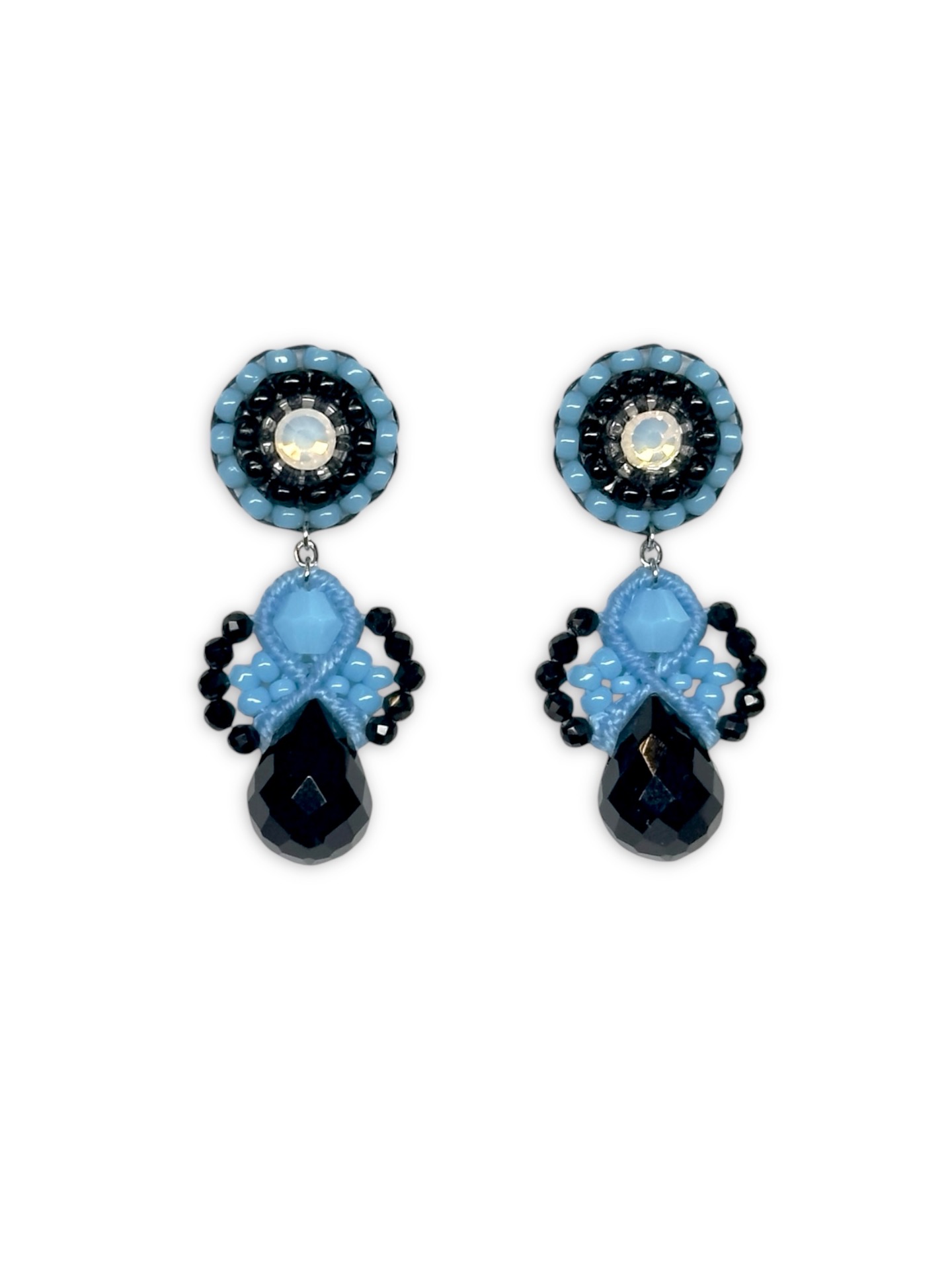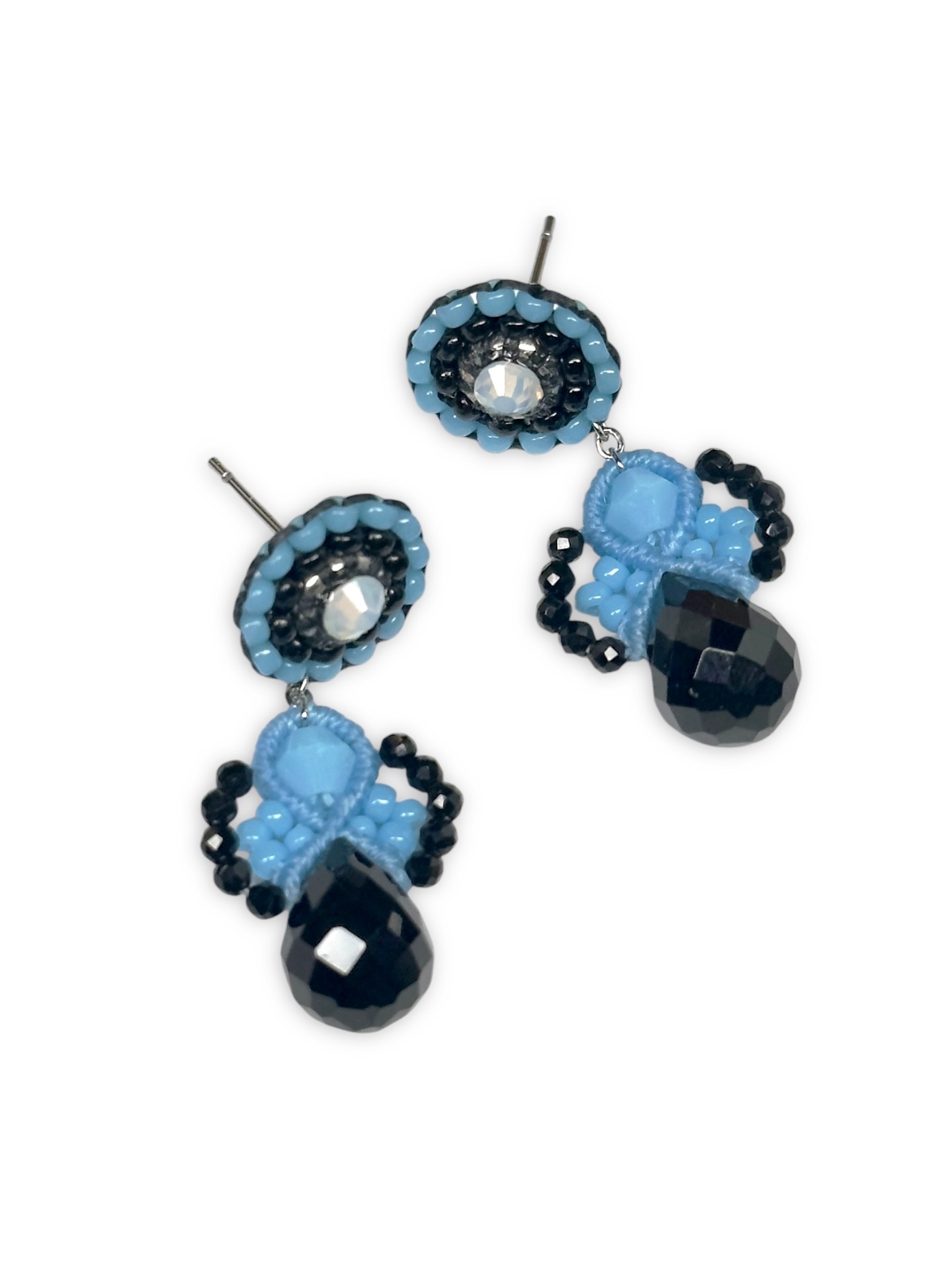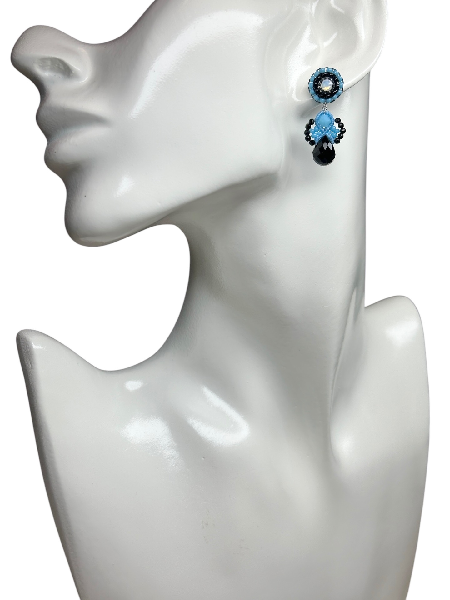 Material: Edelstahl, Silikon-Ohrringverschlüsse (10 mm Ø), Facettierte Glasperlen, Miyuki/Toho Perlen, Gewachstes Garn, Strasssteine