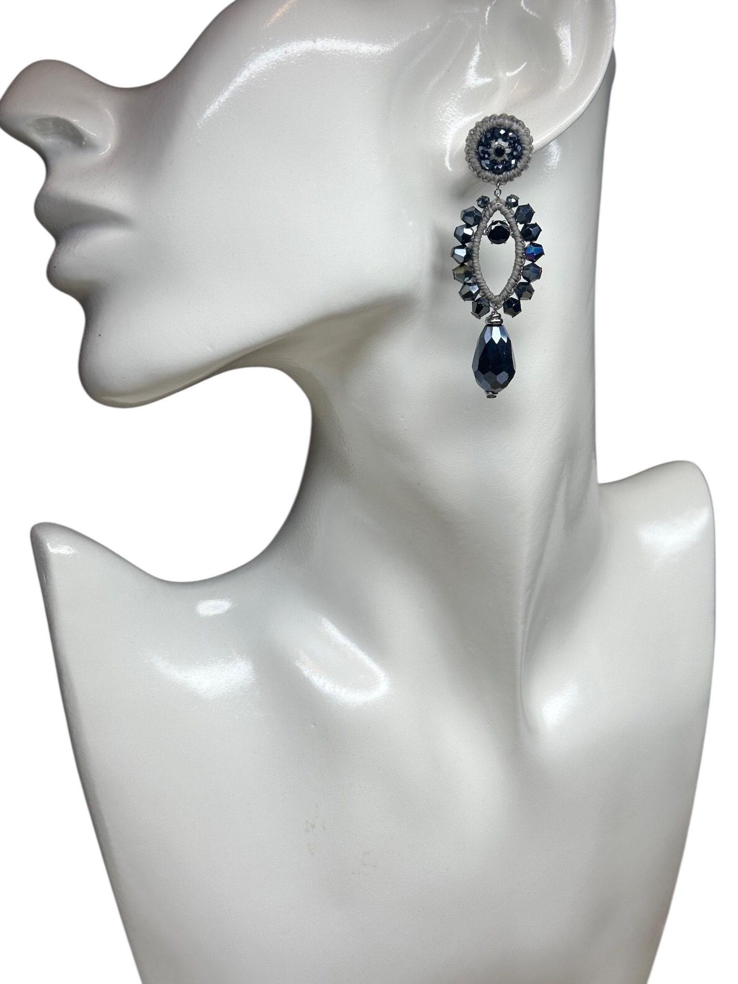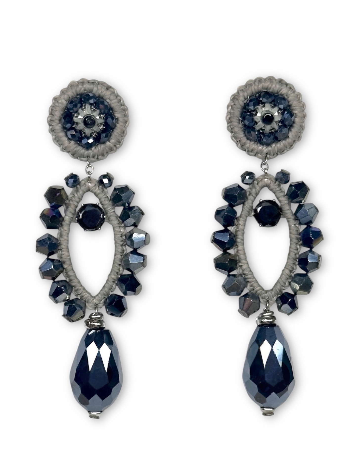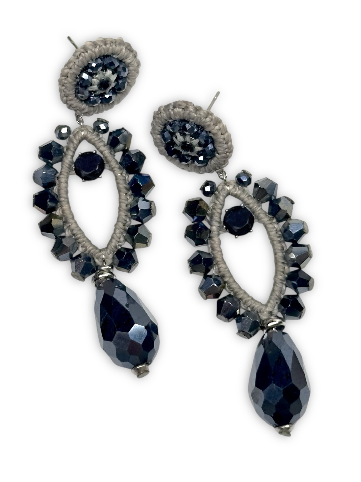Material: Edelstahl, Silikon-Ohrringverschlüsse (10 mm Ø), Facettierte Glasperlen, Gewachstes Garn, Strasssteine