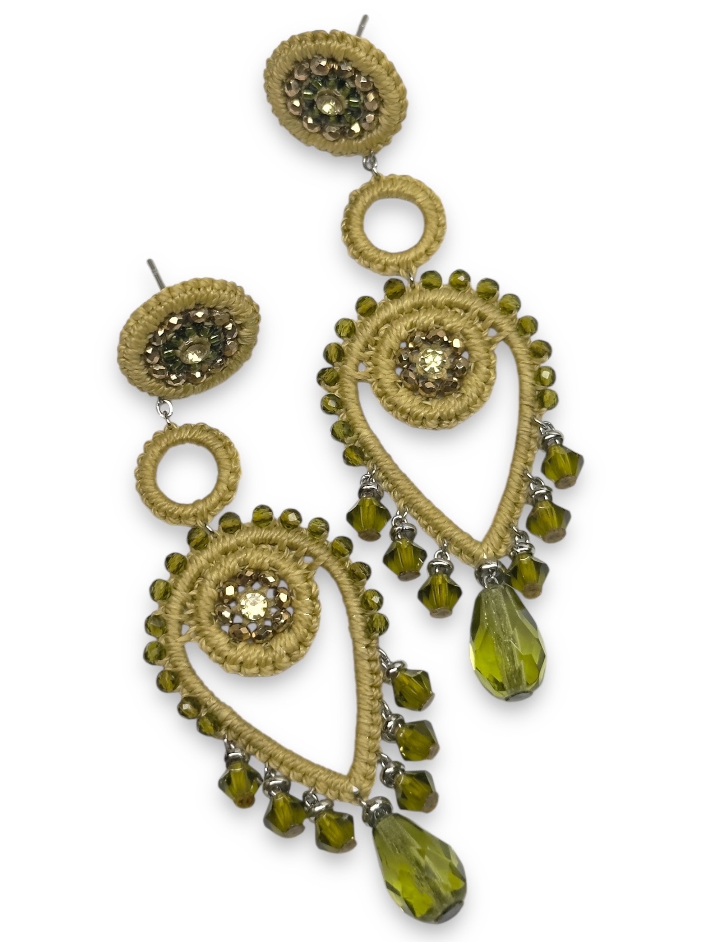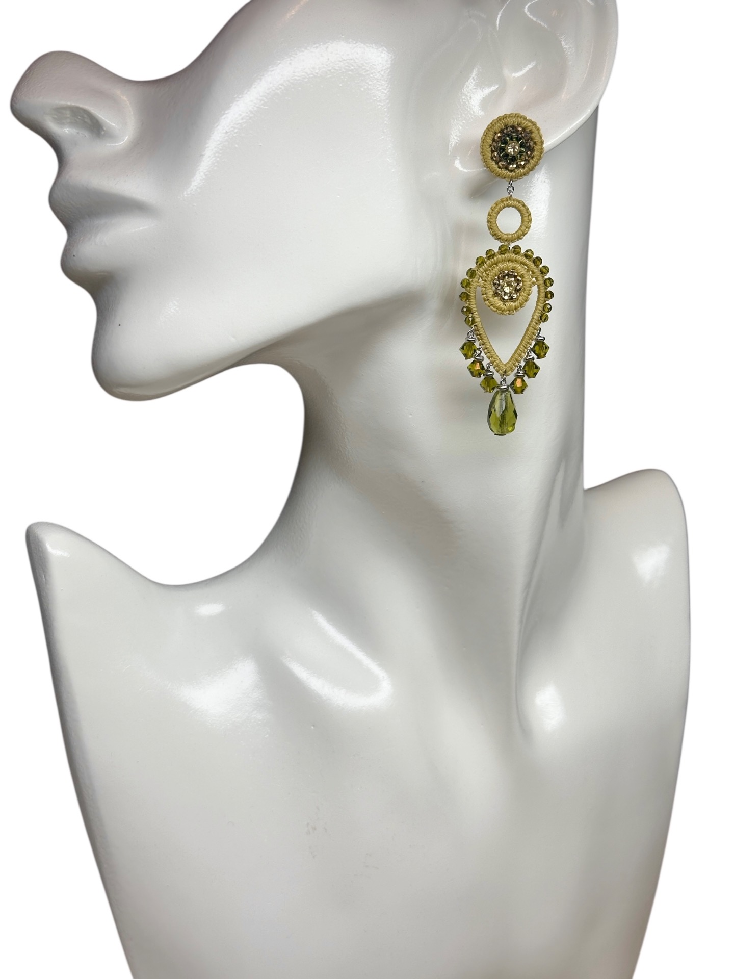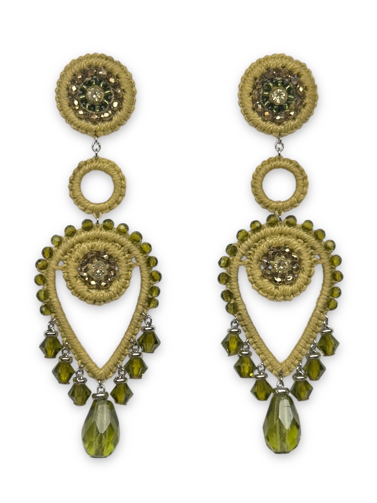 Material: Edelstahl, Silikon-Ohrringverschlüsse (10 mm Ø), Facettierte Glasperlen, Toho Perlen, Gewachstes Garn, Strasssteine