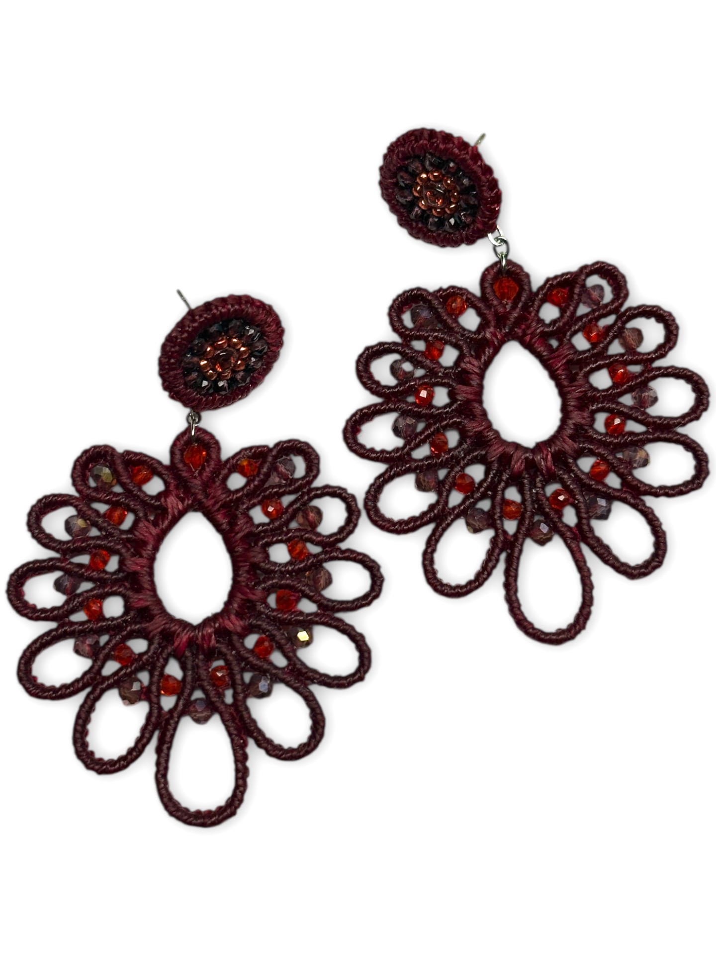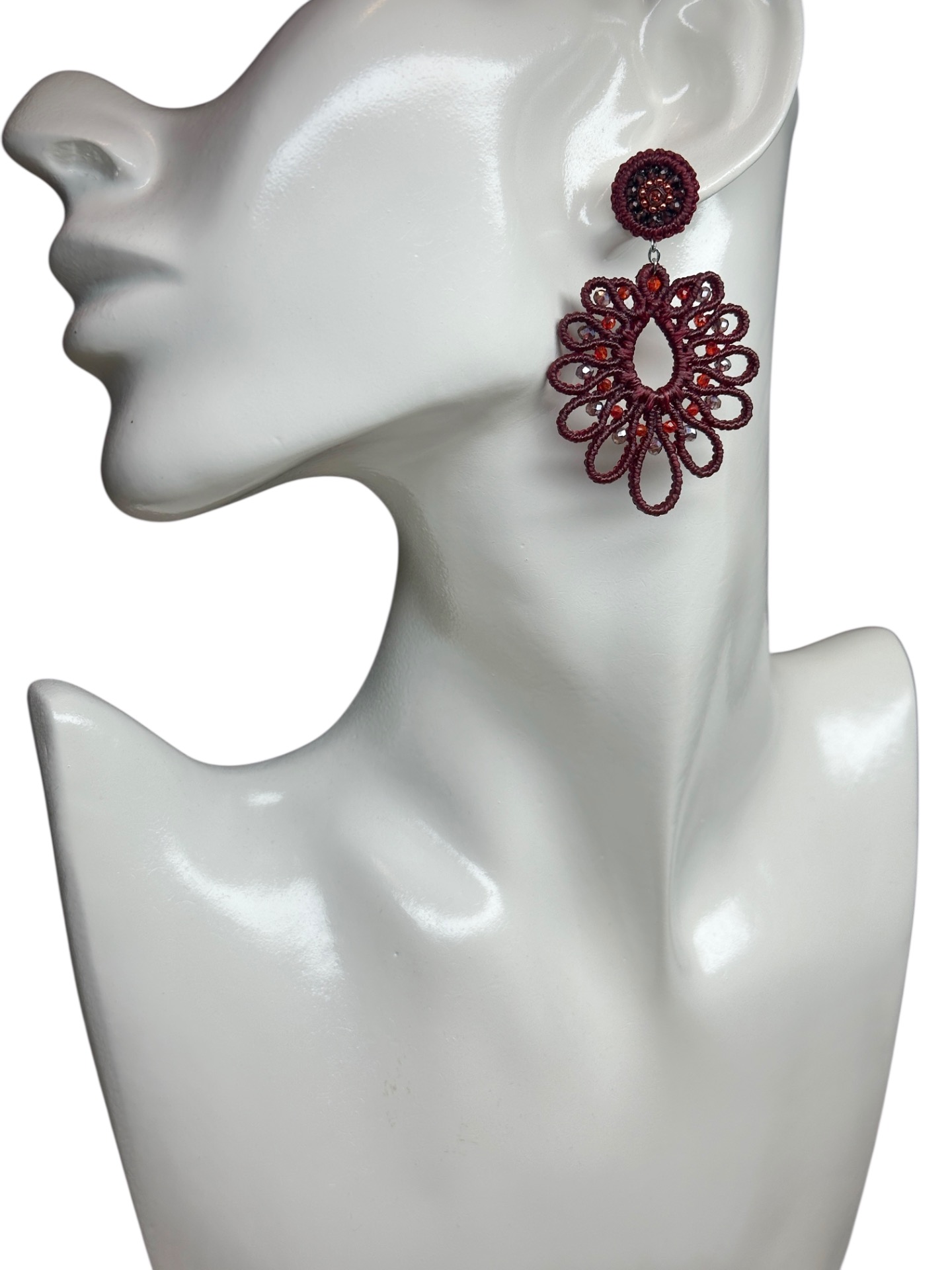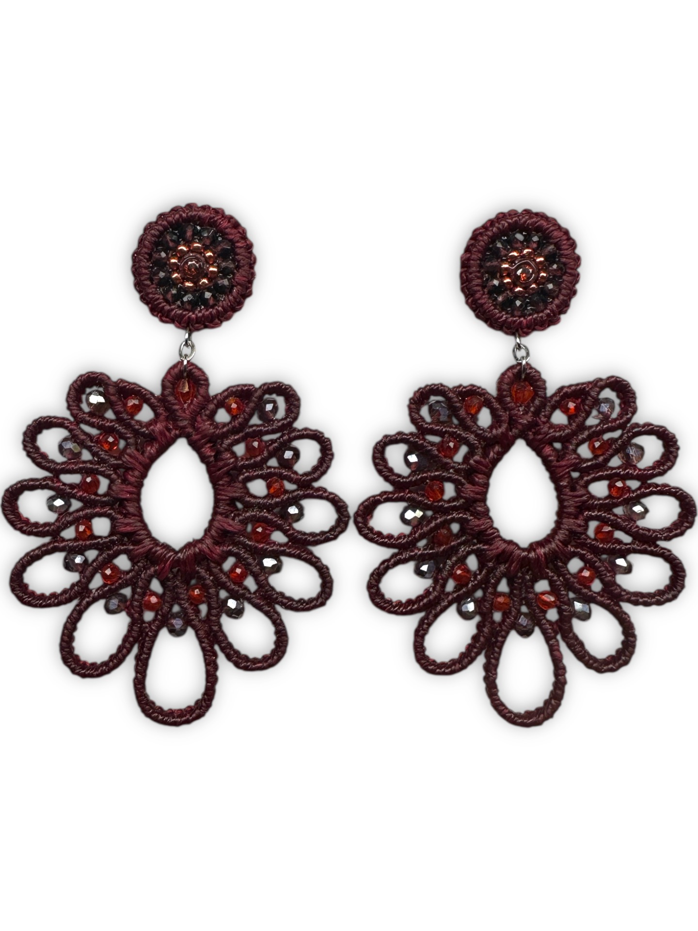 Material: Edelstahl, Silikon-Ohrringverschlüsse (10 mm Ø), Facettierte Glasperlen, Miyuki Perlen, Gewachstes Garn, Strasssteine