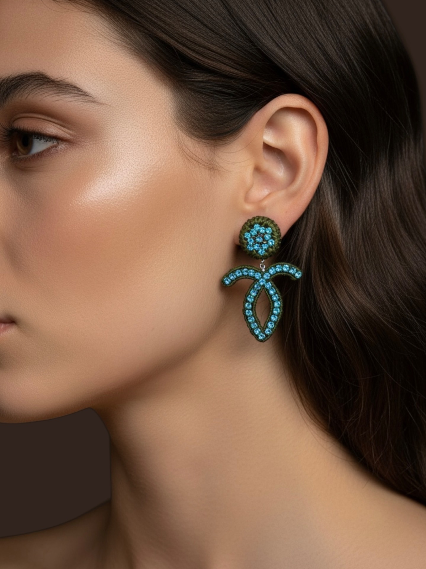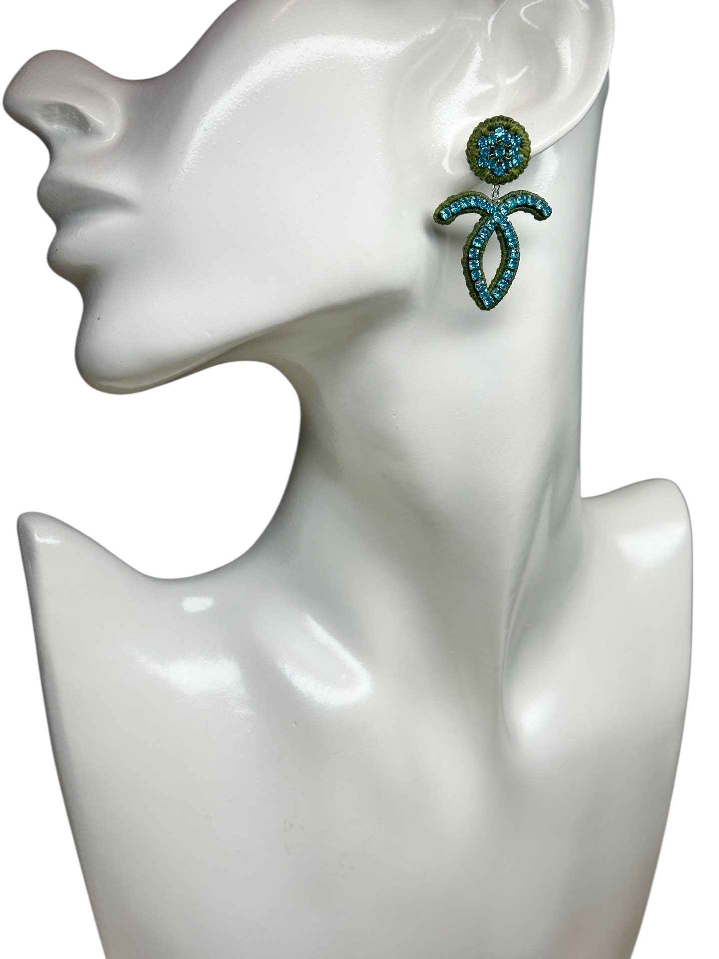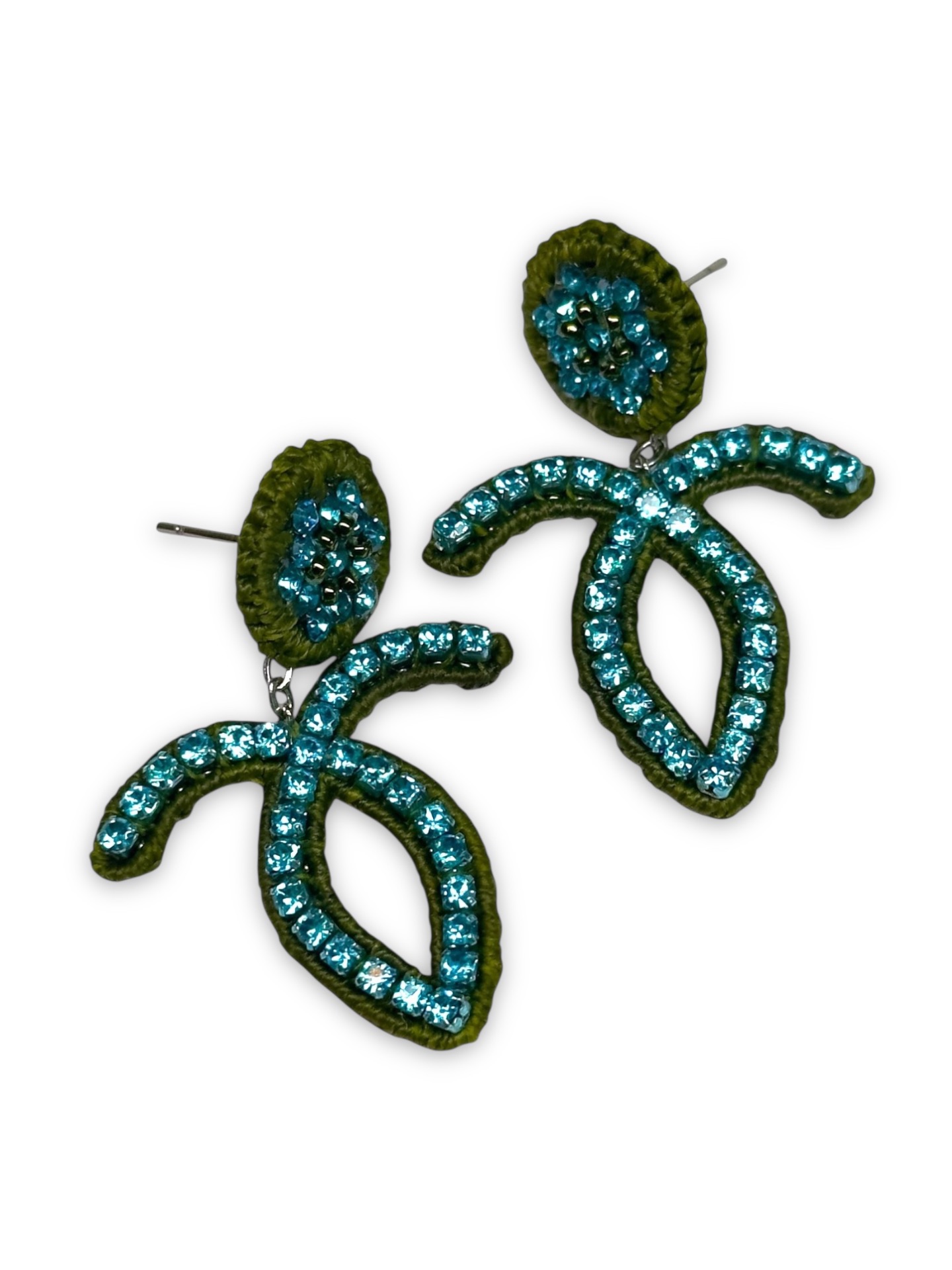 Material: Edelstahl, Silikon-Ohrringverschlüsse (10 mm Ø), Strasssteine, Miyuki Perlen, Gewachstes Garn