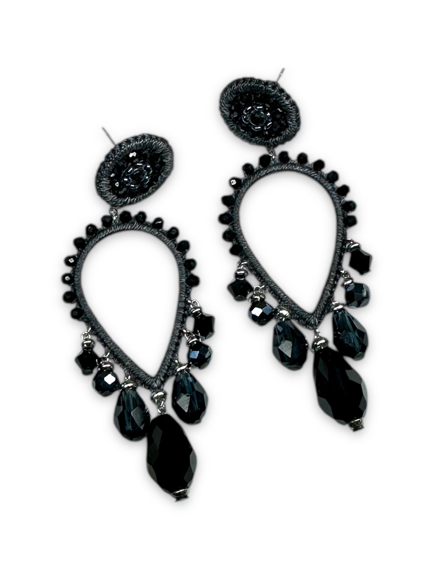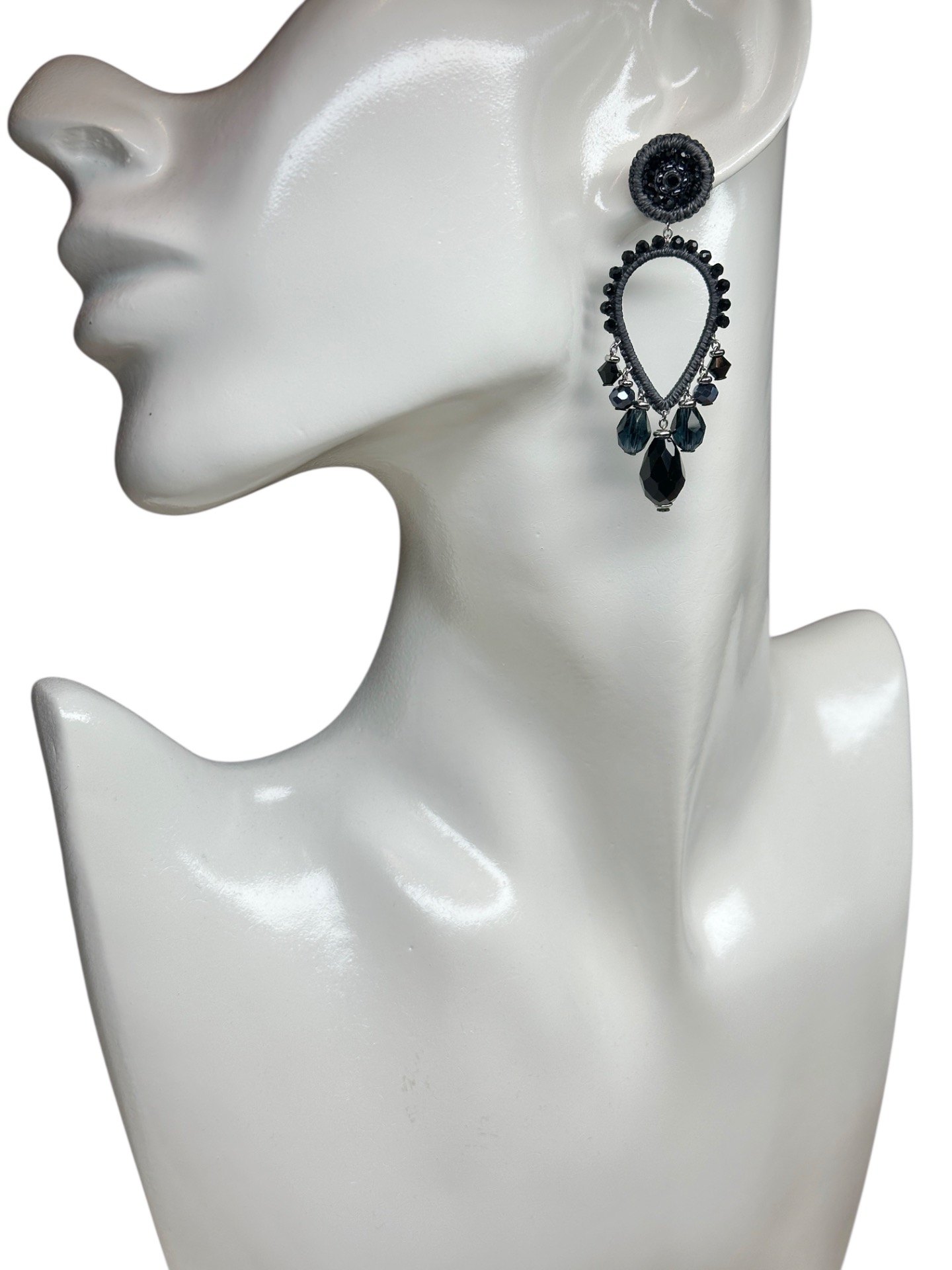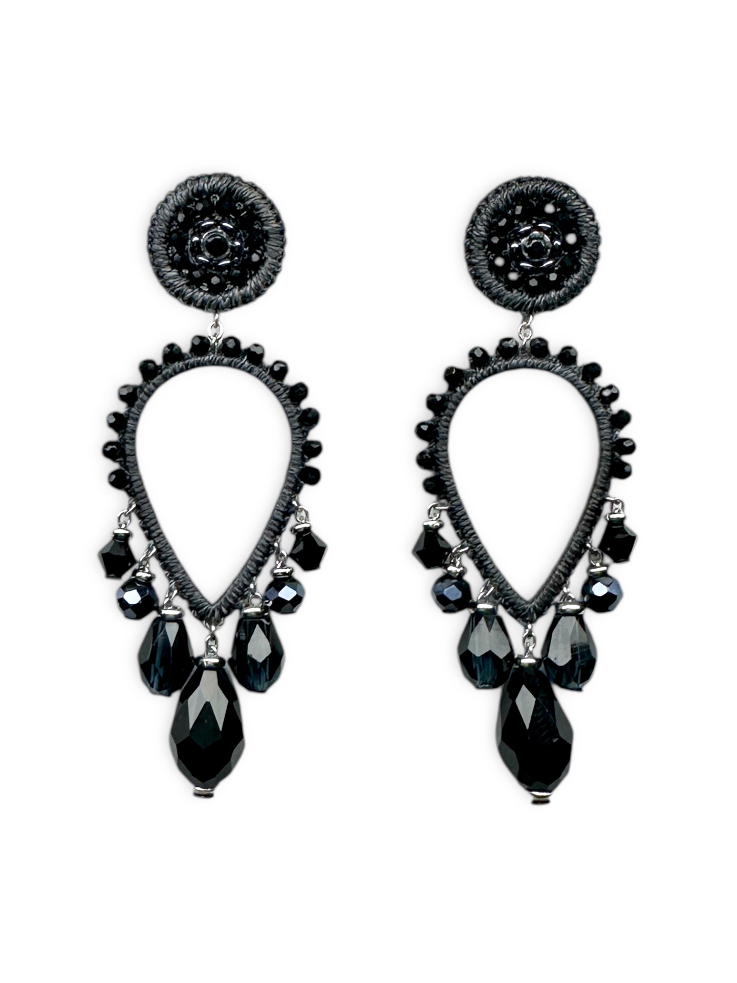 Material: Edelstahl, Silikon-Ohrringverschlüsse (10 mm Ø), Facettierte Glasperlen, Toho Perlen, Gewachstes Garn, Strasssteine