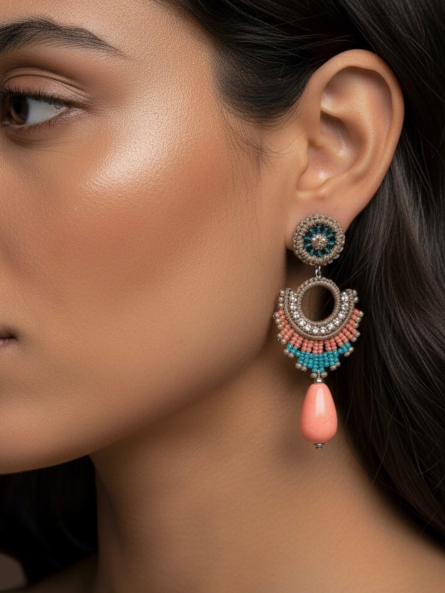 Material: Edelstahl, Silikon-Ohrringverschlüsse (10 mm Ø), Facettierte Glasperlen, Miyuki Perlen, Keramikperlen, Gewachstes Garn, Strassteine
