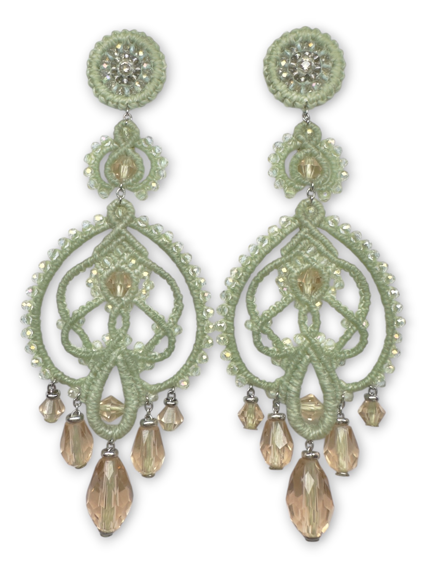 Material: Edelstahl, Silikon-Ohrringverschlüsse (10 mm Ø), Facettierte Glasperlen, Gewachstes Garn, Strasssteine