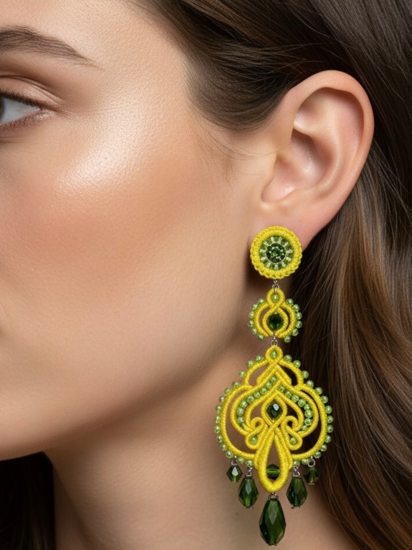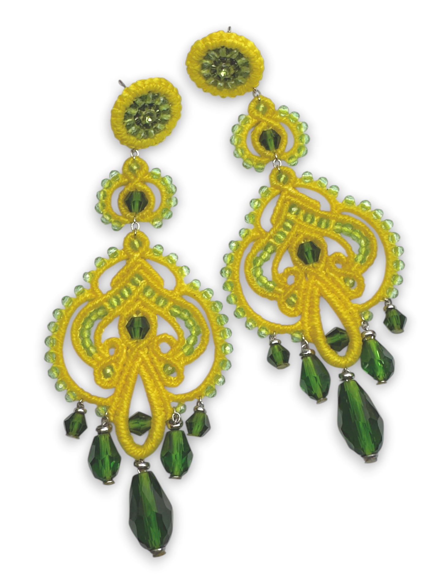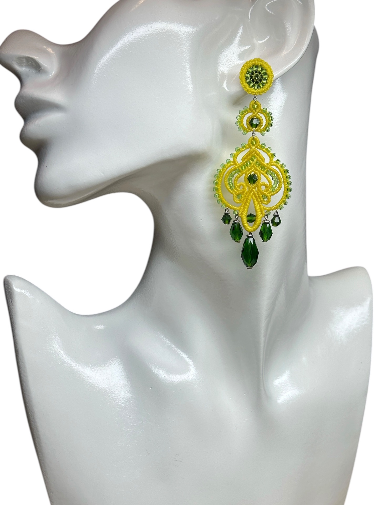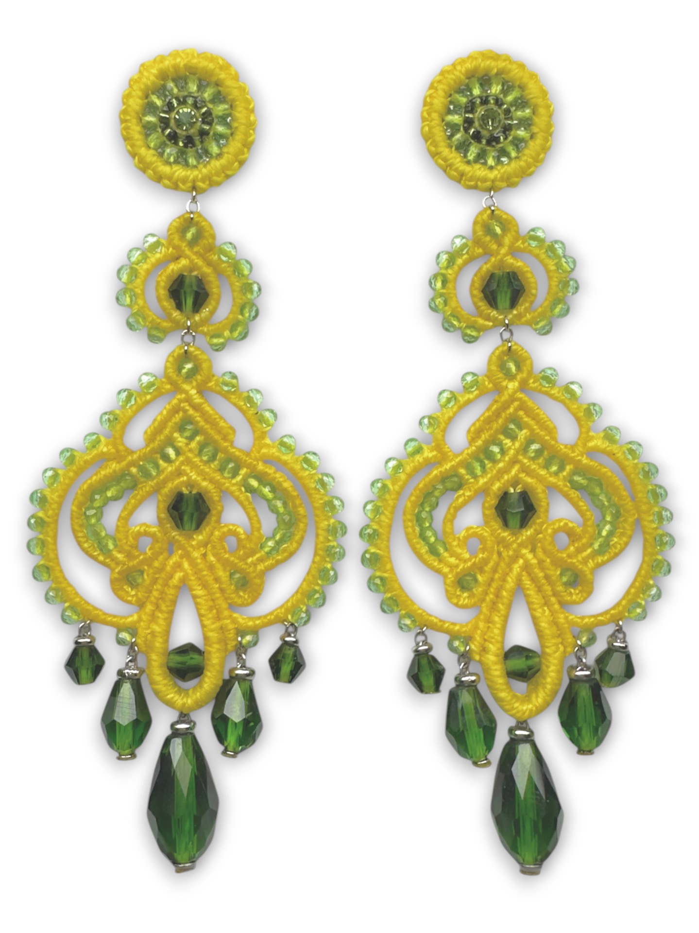Material: Edelstahl, Silikon-Ohrringverschlüsse (10 mm Ø), Facettierte Glasperlen, Toho Perlen, Gewachstes Garn, Strasssteine