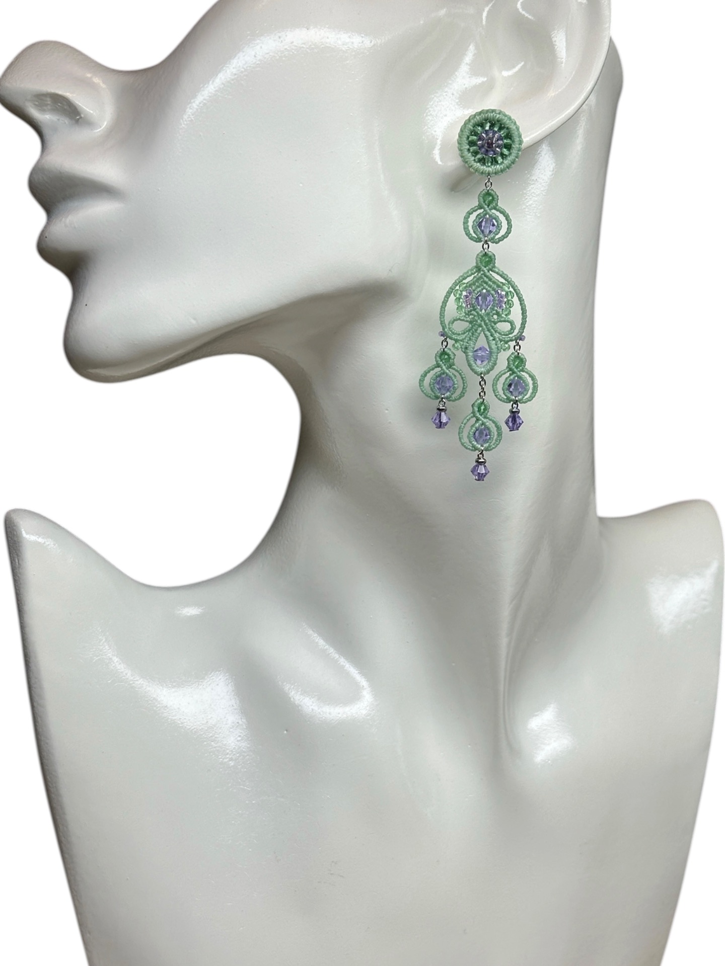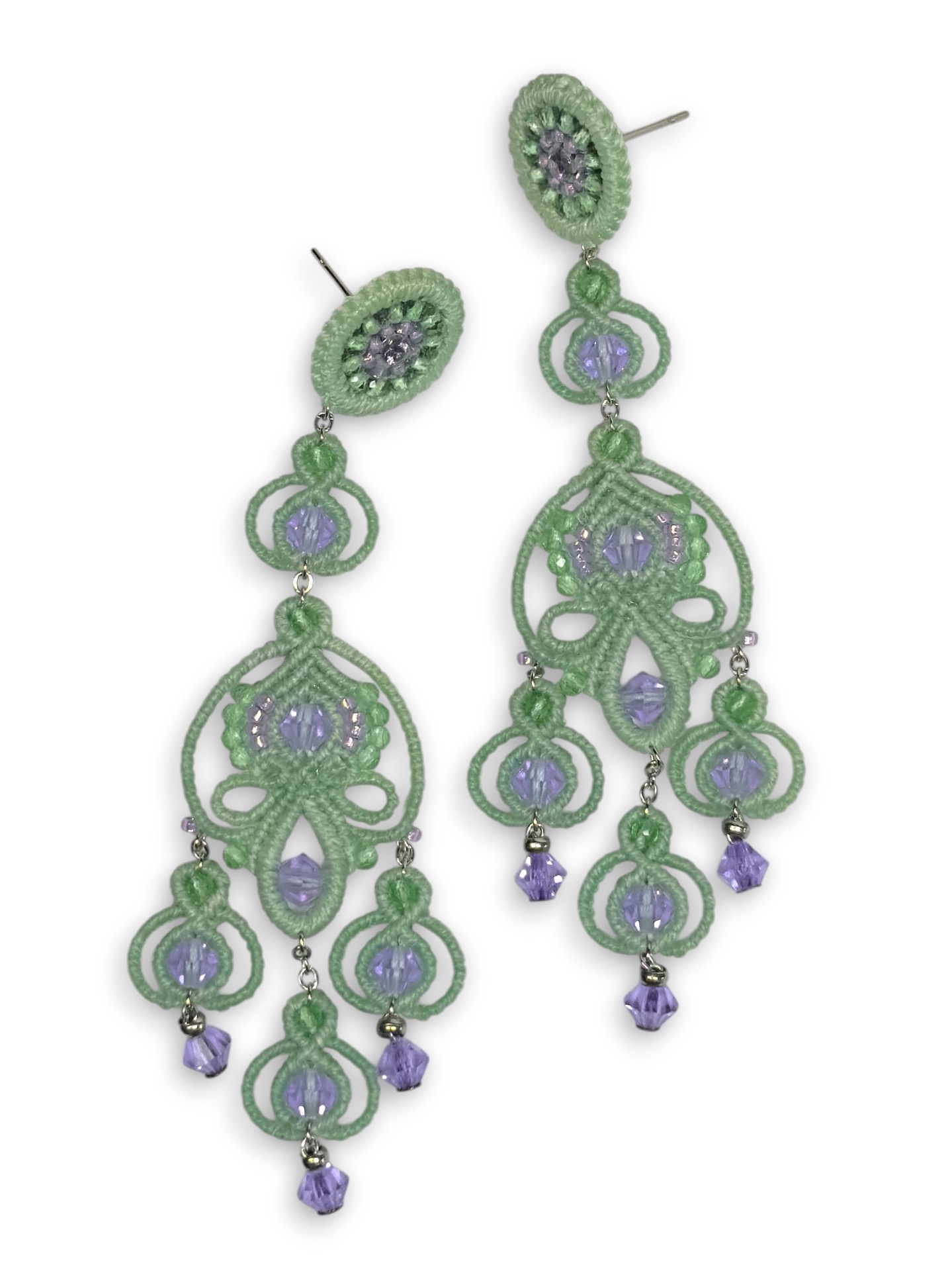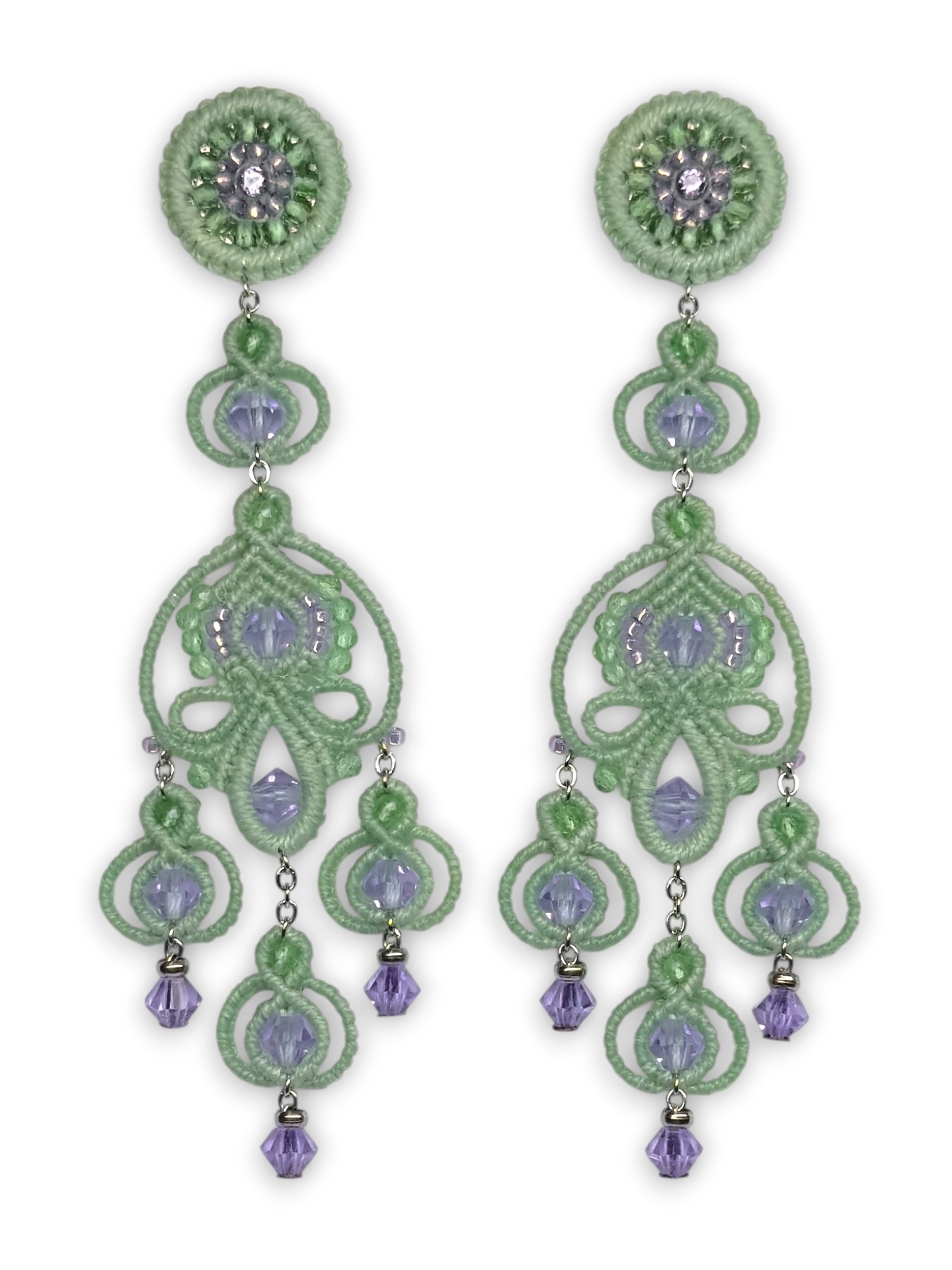 Material: Edelstahl, Silikon-Ohrringverschlüsse (10 mm Ø), Facettierte Glasperlen, Miyuki Perlen, Gewachstes Garn, Strasssteine
