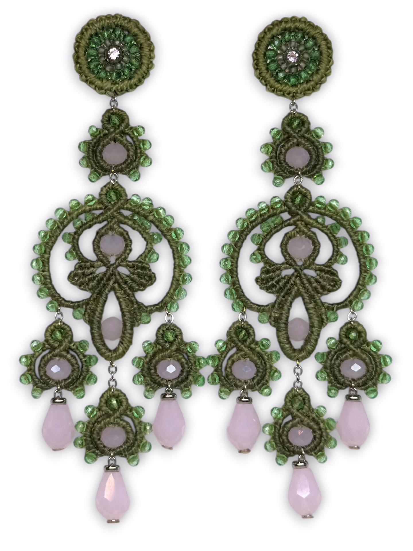 Material: Edelstahl, Silikon-Ohrringverschlüsse (10 mm Ø), Facettierte Glasperlen, Toho Perlen, Gewachstes Garn, Strasssteine