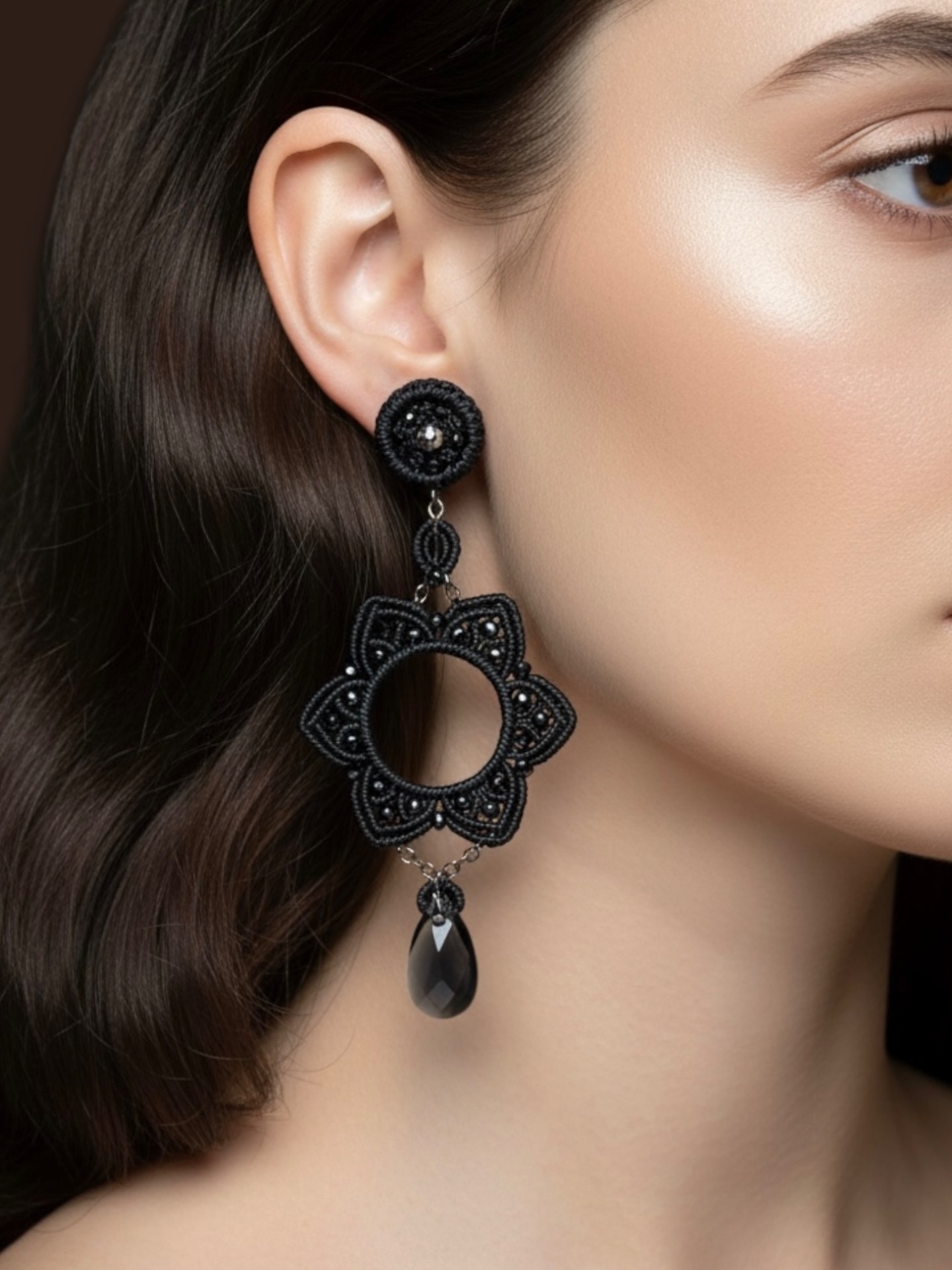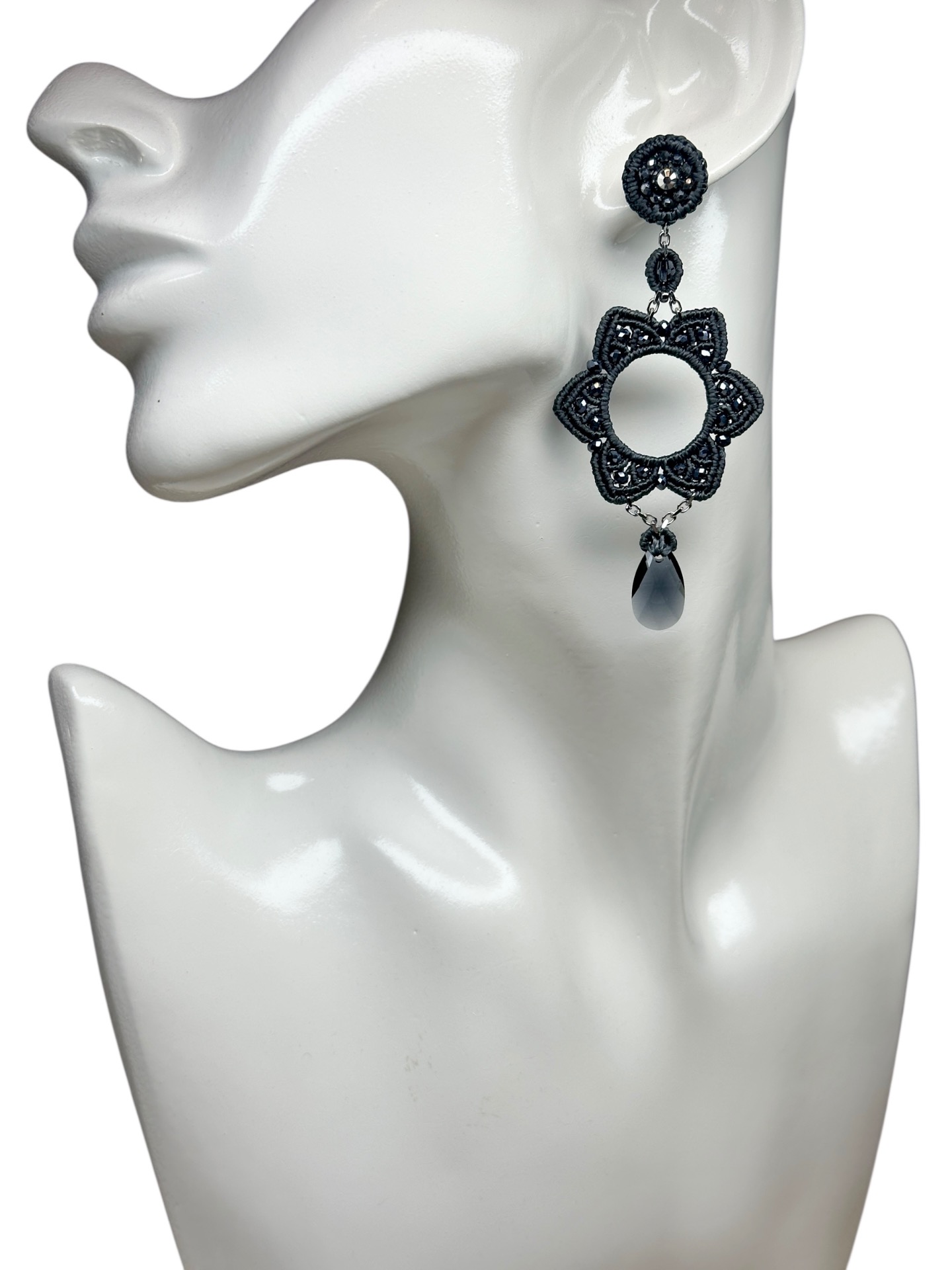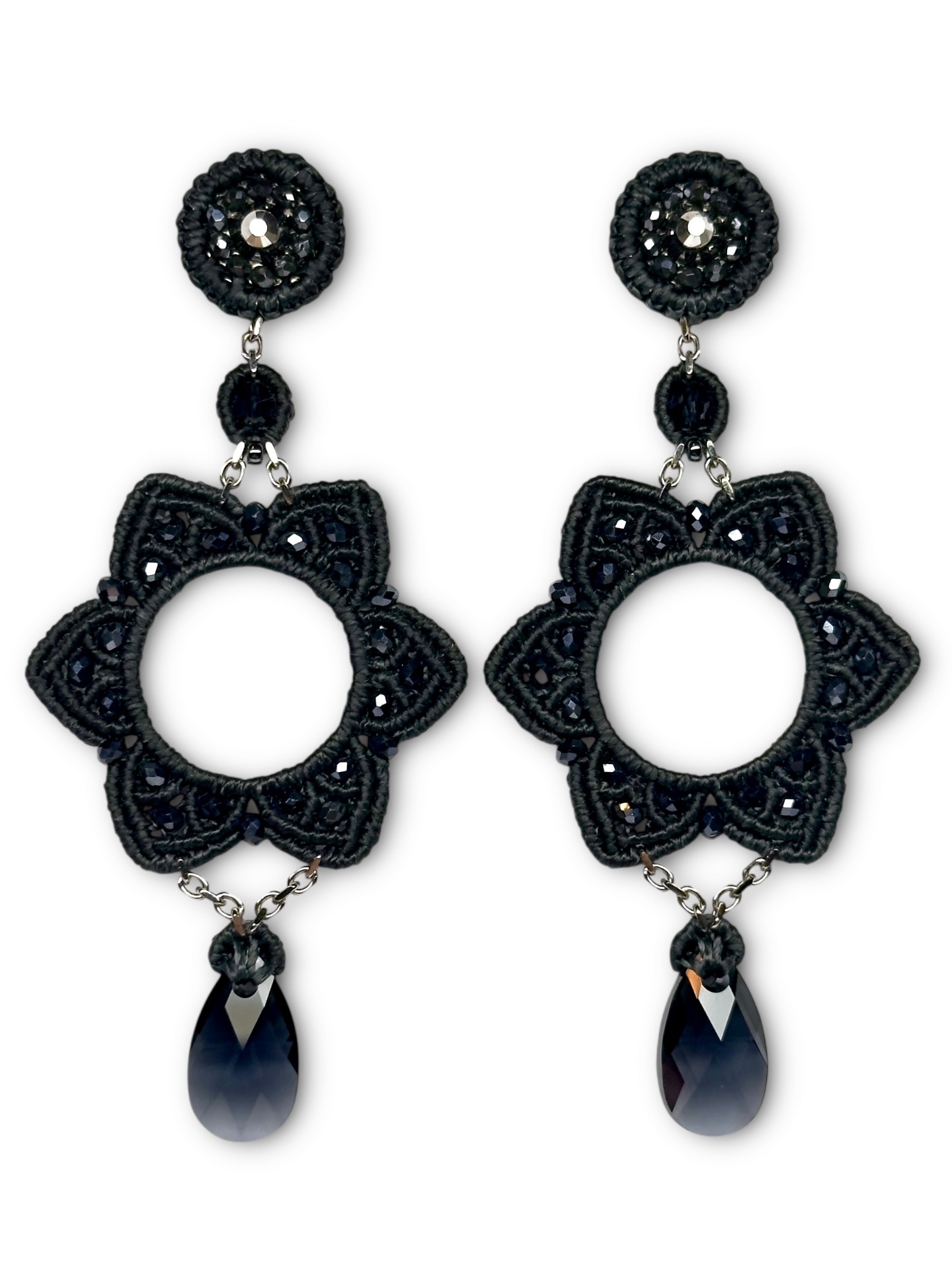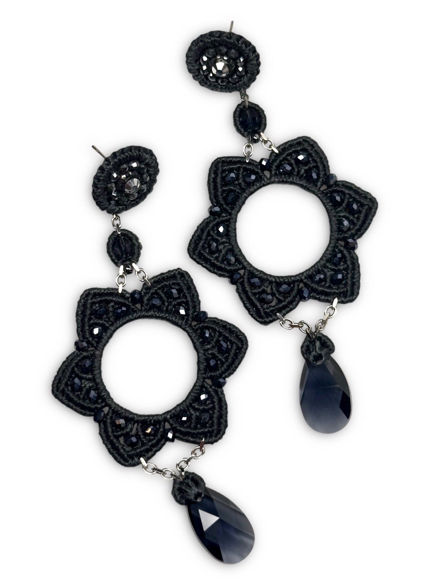 Material: Edelstahl, Silikon-Ohrringverschlüsse (10 mm Ø), Facettierte Glasperlen, Miyuki/Toho Perlen, Gewachstes Garn, Strasssteine