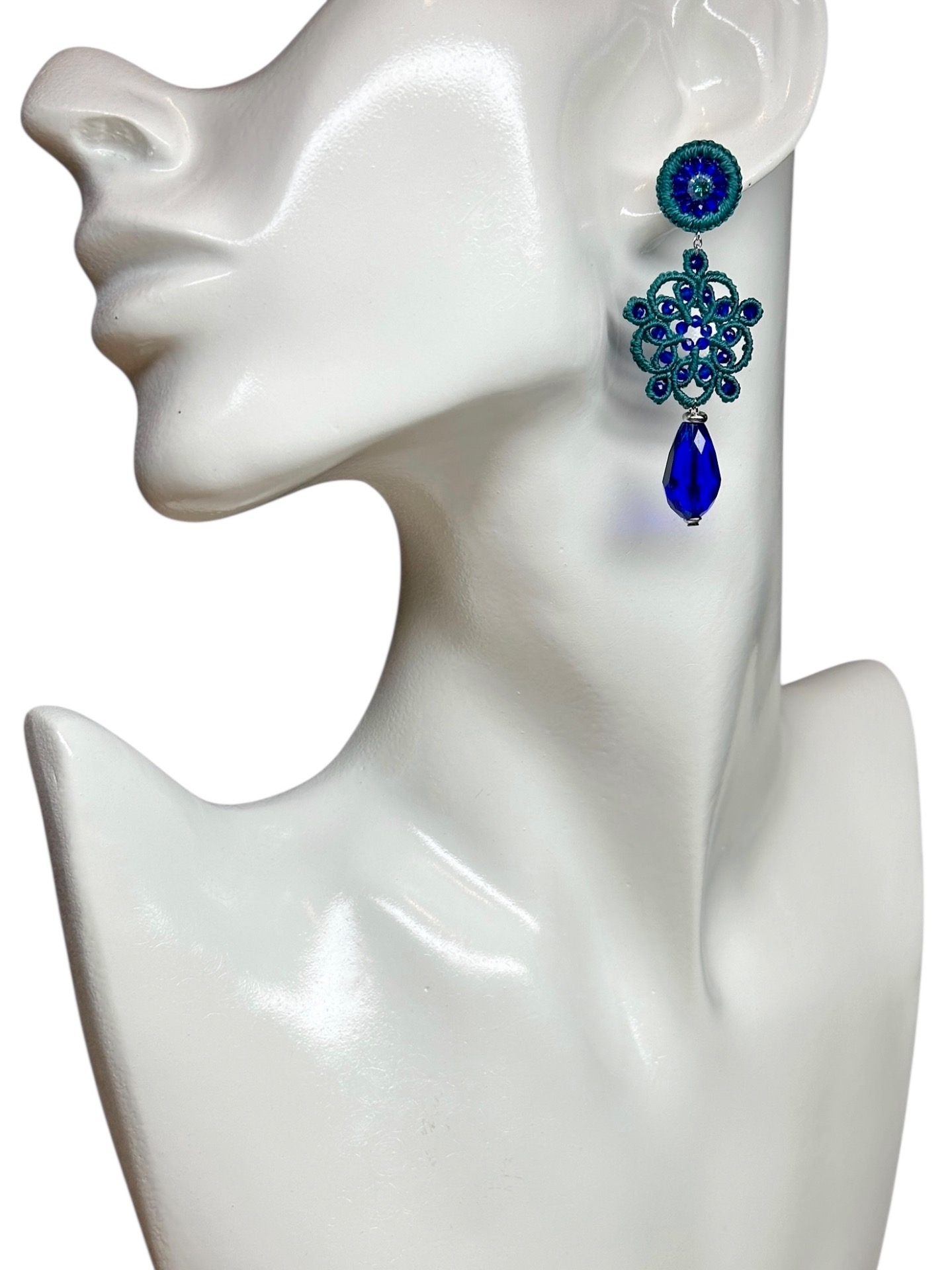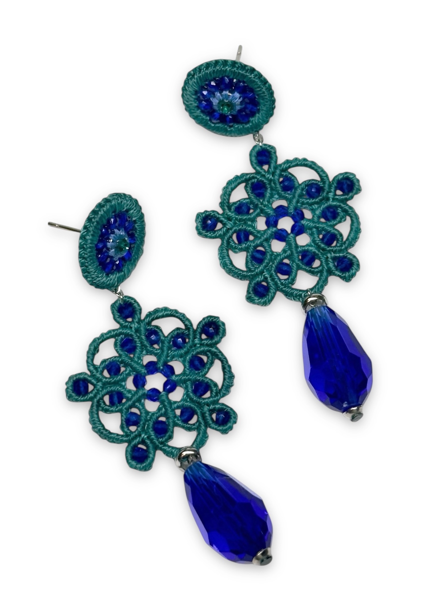 Material: Edelstahl, Silikon-Ohrringverschlüsse (10 mm Ø), Facettierte Glasperlen, Gewachstes Garn, Strasssteine
