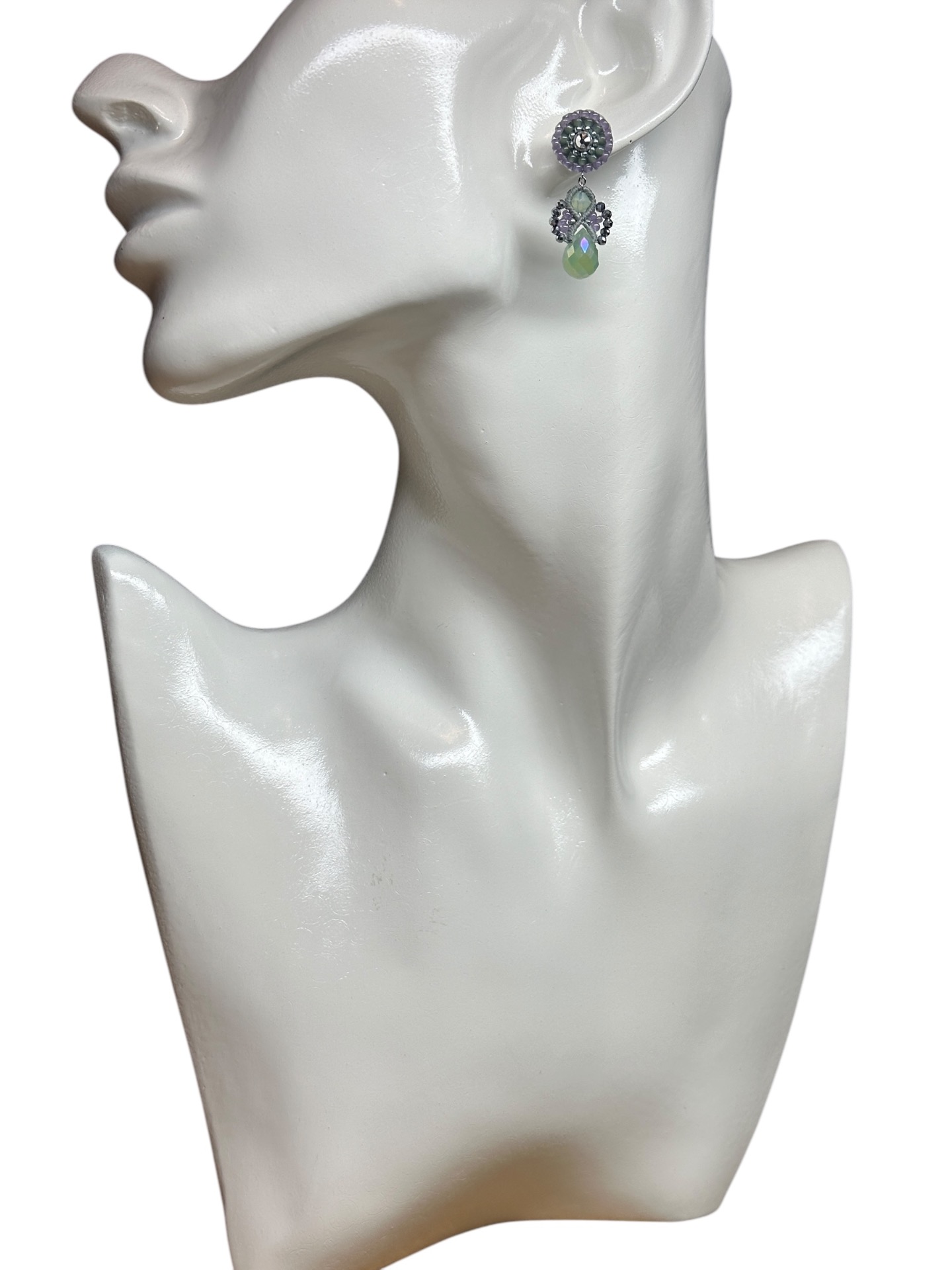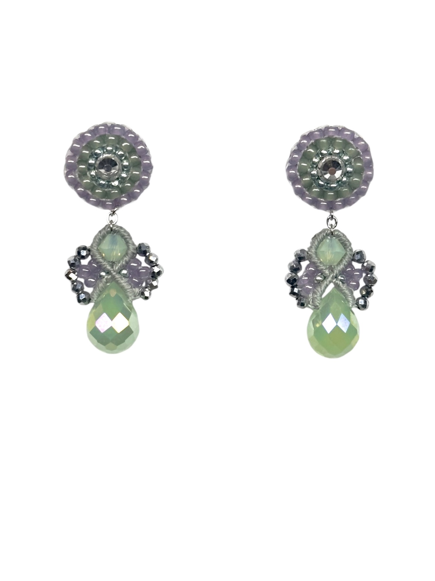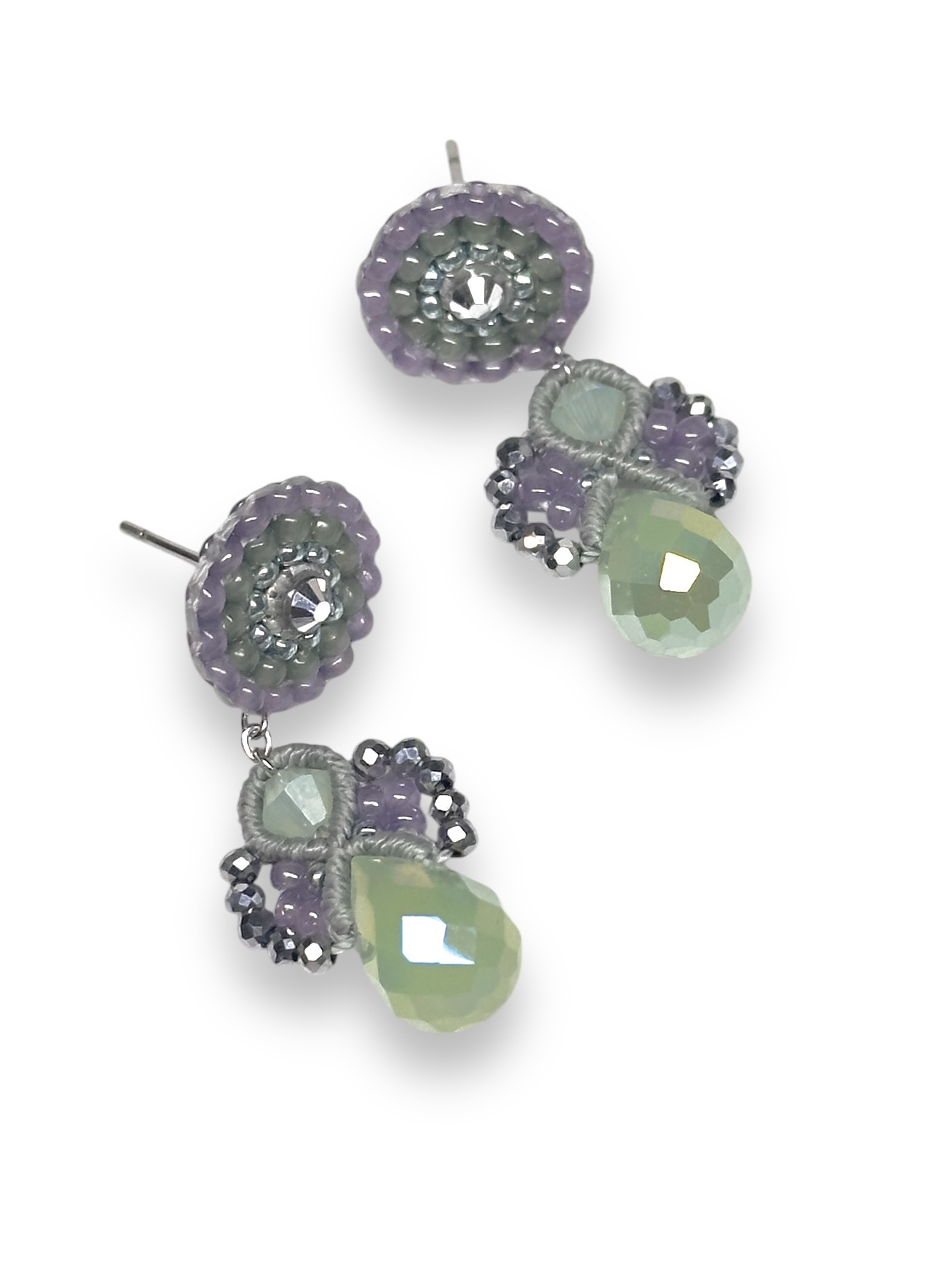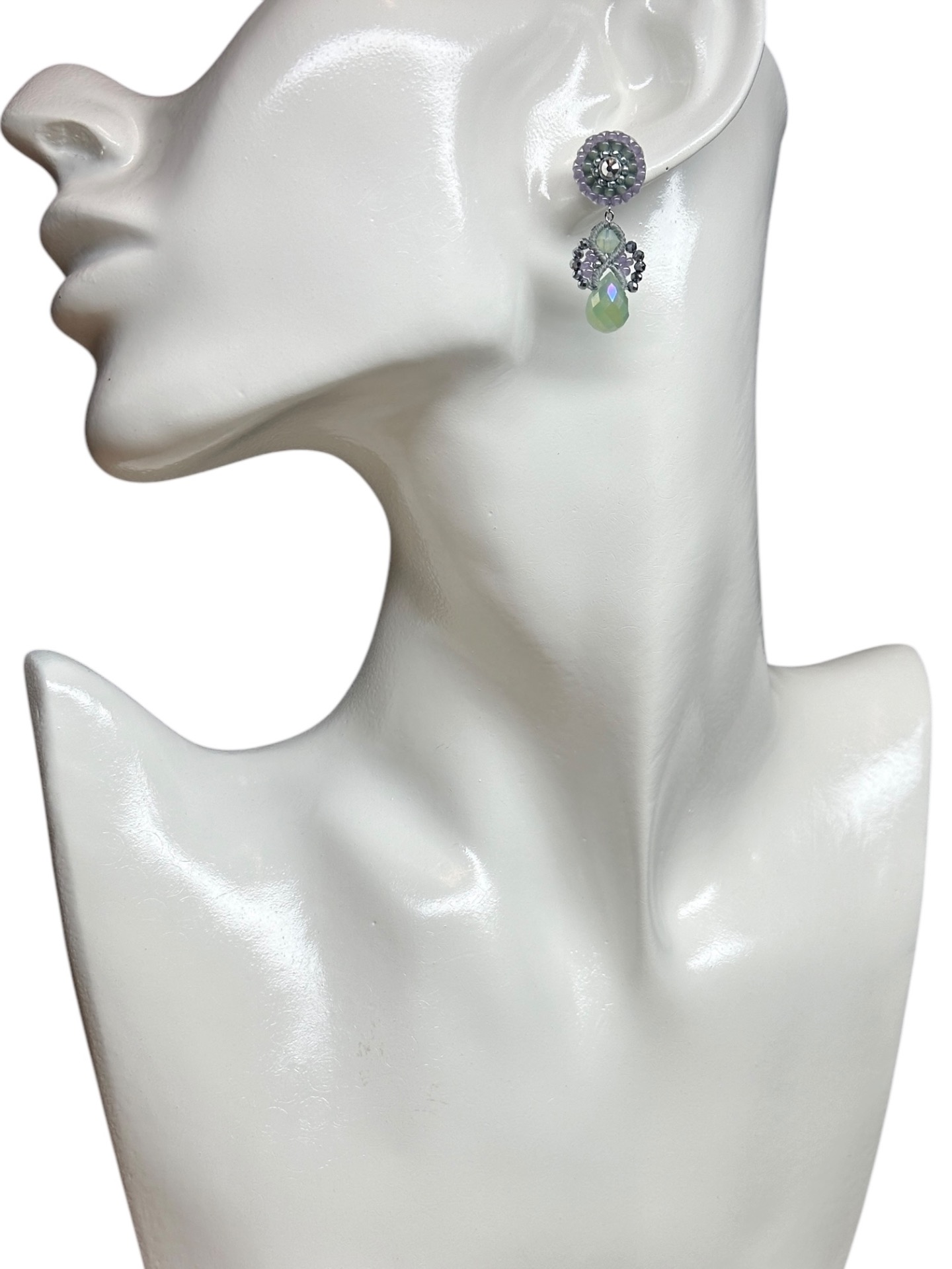 Material: Edelstahl, Silikon-Ohrringverschlüsse (10 mm Ø), Facettierte Glasperlen, Gewachstes Garn, Strasssteine