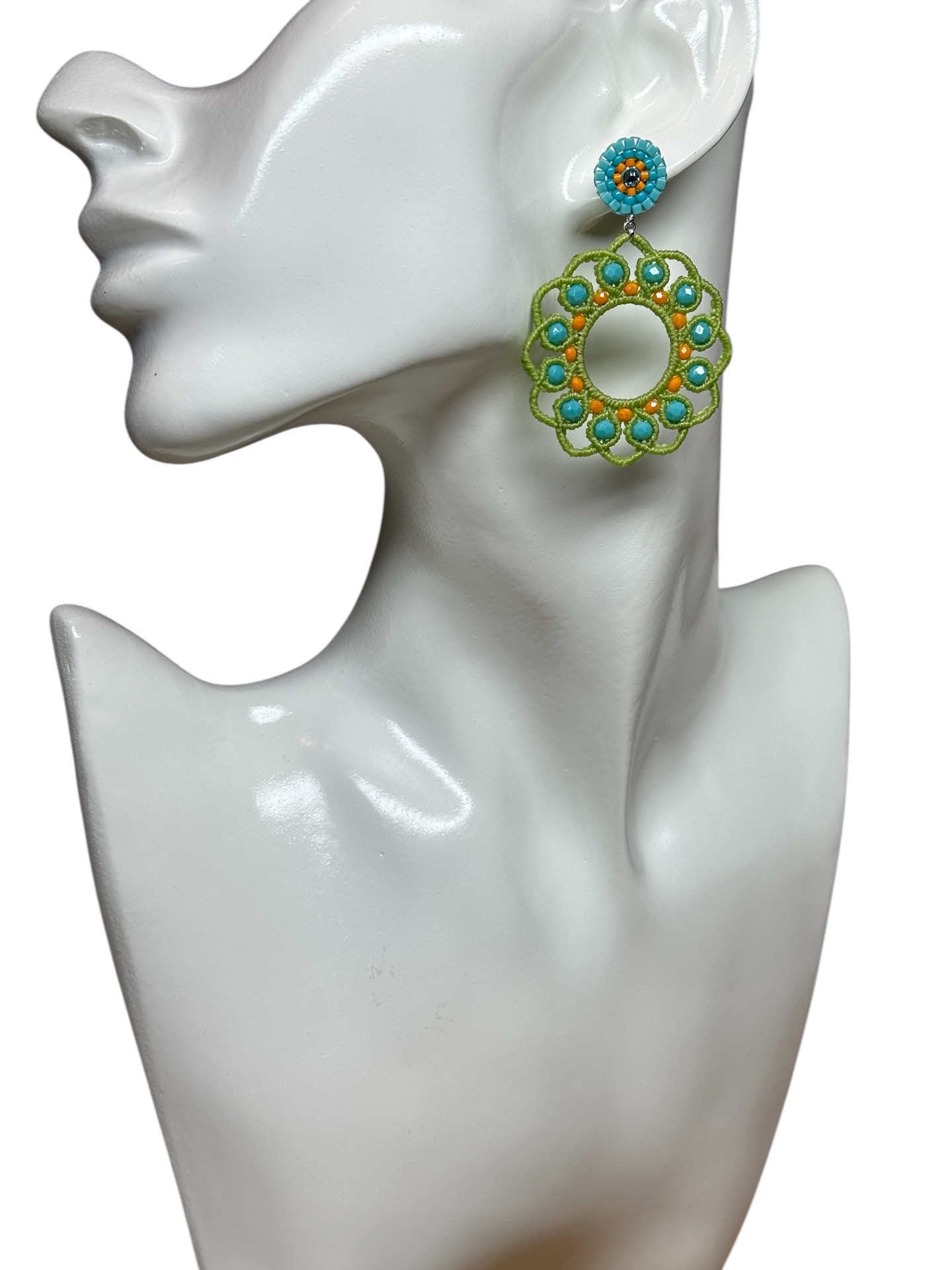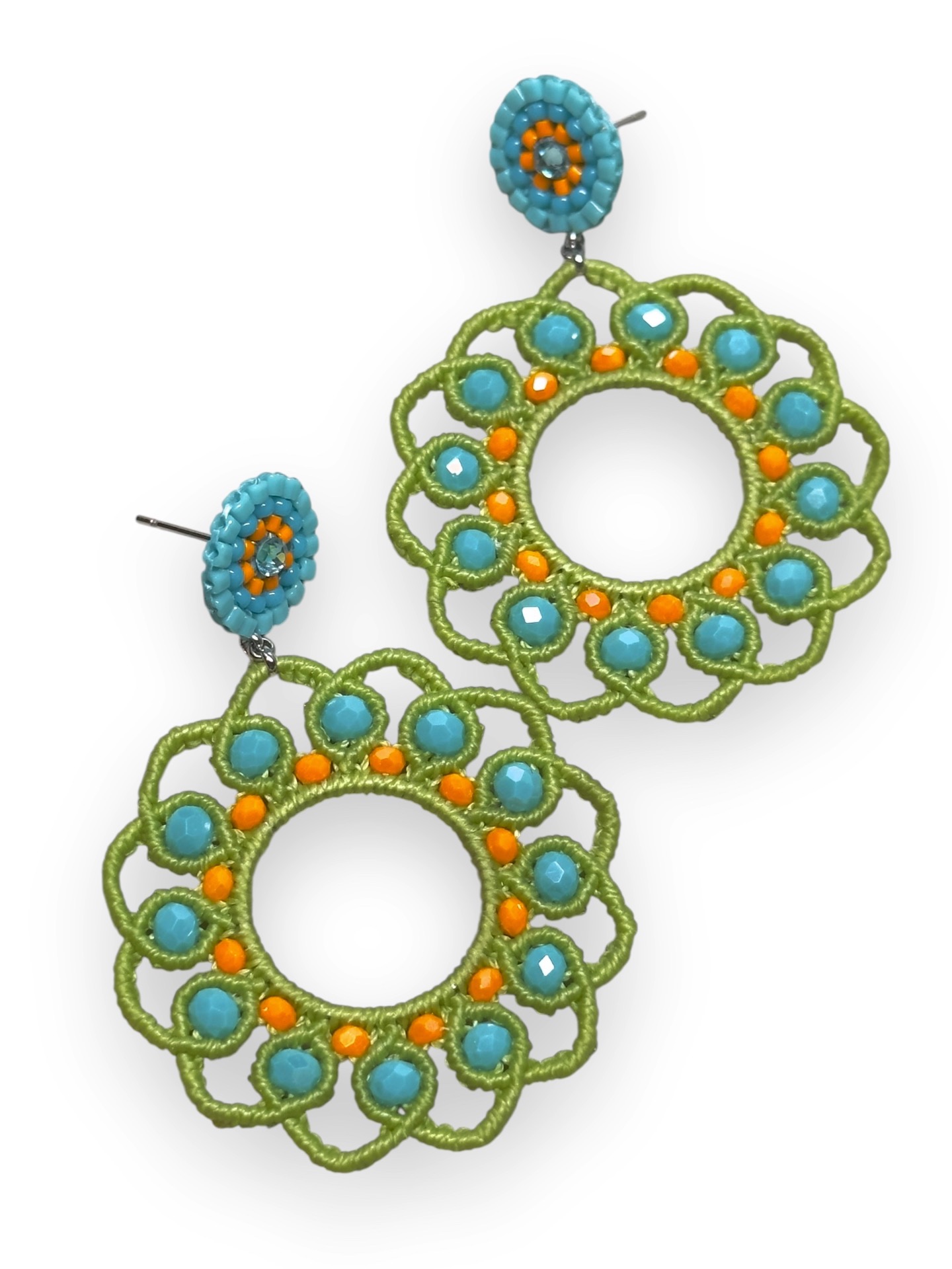 Material: Edelstahl, Silikon-Ohrringverschlüsse (10 mm Ø), Facettierte Glasperlen, Miyuki/Toho Perlen, Gewachstes Garn, Strasssteine