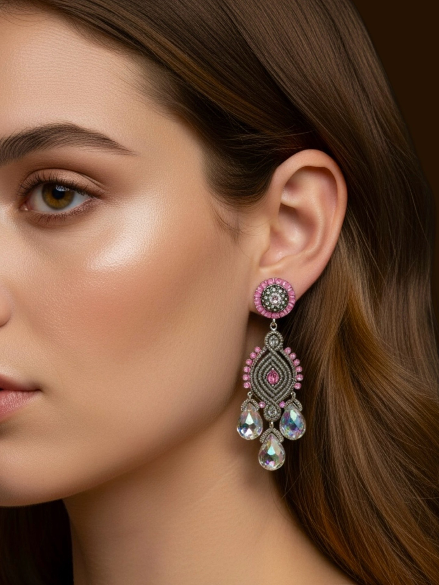Material: Edelstahl, Silikon-Ohrringverschlüsse (10 mm Ø), Facettierte Glasperlen, Miyuki Perlen, Gewachstes Garn, Strasssteine