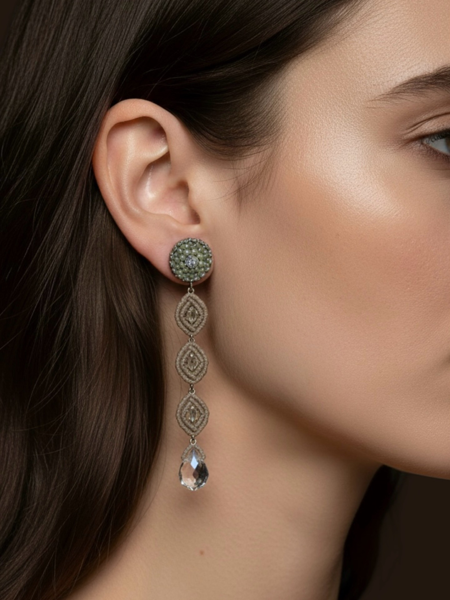 Material: Edelstahl, Silikon-Ohrringverschlüsse (10 mm Ø), Facettierte Glasperlen, Miyuki/Toho Perlen, Gewachstes Garn, Strasssteine