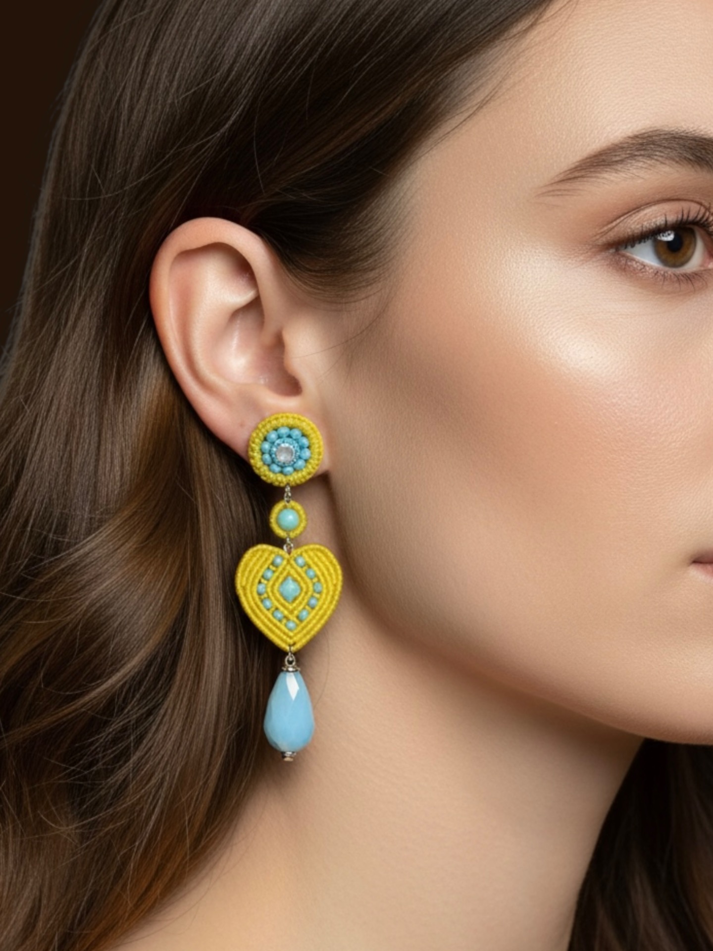 Material: Edelstahl, Silikon-Ohrringverschlüsse (10 mm Ø), Facettierte Glasperlen, Miyuki Perlen, Gewachstes Garn, Strasssteine