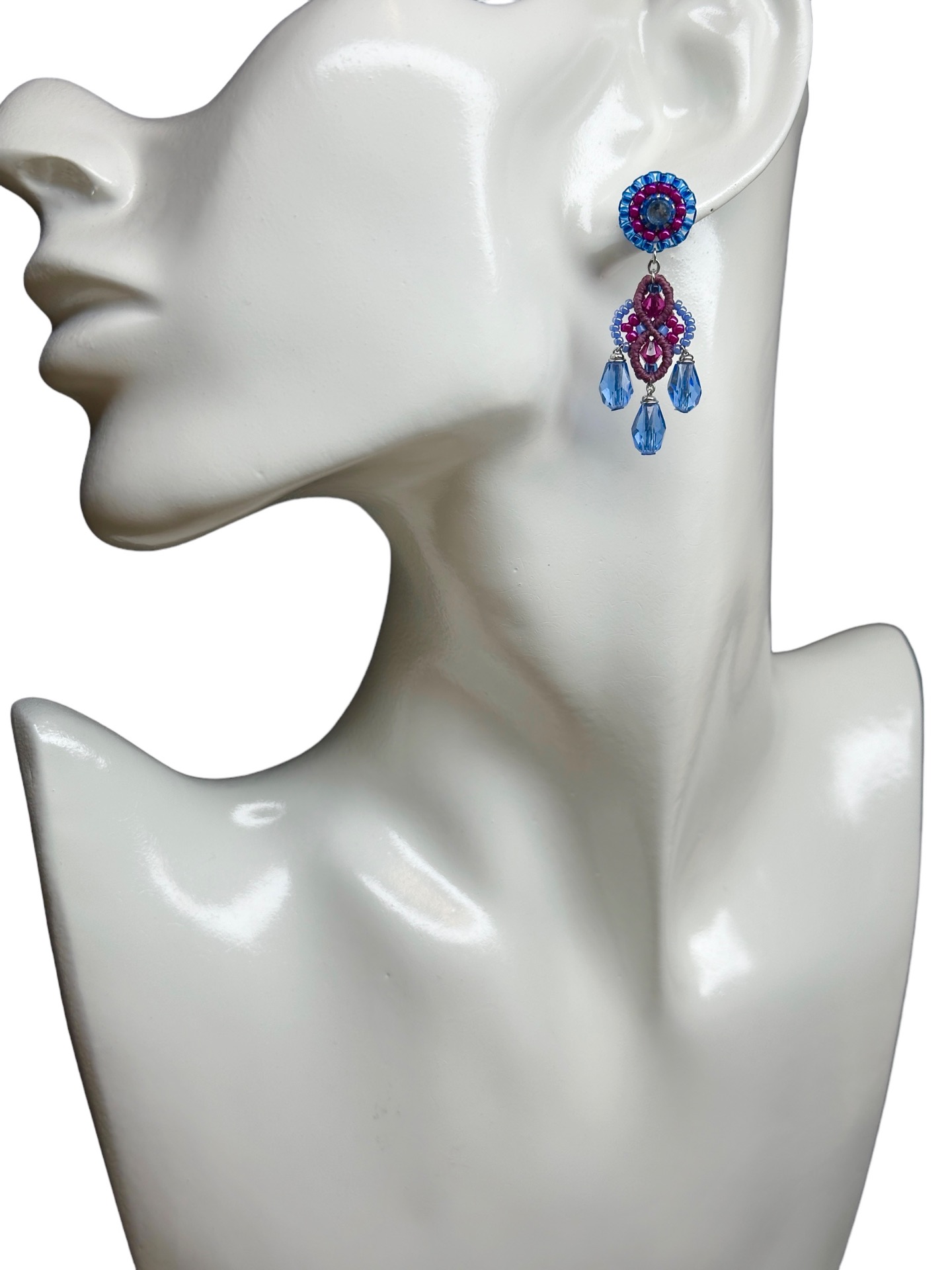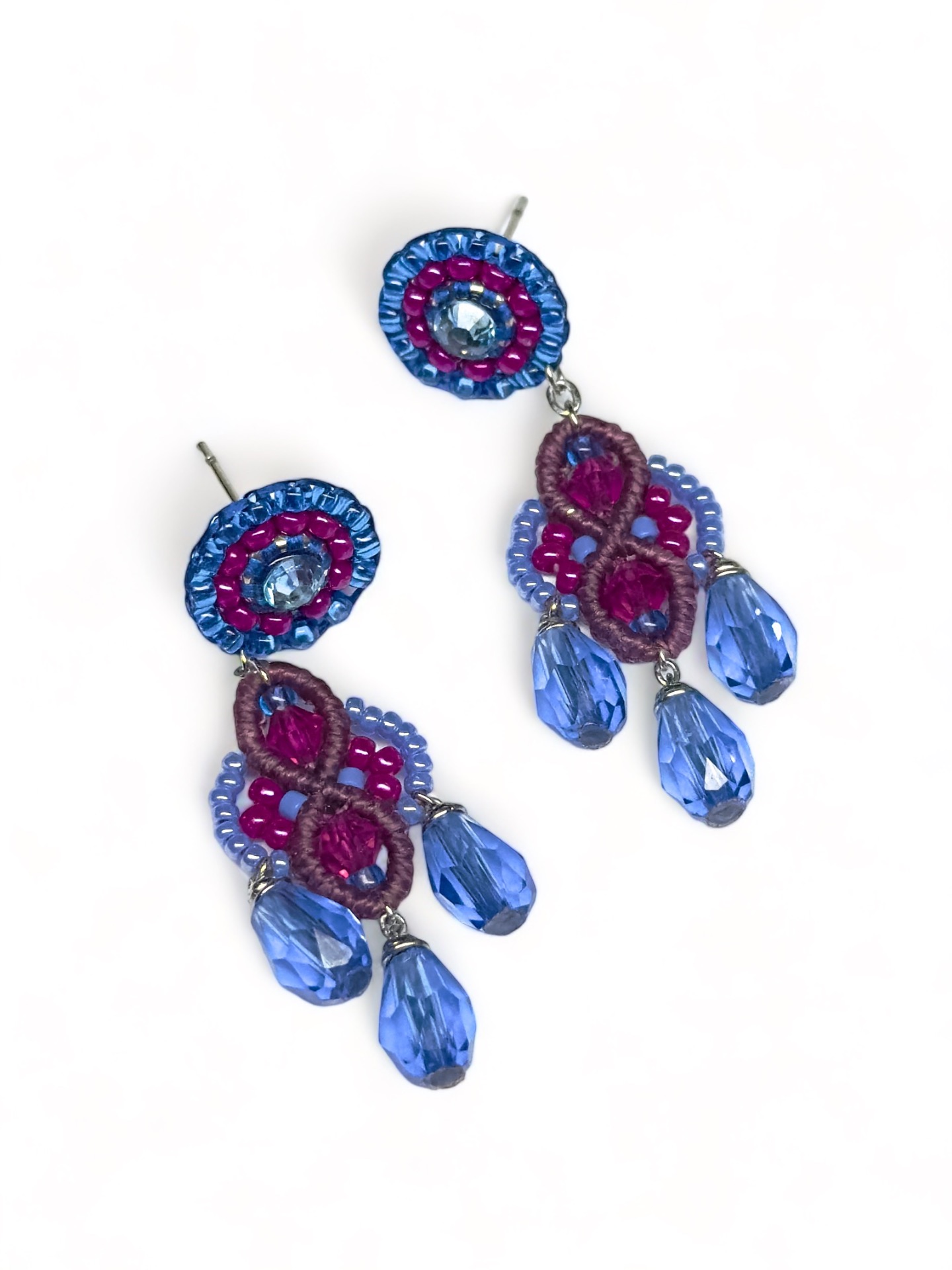 Material: Edelstahl, Silikon-Ohrringverschlüsse (10 mm Ø), Facettierte Glasperlen, Miyuki Perlen, Gewachstes Garn, Strasssteine