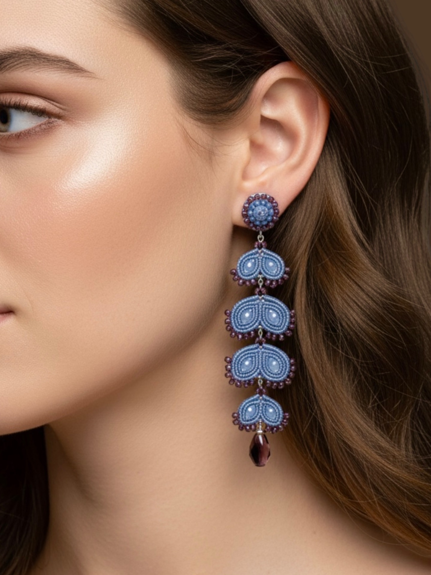 Material: Edelstahl, Silikon-Ohrringverschlüsse (10 mm Ø), Facettierte Glasperlen, Miyuki Perlen, Gewachstes Garn, Strasssteine