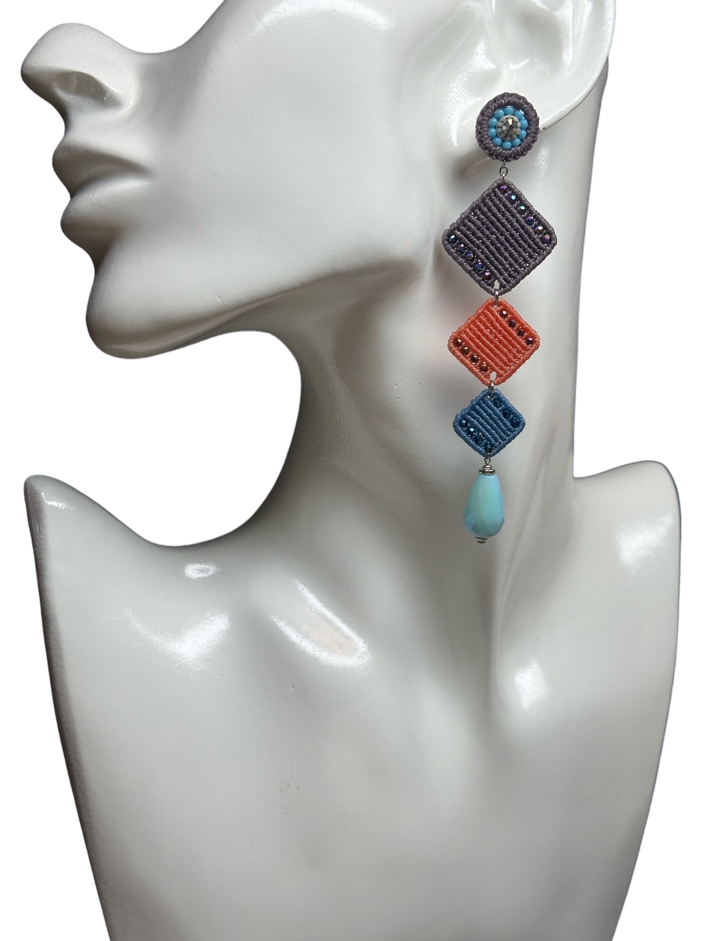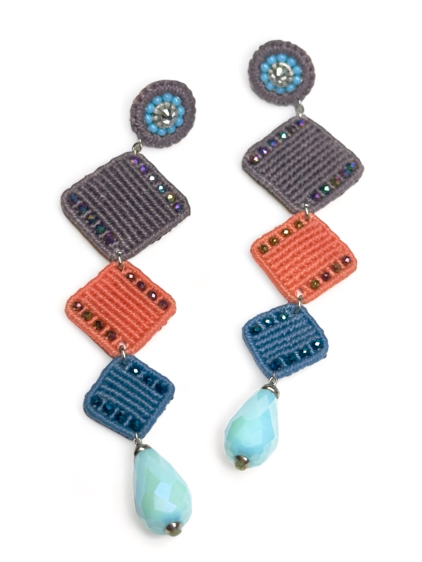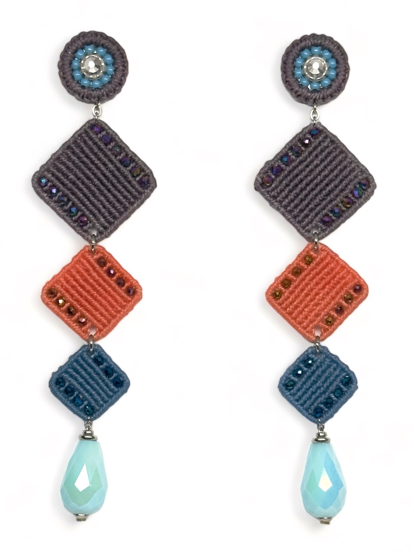 Material: Edelstahl, Silikon-Ohrringverschlüsse (10 mm Ø), Facettierte Glasperlen, Miyuki Perlen, Gewachstes Garn, Strasssteine