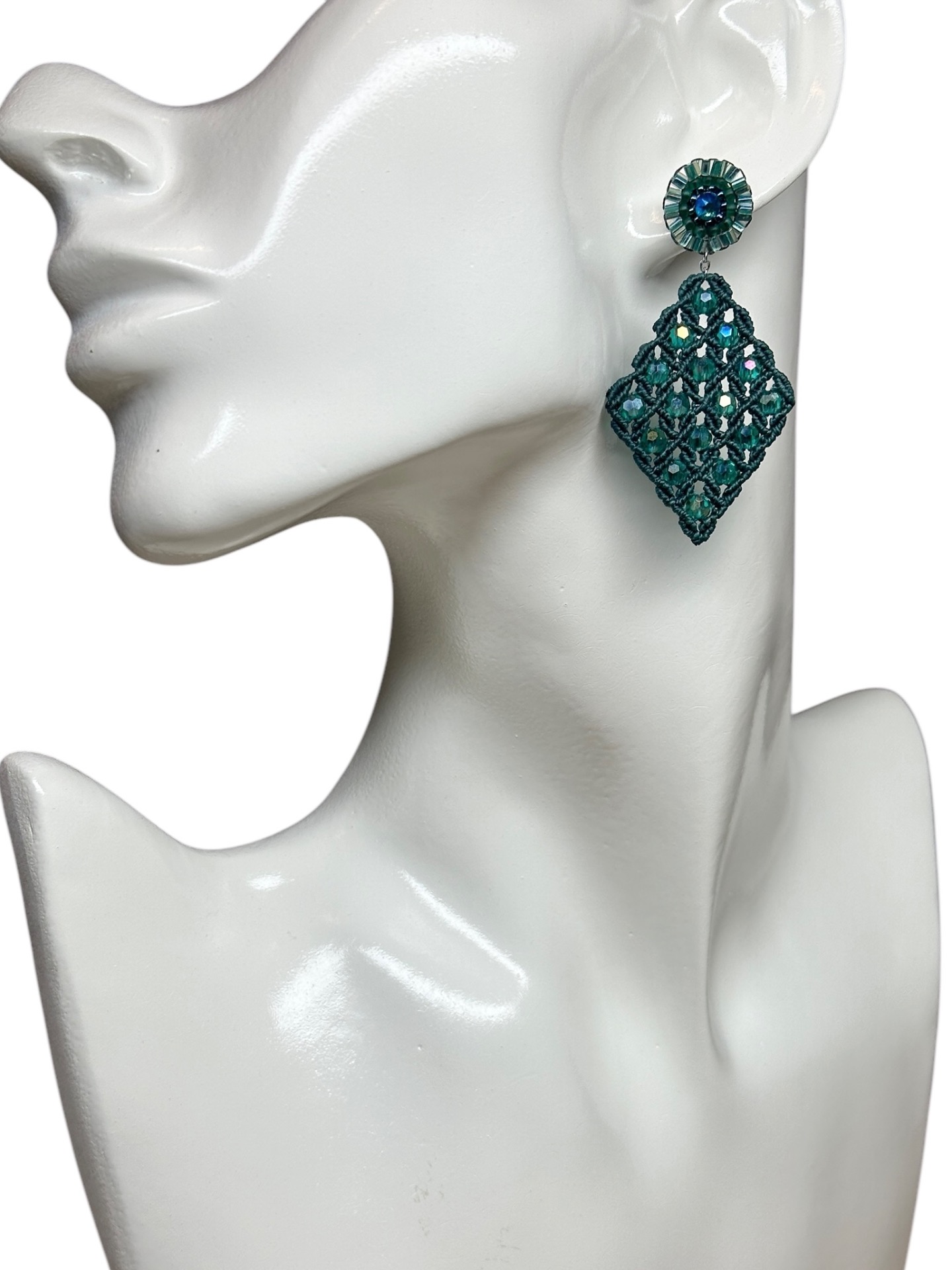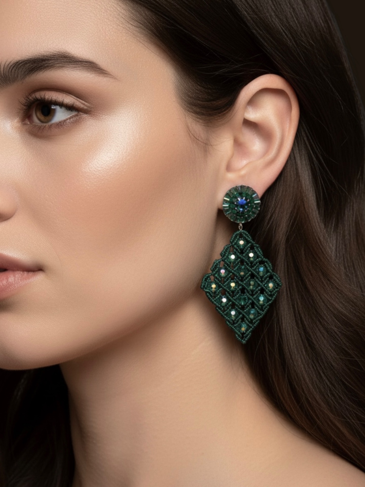 Material: Edelstahl, Silikon-Ohrringverschlüsse (10 mm Ø), Facettierte Glasperlen, Miyuki/Toho Perlen, Gewachstes Garn, Strasssteine