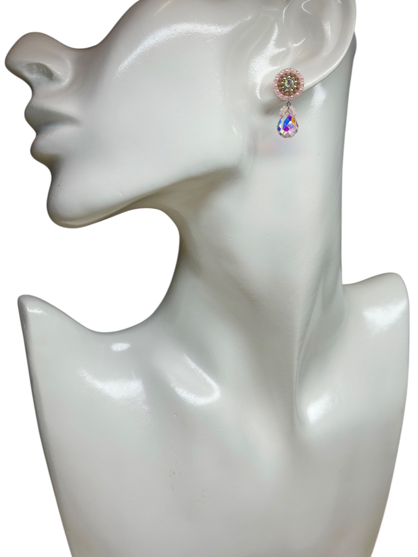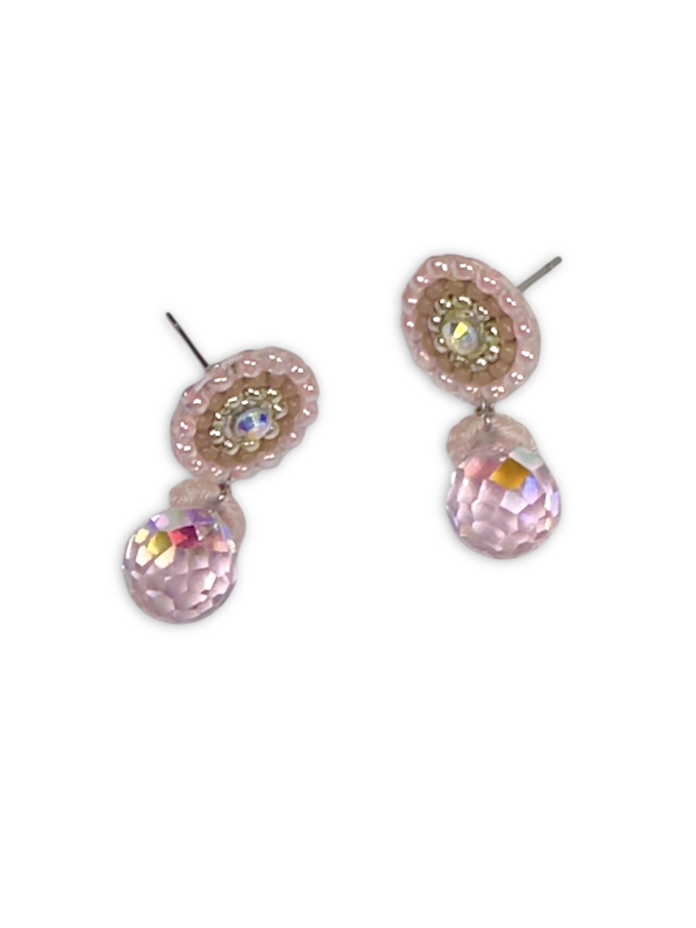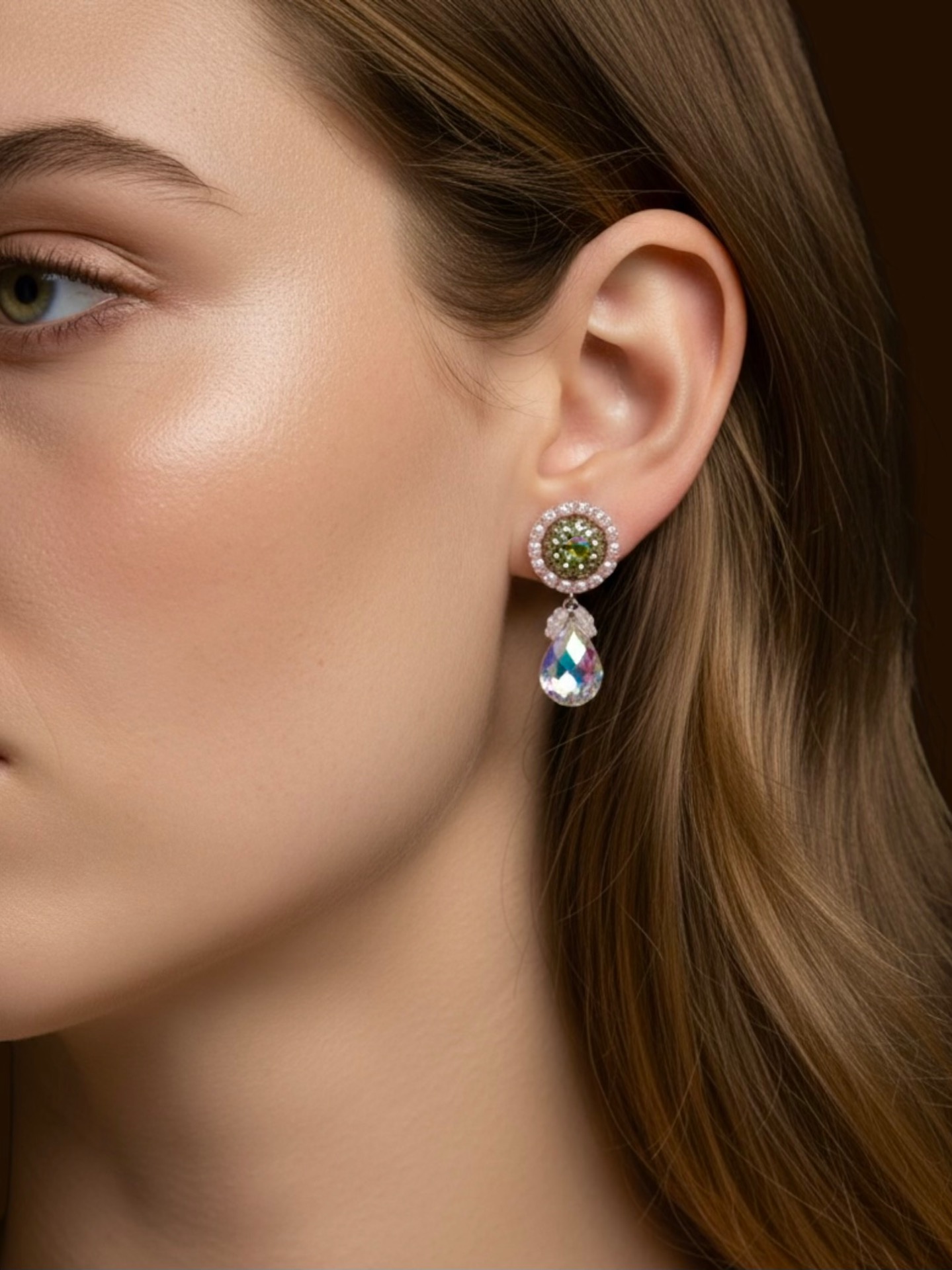 Material: Edelstahl, Silikon-Ohrringverschlüsse (10 mm Ø), Facettierte Glasperlen, Miyuki Perlen, Gewachstes Garn, Strasssteine