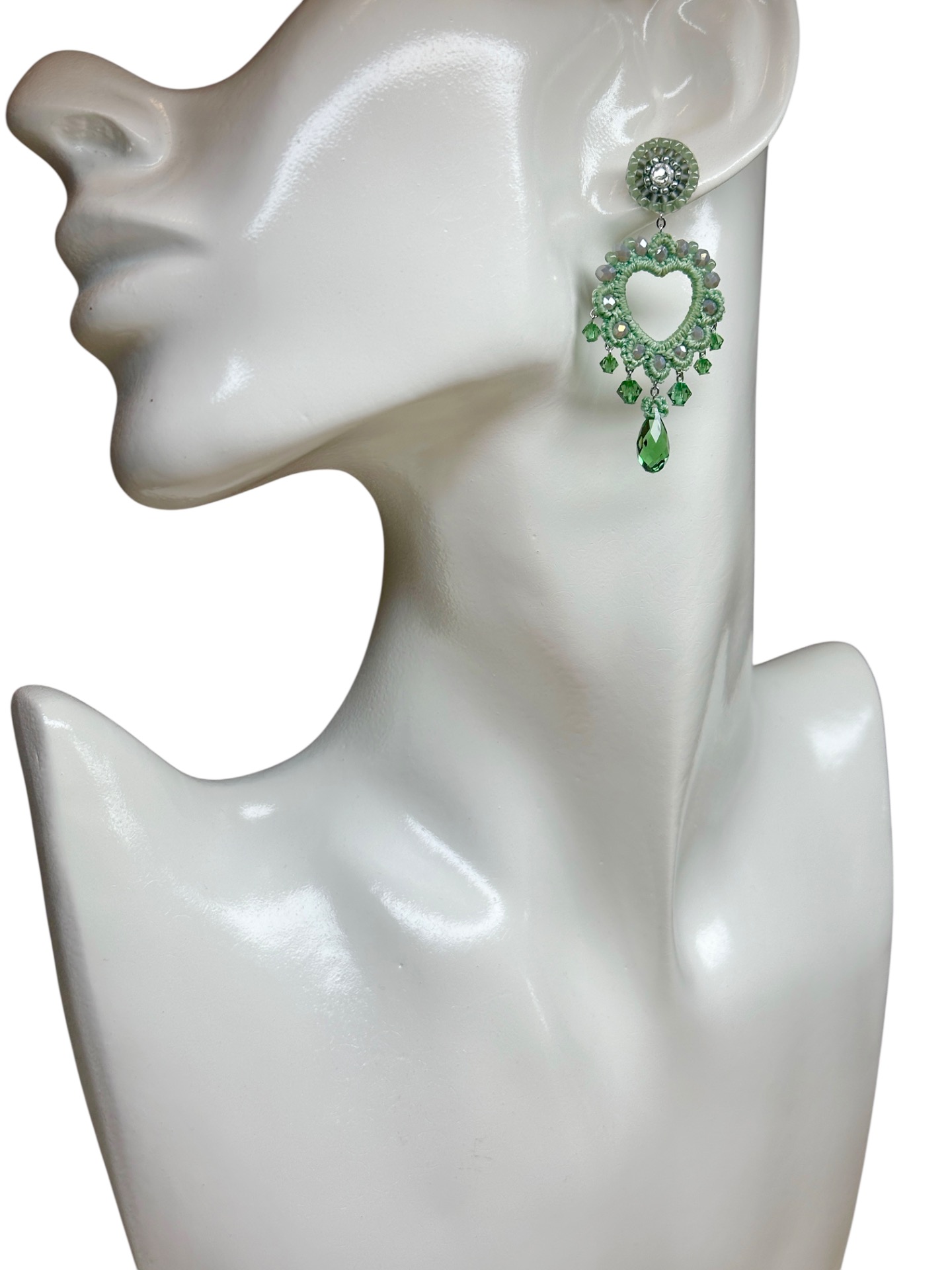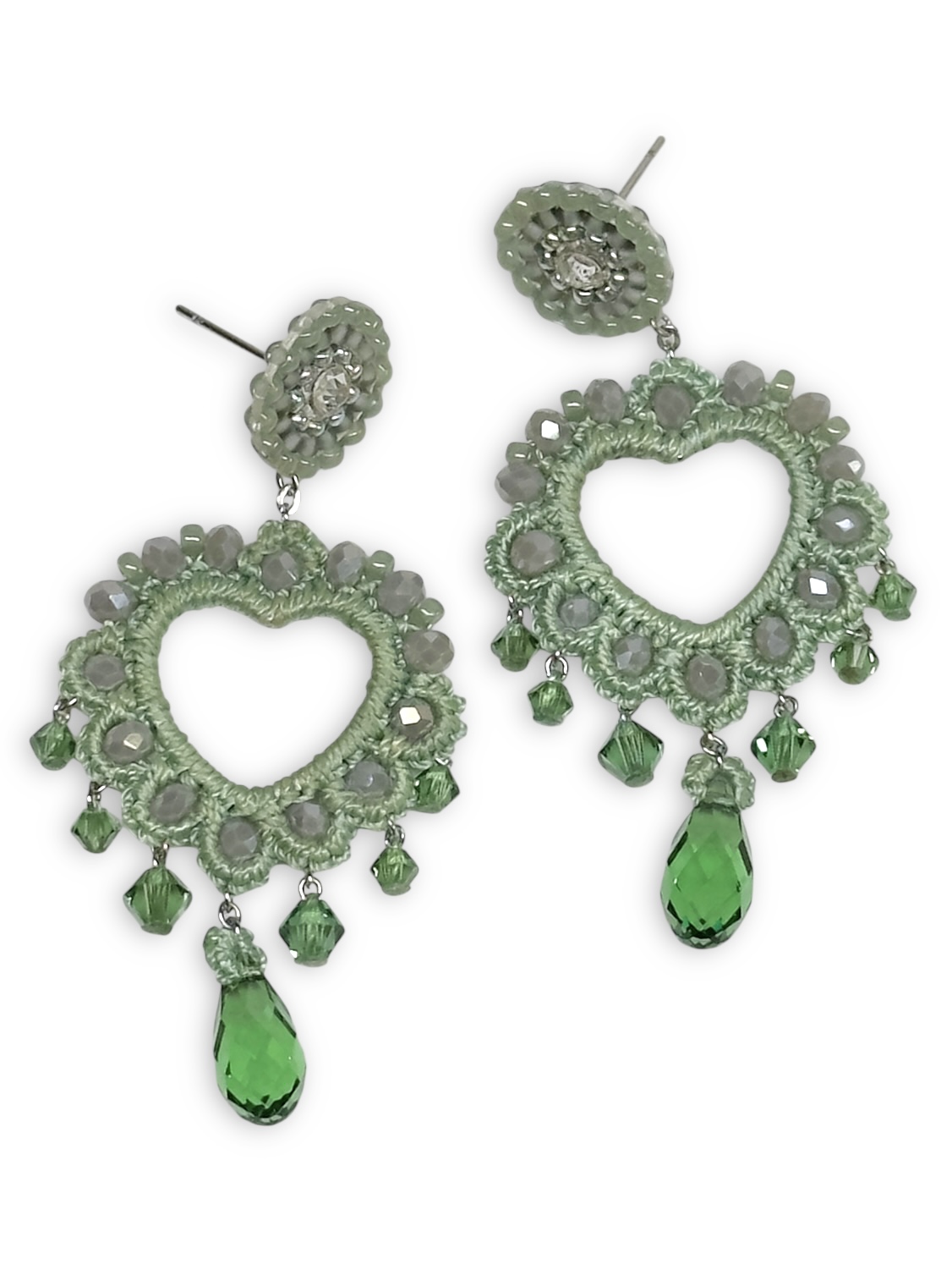 Material: Edelstahl, Silikon-Ohrringverschlüsse (10 mm Ø), Facettierte Glasperlen, Miyuki/Toho Perlen, Polyester Garn, Strasssteine