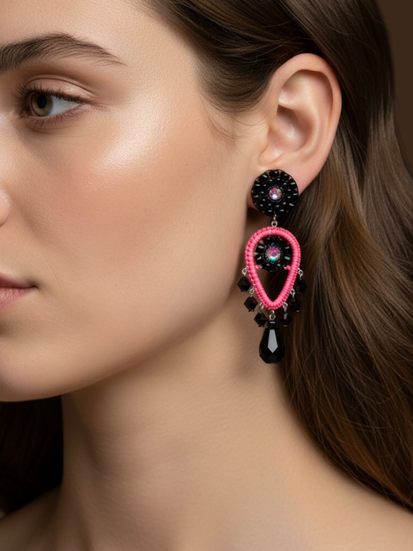 Material: Edelstahl, Silikon-Ohrringverschlüsse (10 mm Ø), Facettierte Glasperlen, Miyuki/Toho Perlen, Polyester Garn, Strasssteine