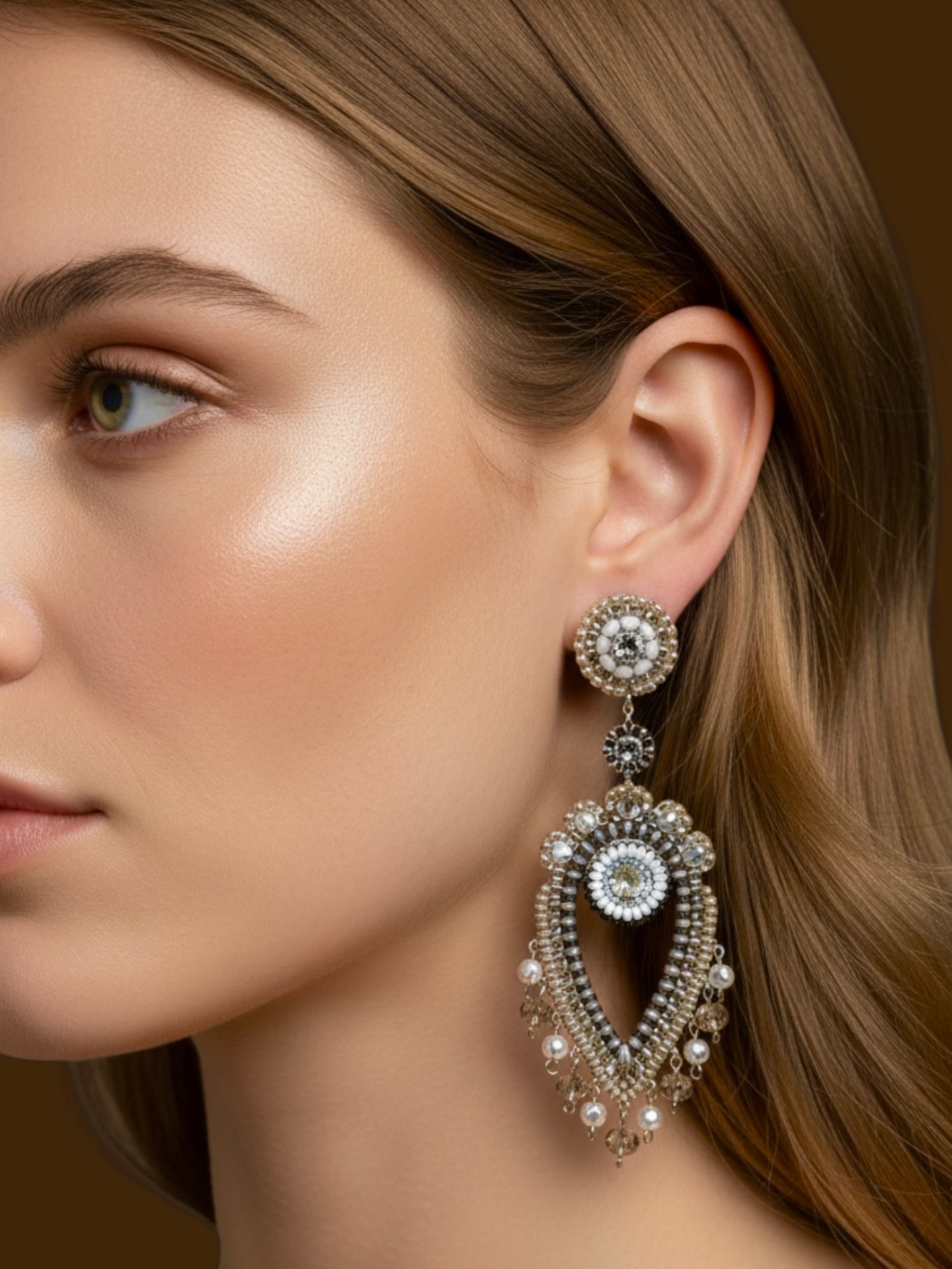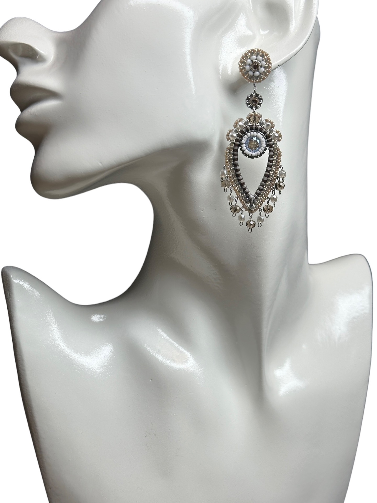 Material: Edelstahl, Silikon-Ohrringverschlüsse (10 mm Ø), Facettierte Glasperlen, Miyuki/Toho Perlen, Lederband, Strasssteine
