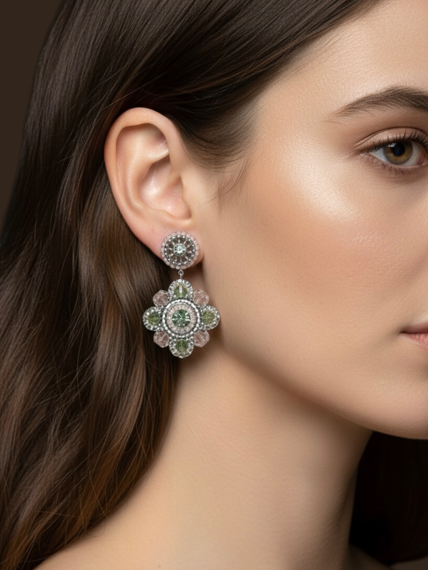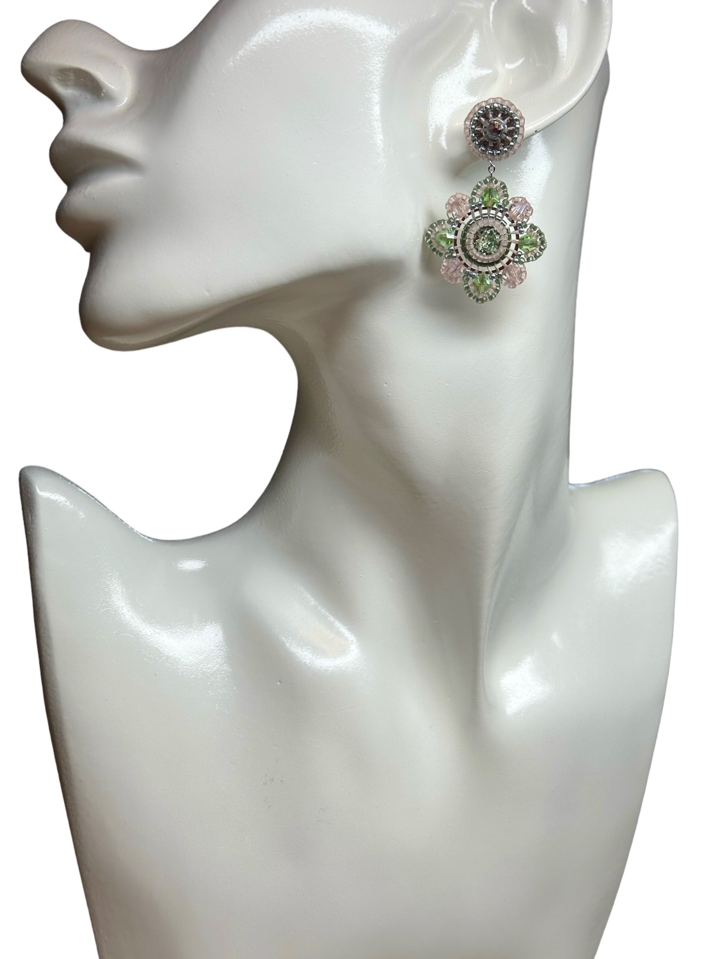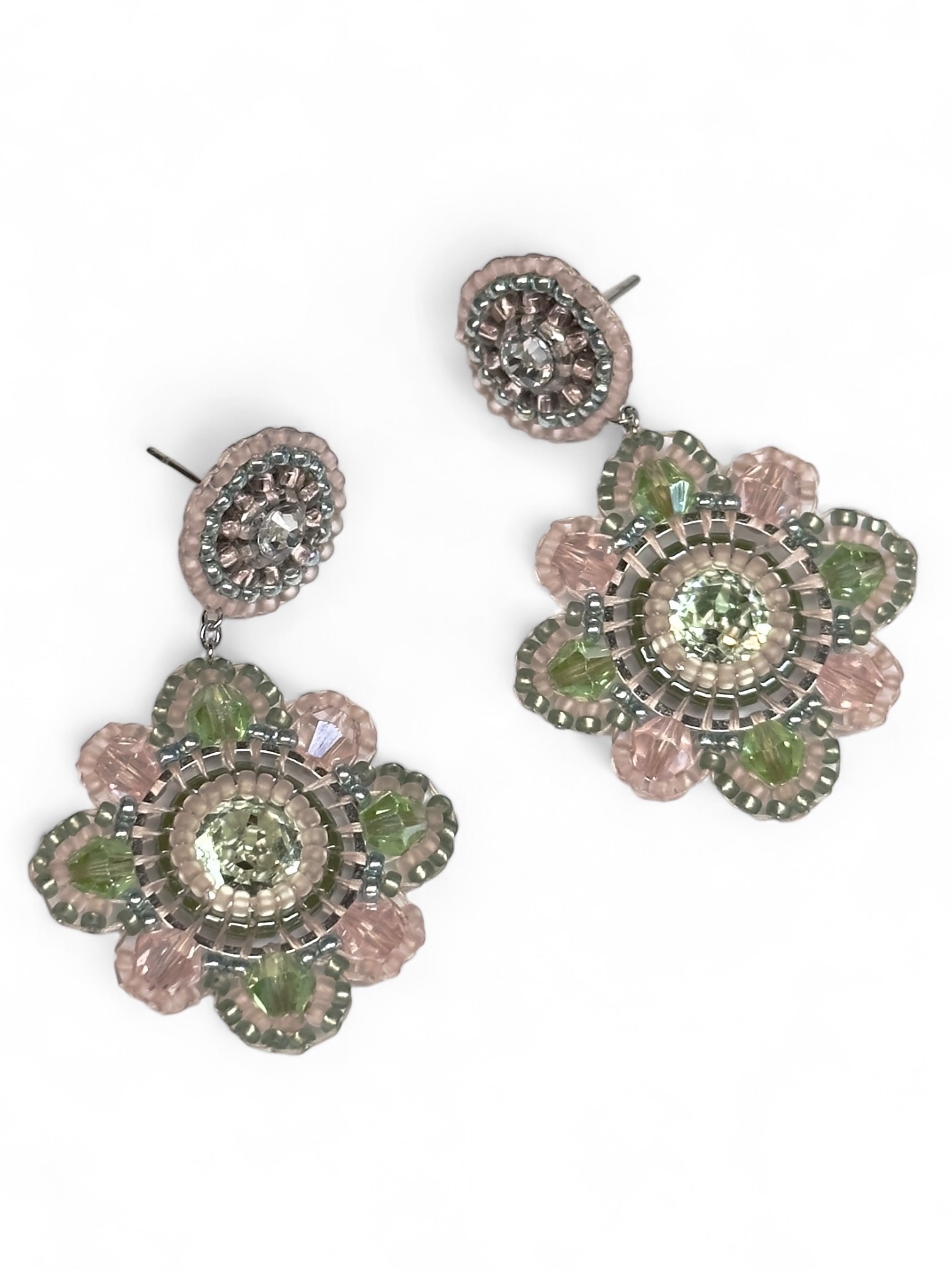 Material: Edelstahl, Silikon-Ohrringverschlüsse (10 mm Ø), Facettierte Glasperlen, Miyuki Perlen, Strasssteine